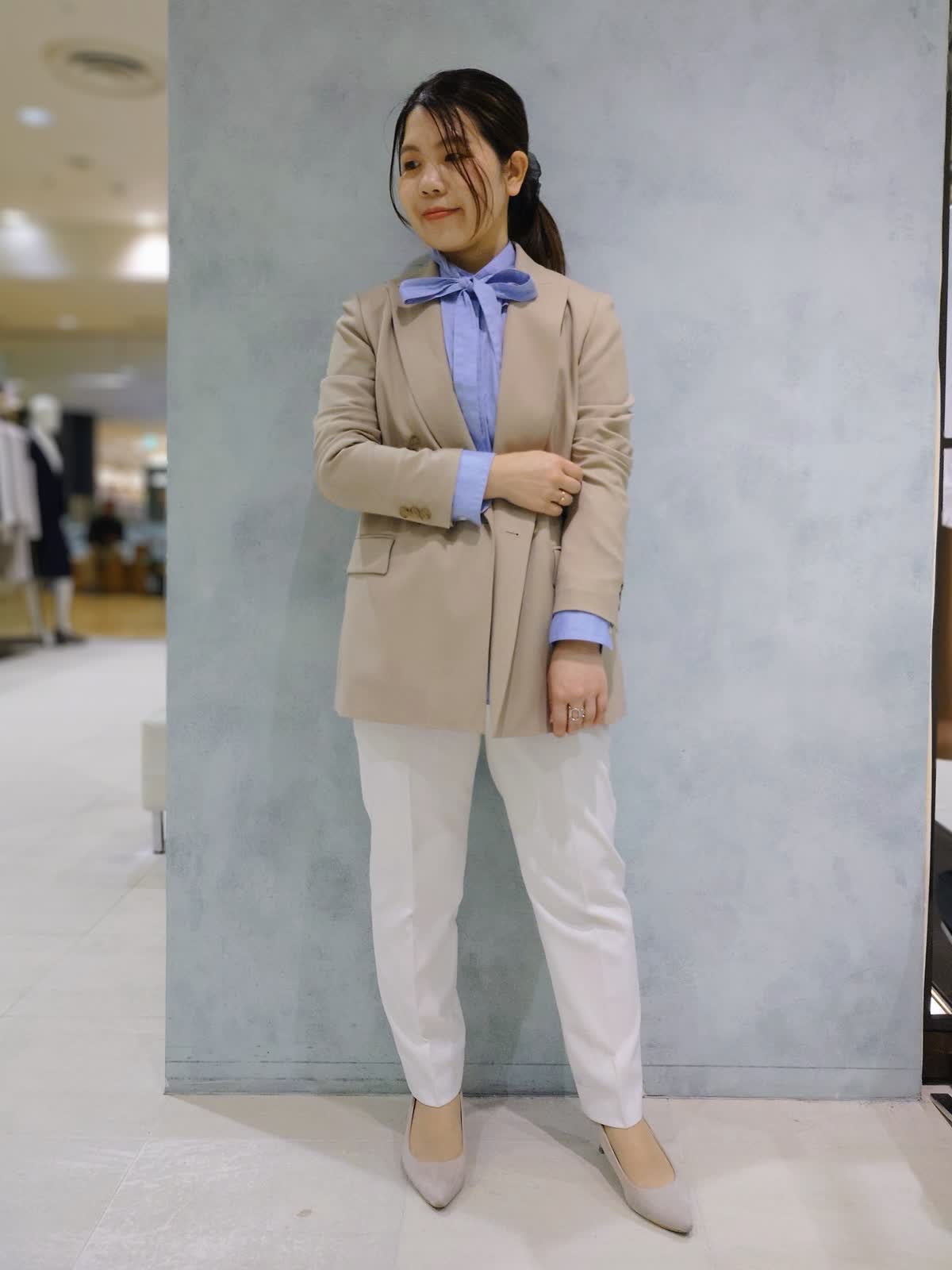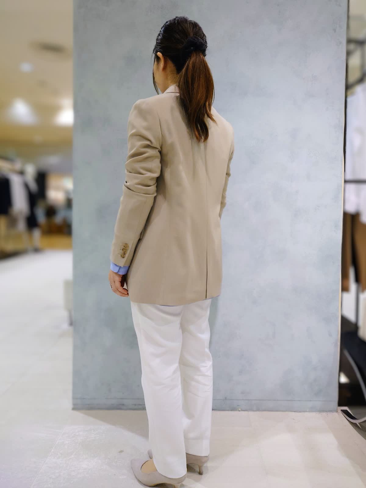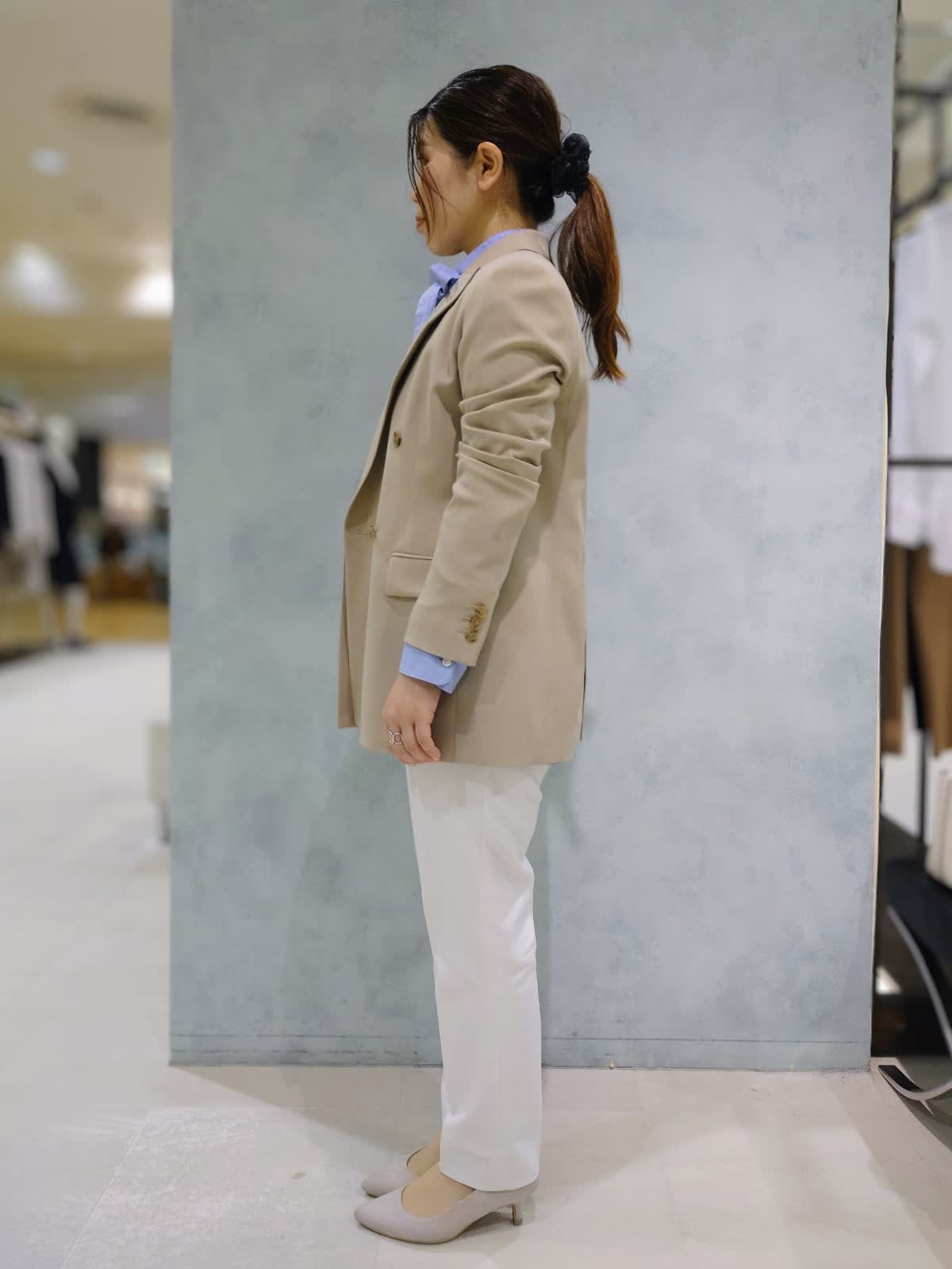 【着用サイズ】ジャケット:9号 ブラウス:フリー パンツ:7号 【着用カラー】ジャケット:ベージュ ブラウス:ブルー パンツ:オフホワイト 程よくきちんと感をプラスするジャケットスタイル。 爽やかなブルーシャツと合わせて軽やかに、テーパードパンツですっきりとした印象に。通勤からお出かけまで幅広く着回していただけます。