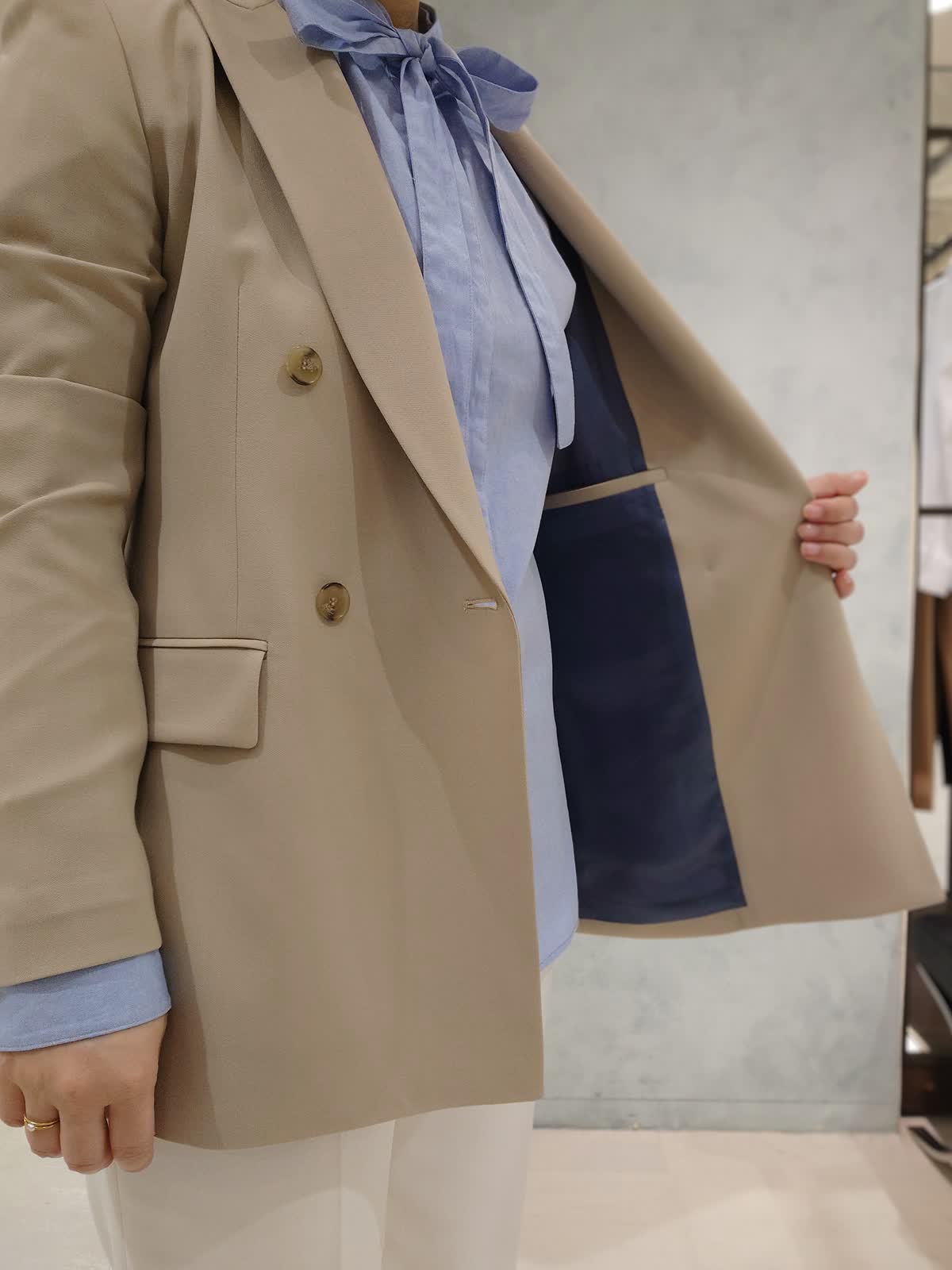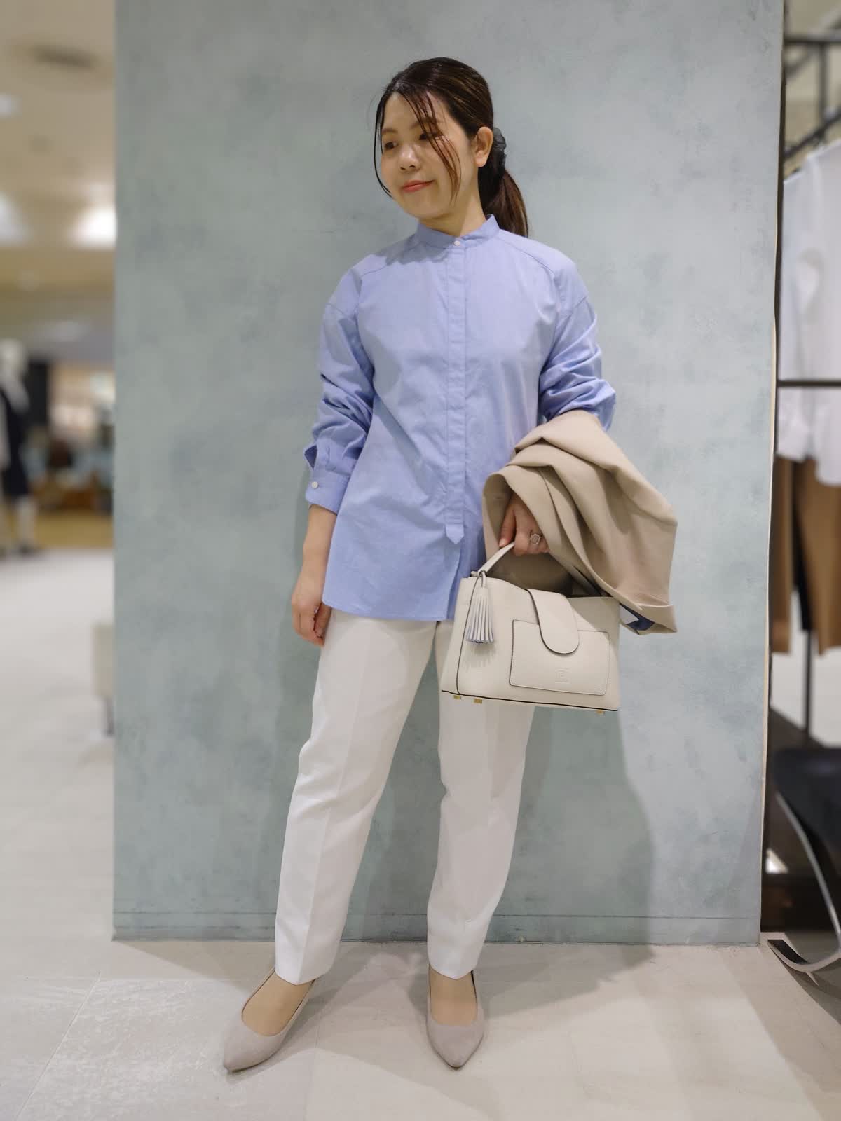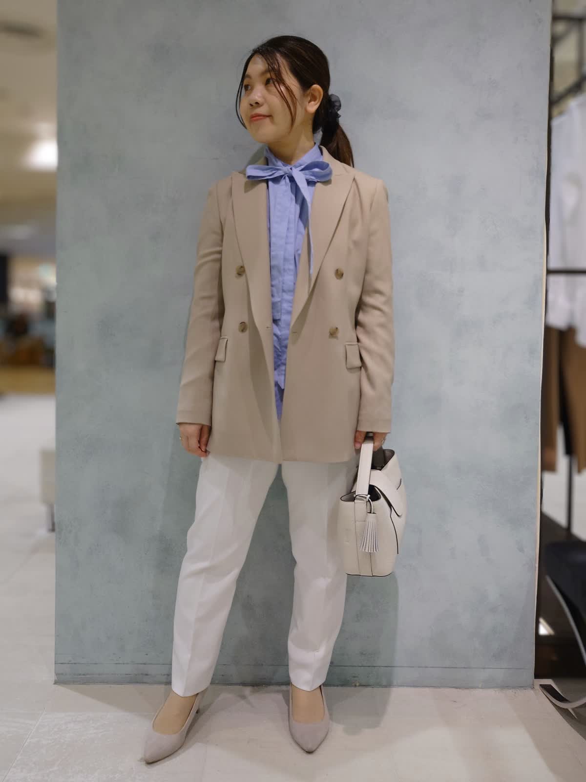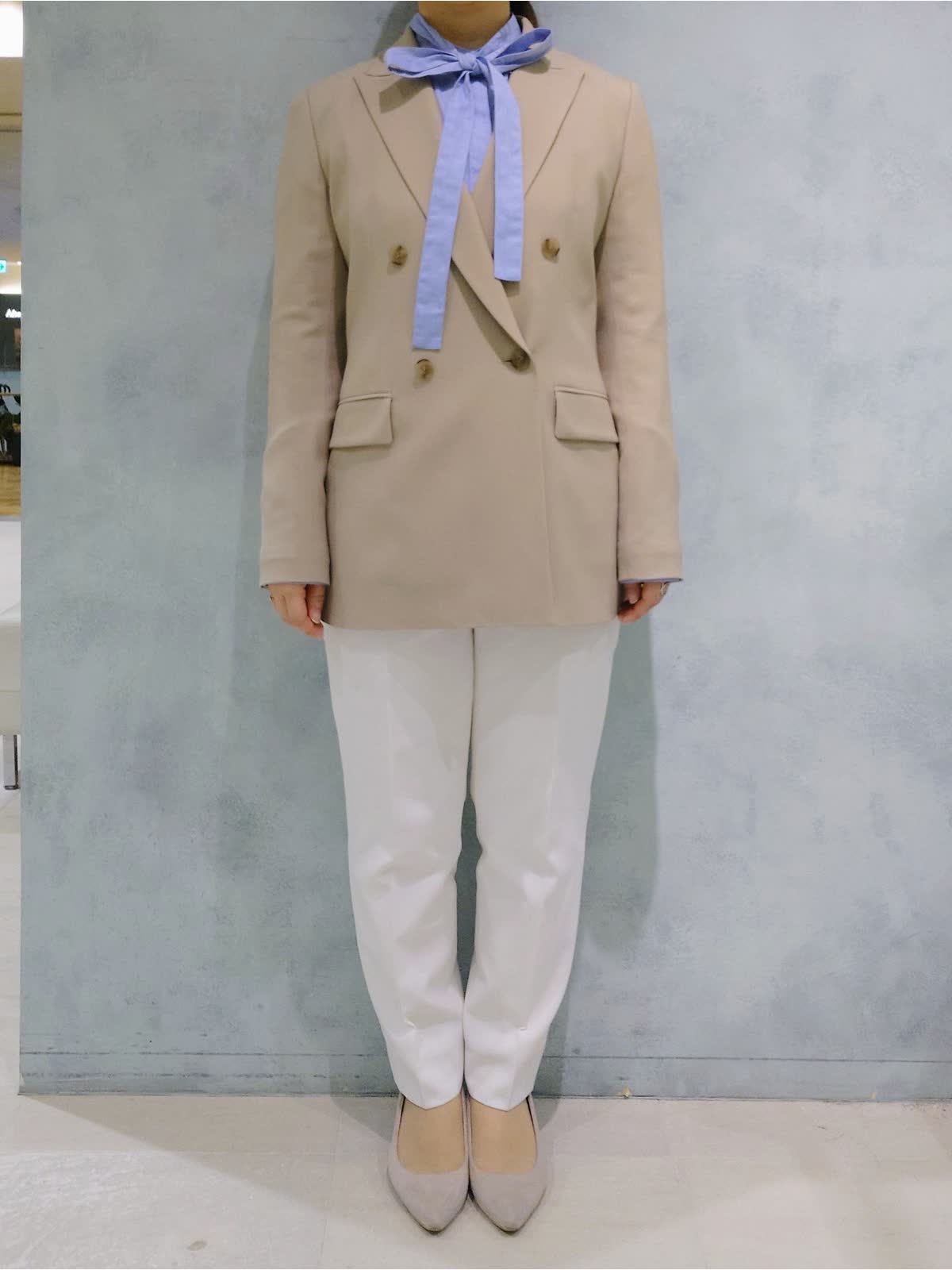 【着用サイズ】ジャケット:9号 ブラウス:フリー パンツ:7号 【着用カラー】ジャケット:ベージュ ブラウス:ブルー パンツ:オフホワイト 程よくきちんと感をプラスするジャケットスタイル。 爽やかなブルーシャツと合わせて軽やかに、テーパードパンツですっきりとした印象に。通勤からお出かけまで幅広く着回していただけます。