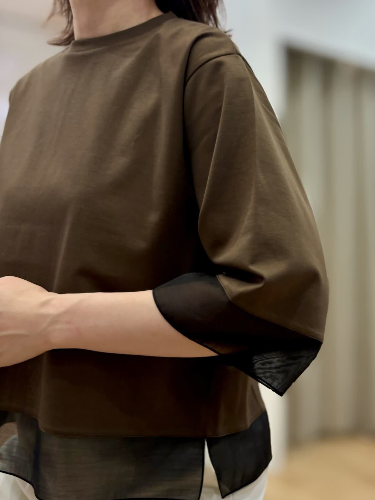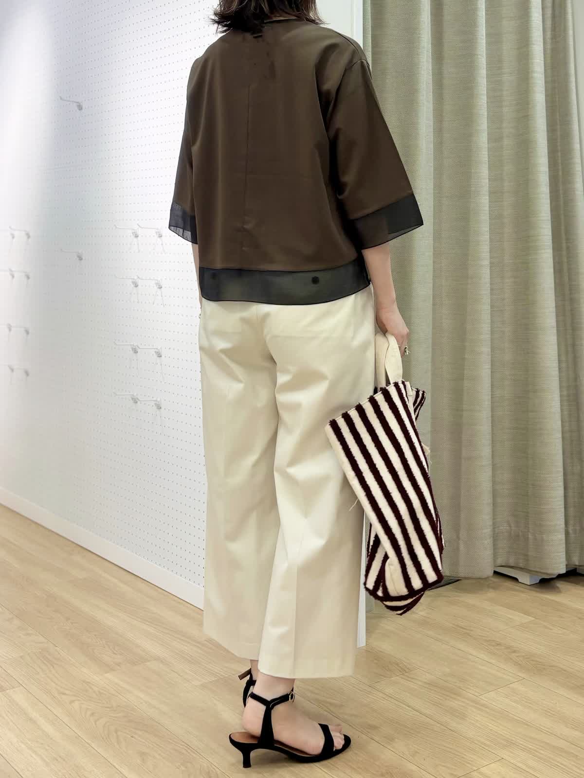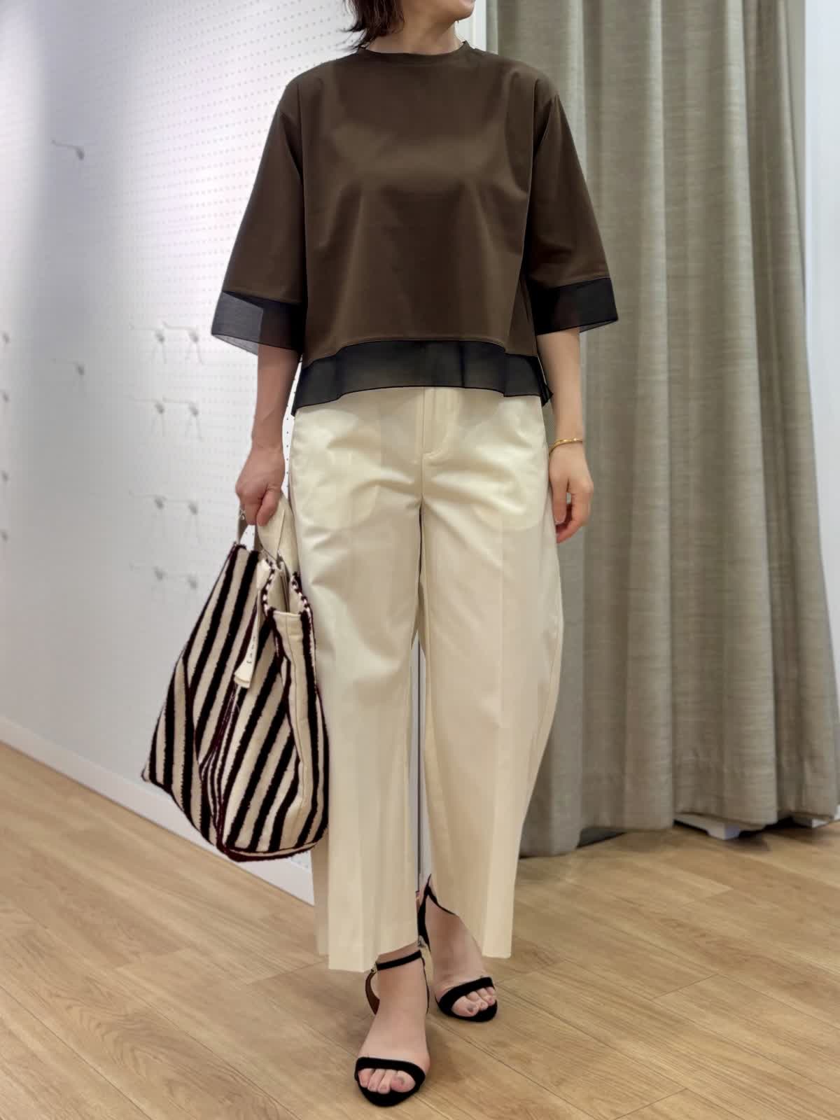 【着用カラー/サイズ】 カットソー:ダークブラウン/フリー パンツ:オフホワイト/11号 オフィスカジュアルコーデ。コットン100%なのに程良いハリ感とツヤ感のあるカットソーだからカジュアル過ぎずデイリー使いにオススメです。接触冷感、UV加工と機能性も面もあり日除けとしても真夏もずっと着られます。