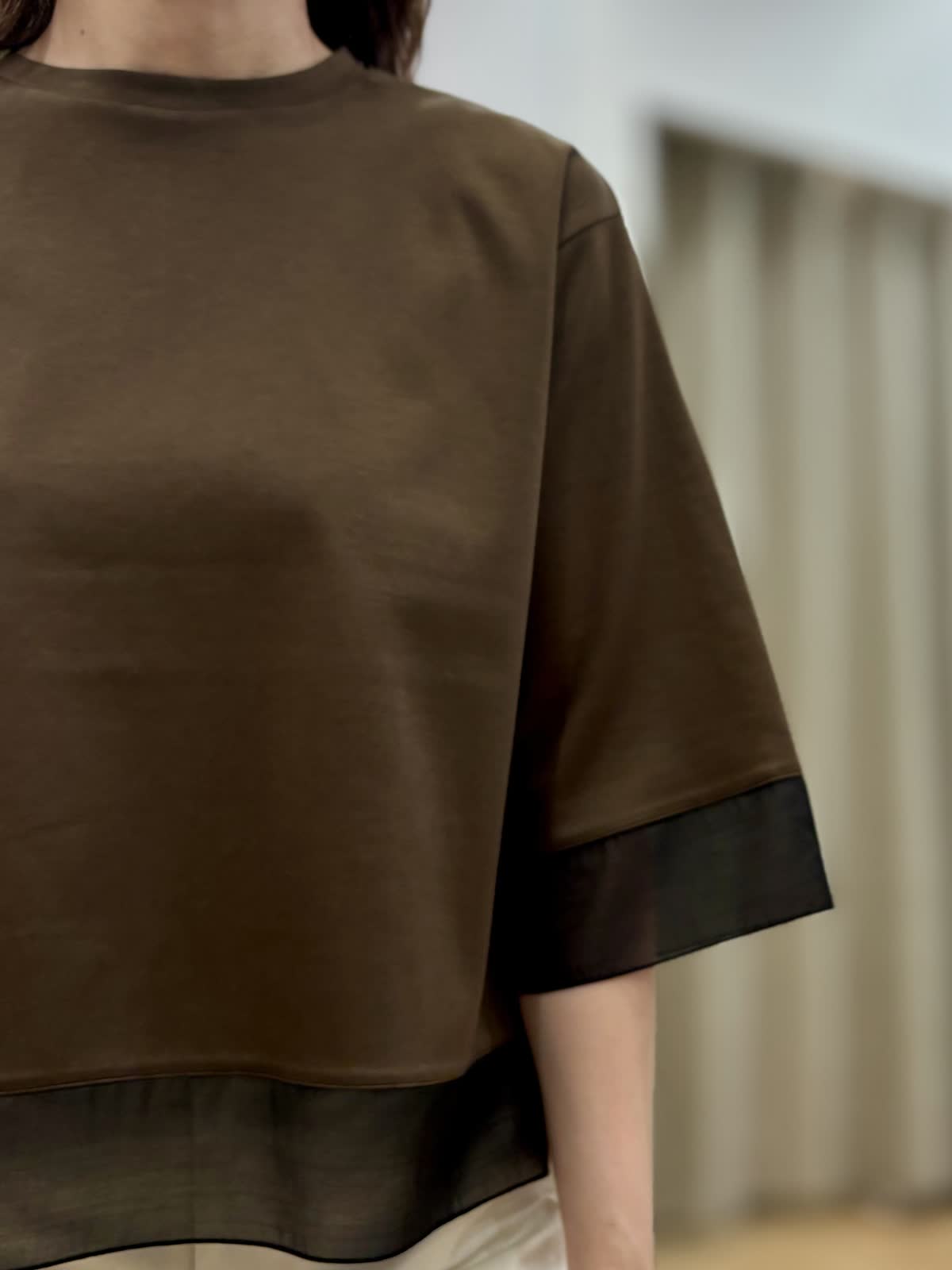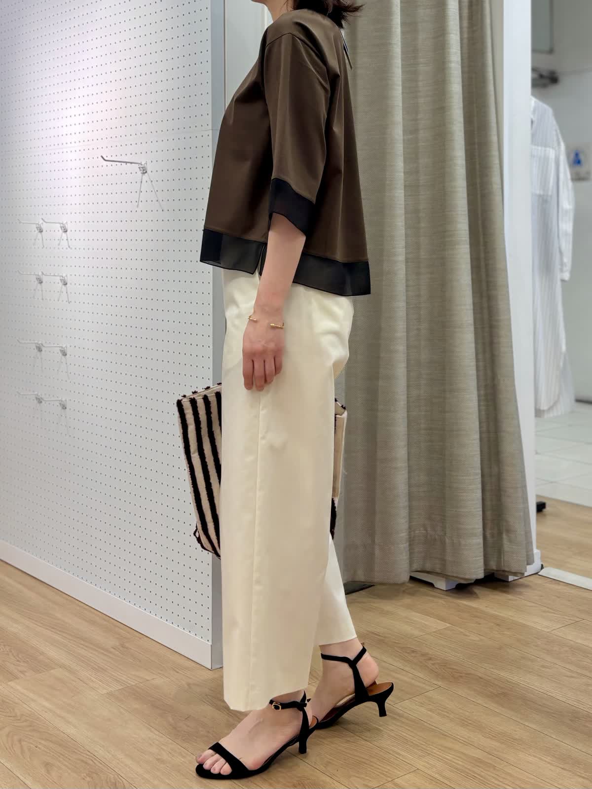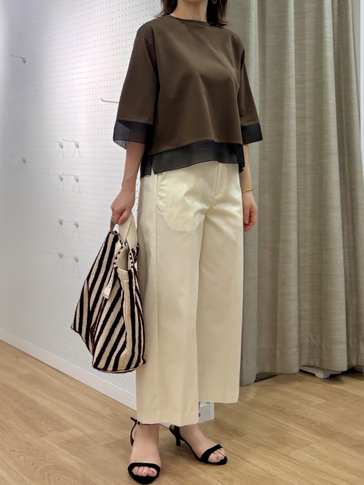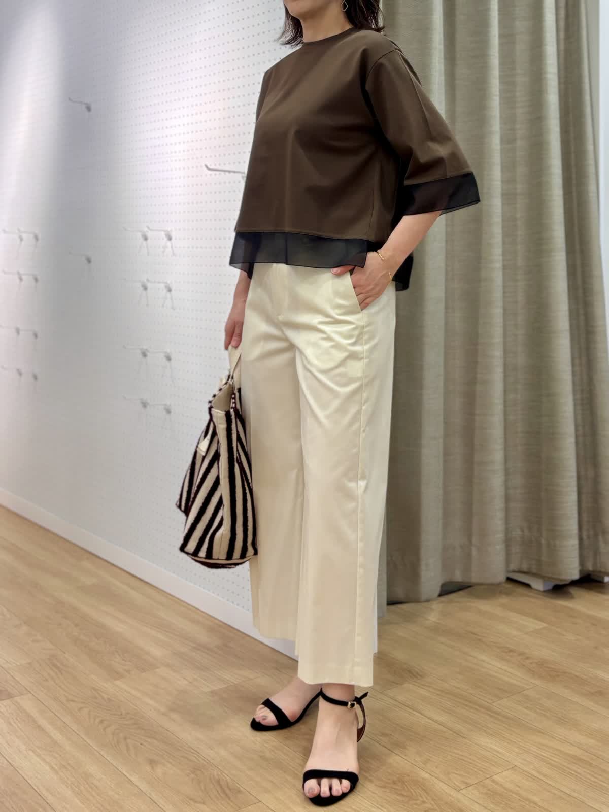 【着用カラー/サイズ】 カットソー:ダークブラウン/フリー パンツ:オフホワイト/11号 オフィスカジュアルコーデ。コットン100%なのに程良いハリ感とツヤ感のあるカットソーだからカジュアル過ぎずデイリー使いにオススメです。接触冷感、UV加工と機能性も面もあり日除けとしても真夏もずっと着られます。