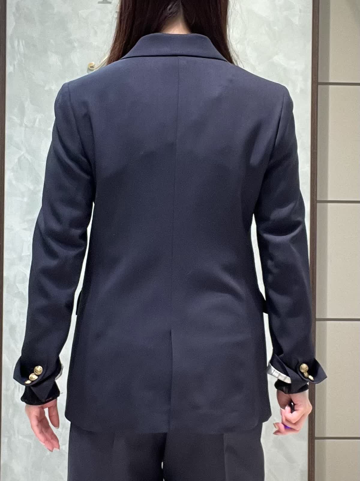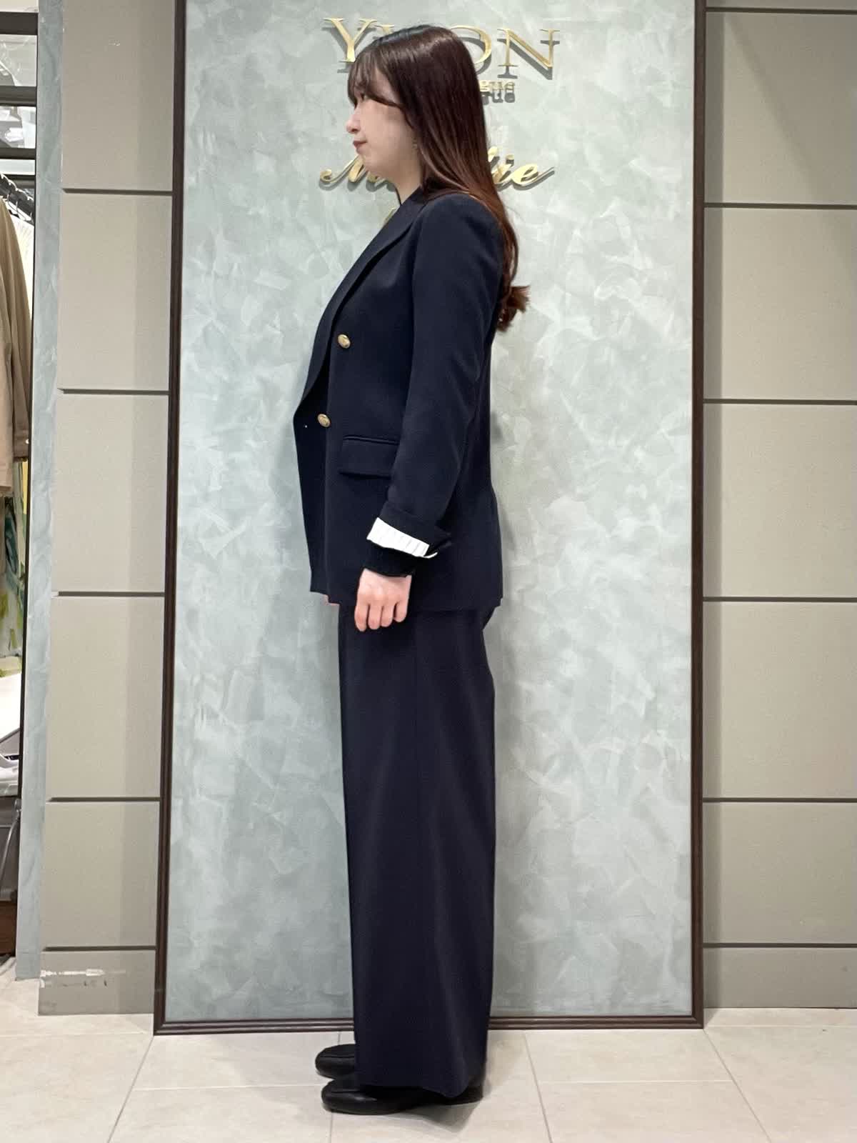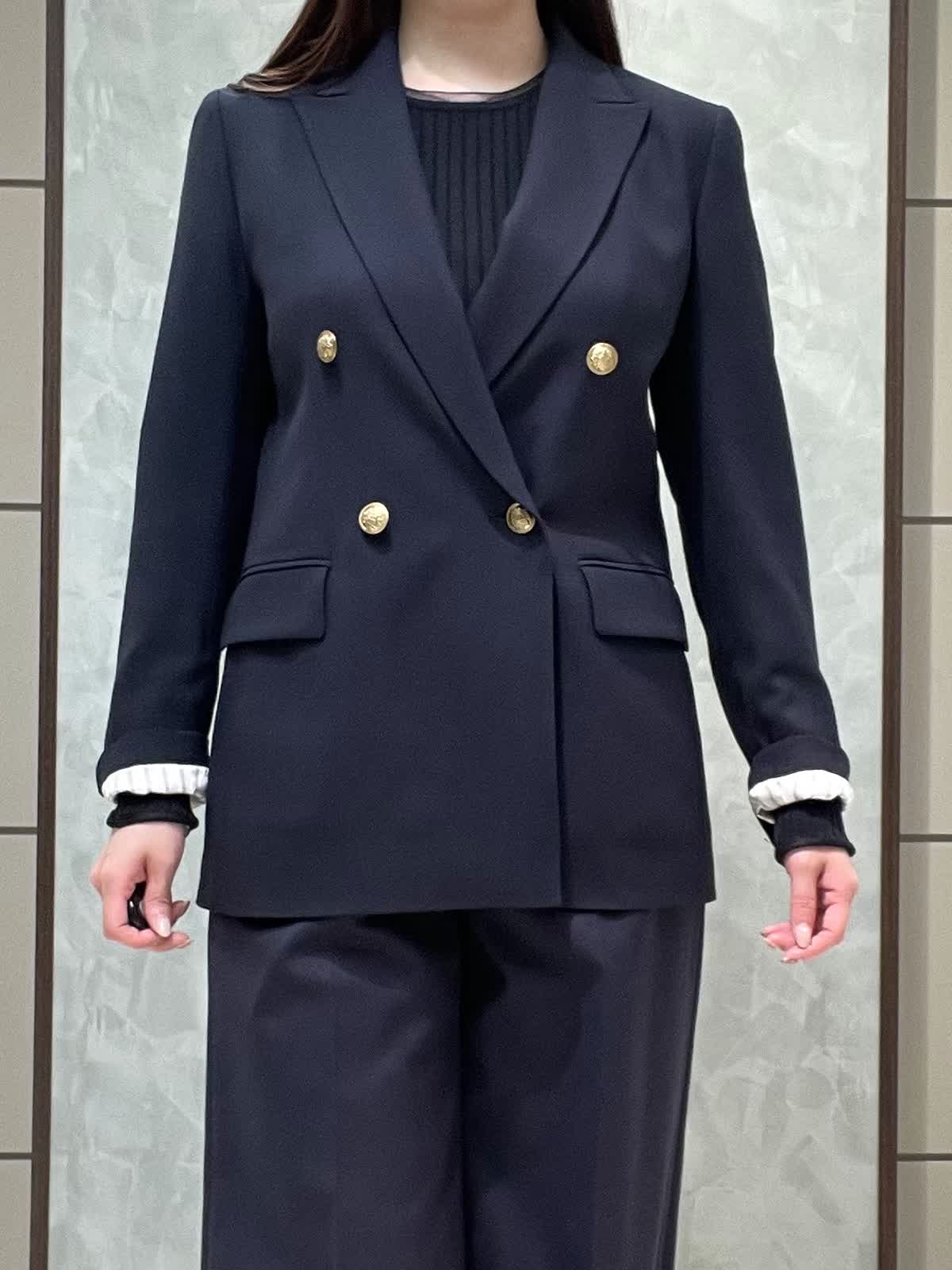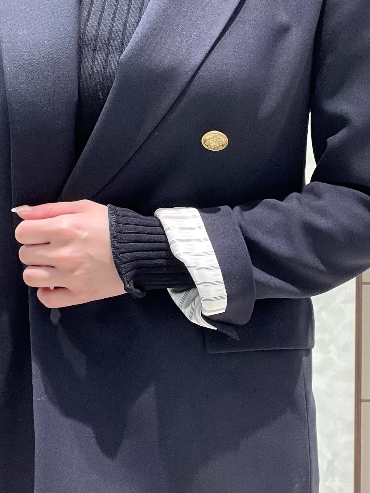 【着用サイズ】ジャケット:7号 ニット:9号 パンツ:7号 通勤、オフィススタイリングです。ネイビージャケット1着あると、流行に左右されることなく長く着用できます。ゆったりしたシルエットではなく、肩位置ジャスト、お袖の筒幅もタイトすぎないですがゆったりもしていないです。ウエストがシェイプされているので、着丈はヒップかかる程ですがバランスが良く、すっきり見えます。肩パット入り、見頃内ポケット付きです。裏地がストライプなので折って着ることでカジュアルダウンして普段のアウターとしても◎ ニットは、しっかり伸びるリブが身体に優しくフィットし、ボディラインを綺麗に見せてくれます。首元とお袖口がシアーでインナー使いはもちろん、1枚で着やすいです。パンツは綿麻混で清涼感がありながら、シワになりにくく、速乾性もあります。太すぎないセミワイドシルエットで美脚見えします。後ろゴム、ベルトループ付き、ポケット付きです。着丈は157センチで足の甲にかからないくらいです。