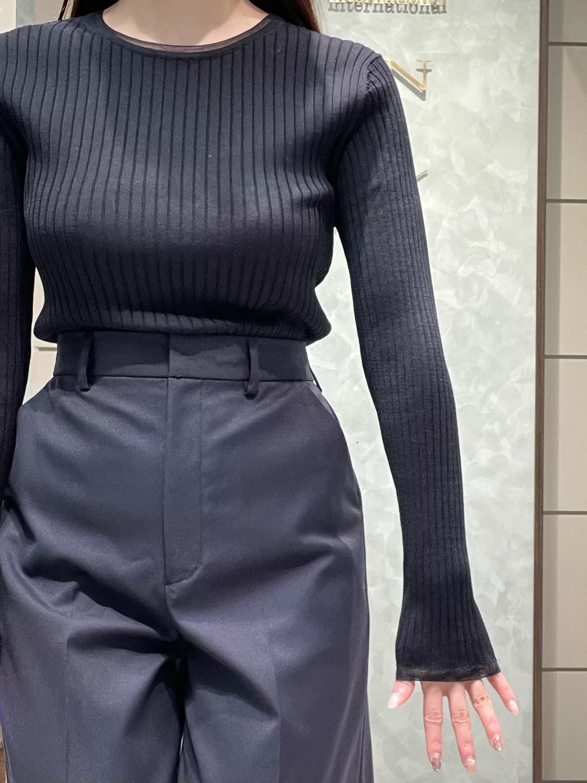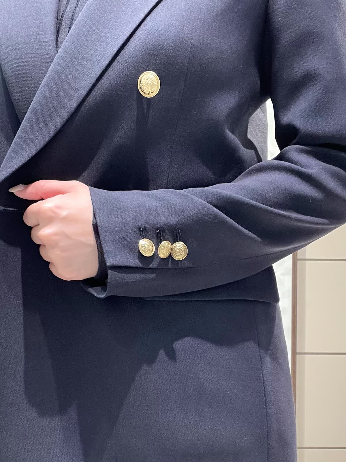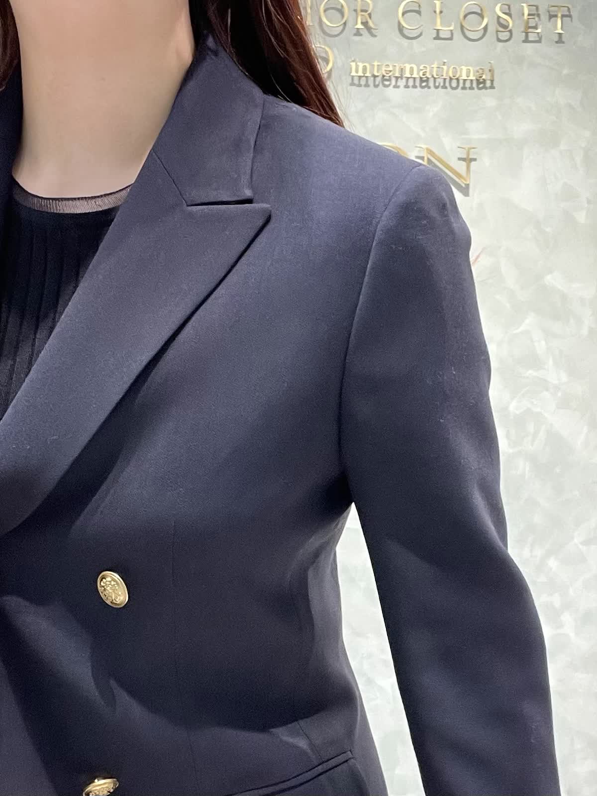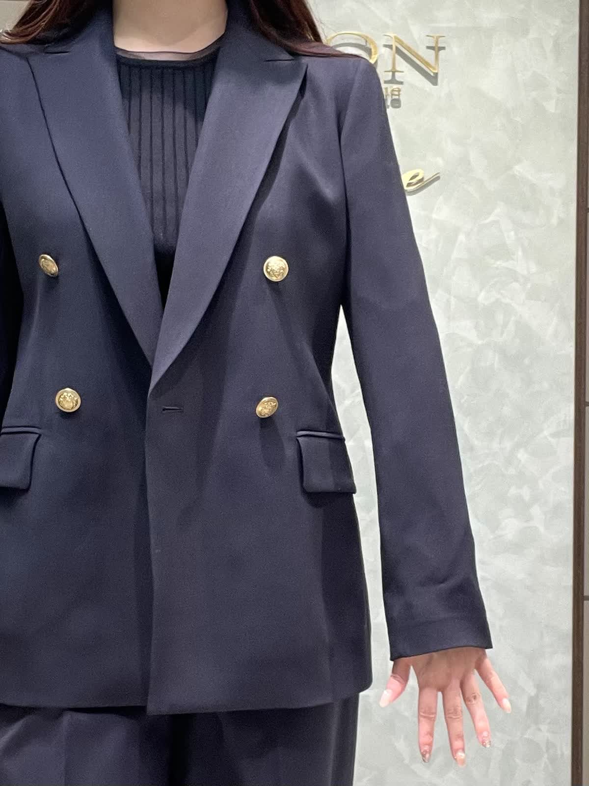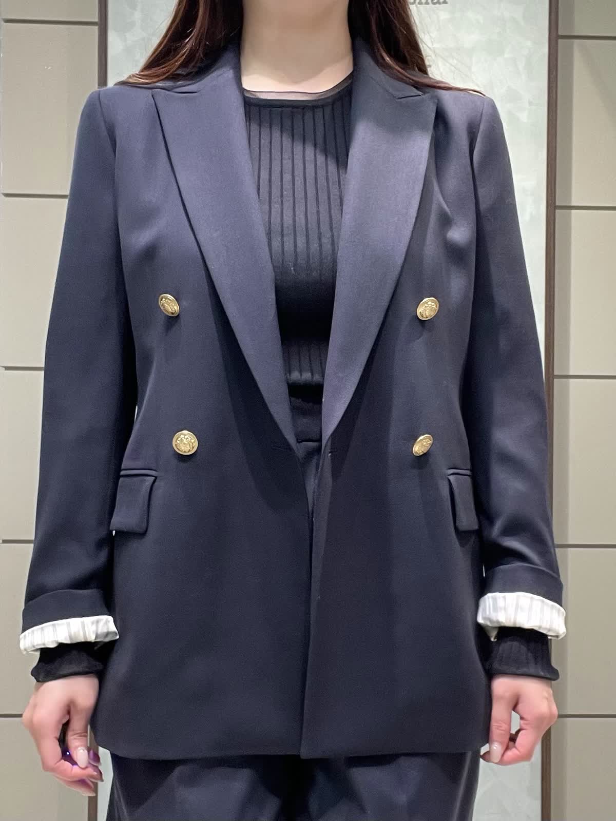 【着用サイズ】ジャケット:7号 ニット:9号 パンツ:7号 通勤、オフィススタイリングです。ネイビージャケット1着あると、流行に左右されることなく長く着用できます。ゆったりしたシルエットではなく、肩位置ジャスト、お袖の筒幅もタイトすぎないですがゆったりもしていないです。ウエストがシェイプされているので、着丈はヒップかかる程ですがバランスが良く、すっきり見えます。肩パット入り、見頃内ポケット付きです。裏地がストライプなので折って着ることでカジュアルダウンして普段のアウターとしても◎ ニットは、しっかり伸びるリブが身体に優しくフィットし、ボディラインを綺麗に見せてくれます。首元とお袖口がシアーでインナー使いはもちろん、1枚で着やすいです。パンツは綿麻混で清涼感がありながら、シワになりにくく、速乾性もあります。太すぎないセミワイドシルエットで美脚見えします。後ろゴム、ベルトループ付き、ポケット付きです。着丈は157センチで足の甲にかからないくらいです。