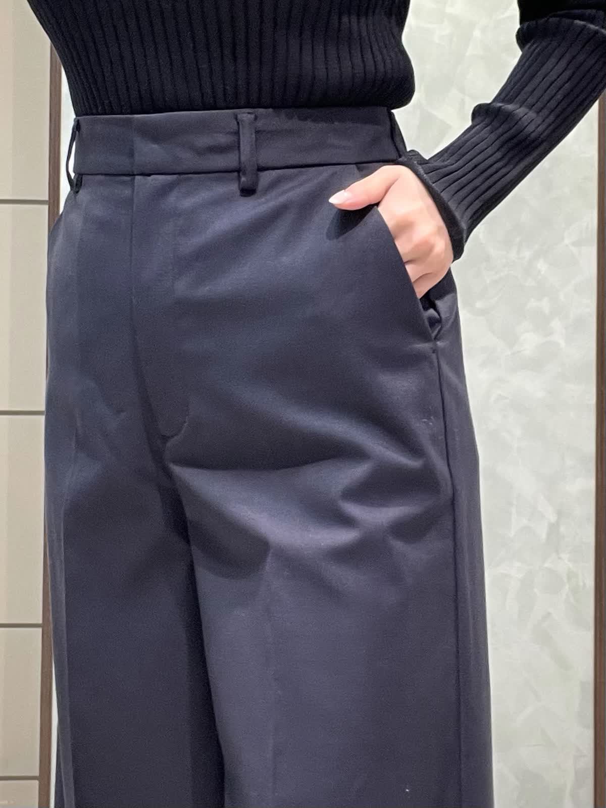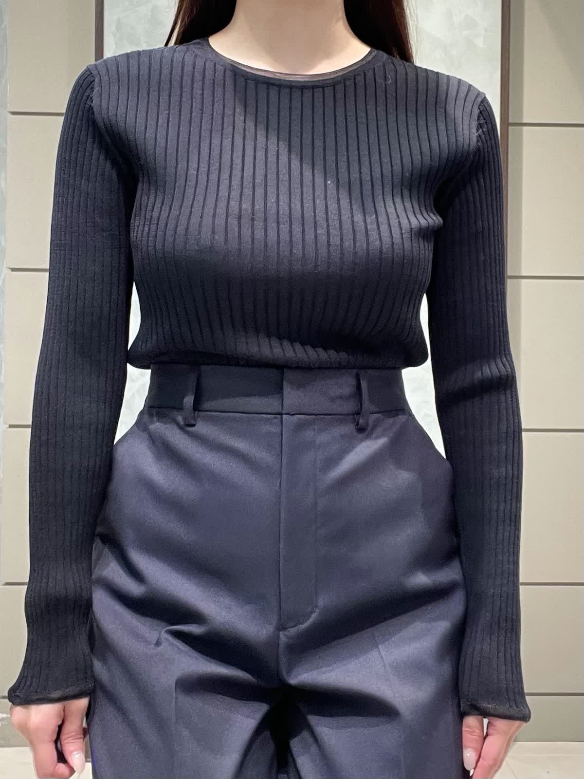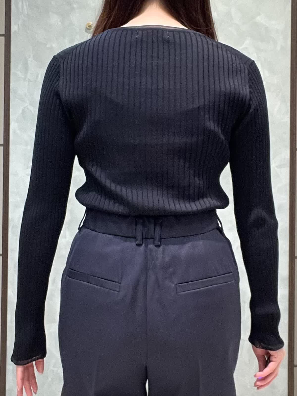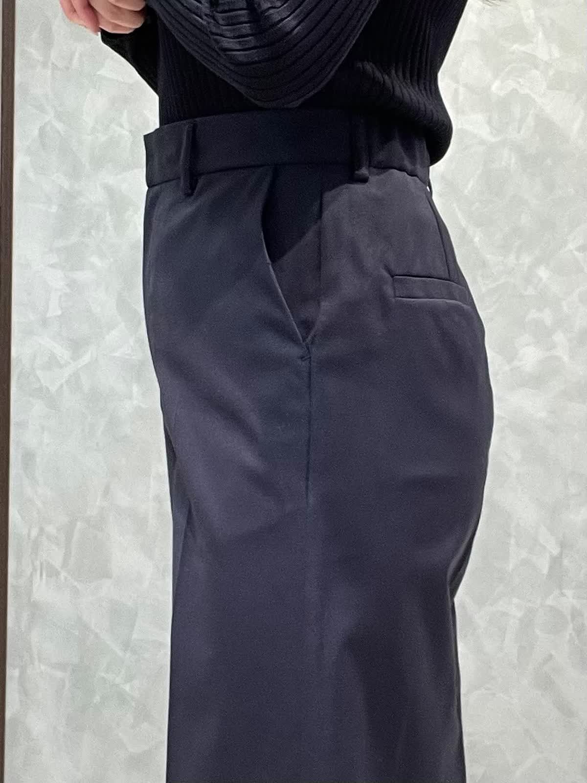 【着用サイズ】ジャケット:7号 ニット:9号 パンツ:7号 通勤、オフィススタイリングです。ネイビージャケット1着あると、流行に左右されることなく長く着用できます。ゆったりしたシルエットではなく、肩位置ジャスト、お袖の筒幅もタイトすぎないですがゆったりもしていないです。ウエストがシェイプされているので、着丈はヒップかかる程ですがバランスが良く、すっきり見えます。肩パット入り、見頃内ポケット付きです。裏地がストライプなので折って着ることでカジュアルダウンして普段のアウターとしても◎ ニットは、しっかり伸びるリブが身体に優しくフィットし、ボディラインを綺麗に見せてくれます。首元とお袖口がシアーでインナー使いはもちろん、1枚で着やすいです。パンツは綿麻混で清涼感がありながら、シワになりにくく、速乾性もあります。太すぎないセミワイドシルエットで美脚見えします。後ろゴム、ベルトループ付き、ポケット付きです。着丈は157センチで足の甲にかからないくらいです。