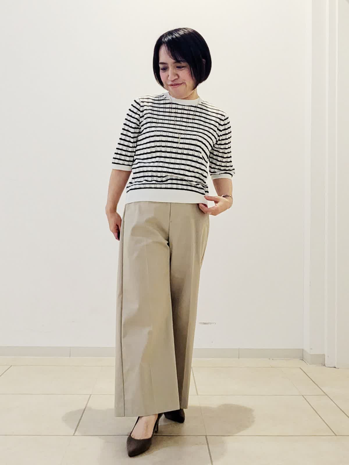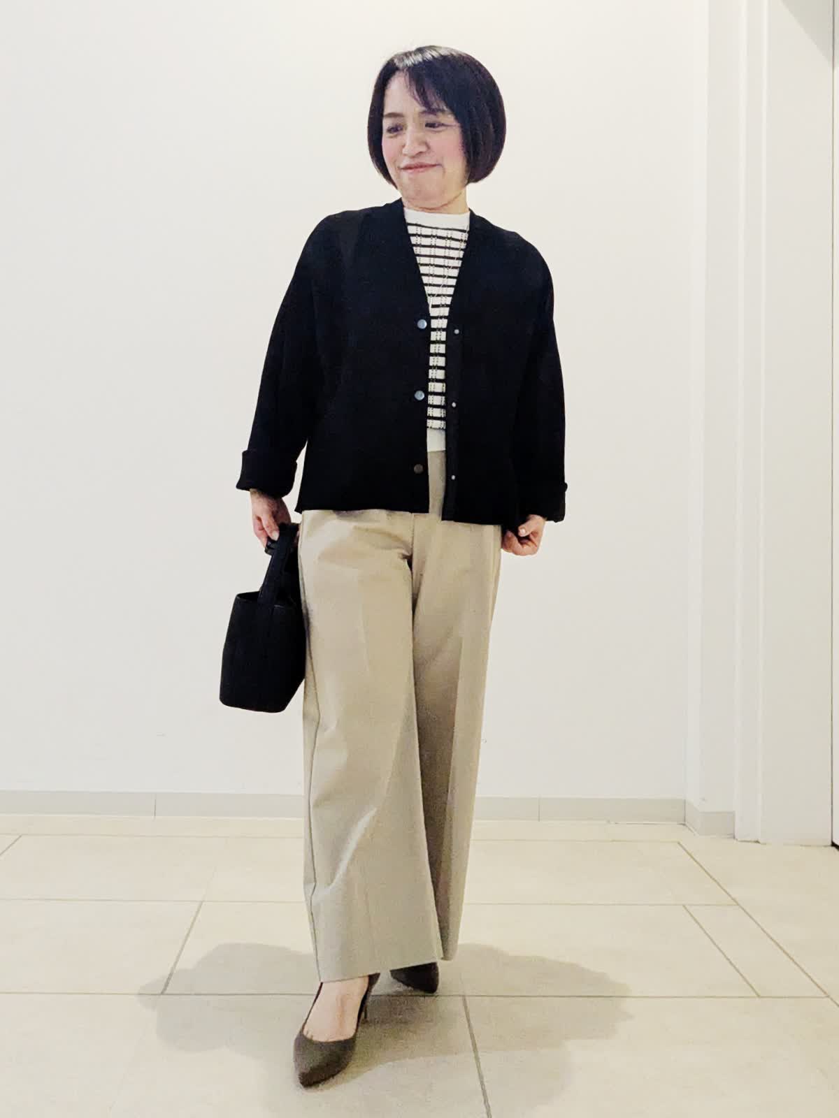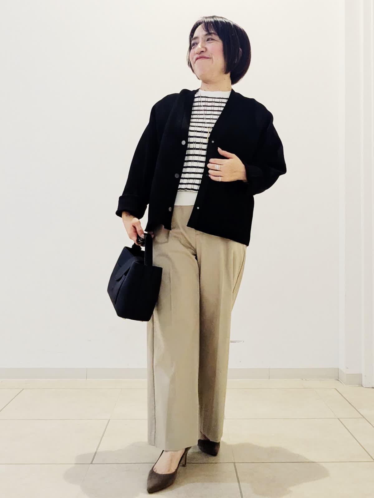 【着用サイズ】カーディガン:フリー ニット:フリー パンツ:9号【着用カラー】カーディガン:ブラック ニット:ボーダー パンツ:キャメル 春のお仕事コーデです。 黒色のカーディガンはお仕事の必需品ですよね。ドルマンスリーブなのでインナーのデザインに関係なく羽織っていただけます。インナーの5分袖ニットは袖が長めなので1枚でも安心です。どちらも着回しがきくので、他のものと組み合わせていろいろな感じをお楽しみください!