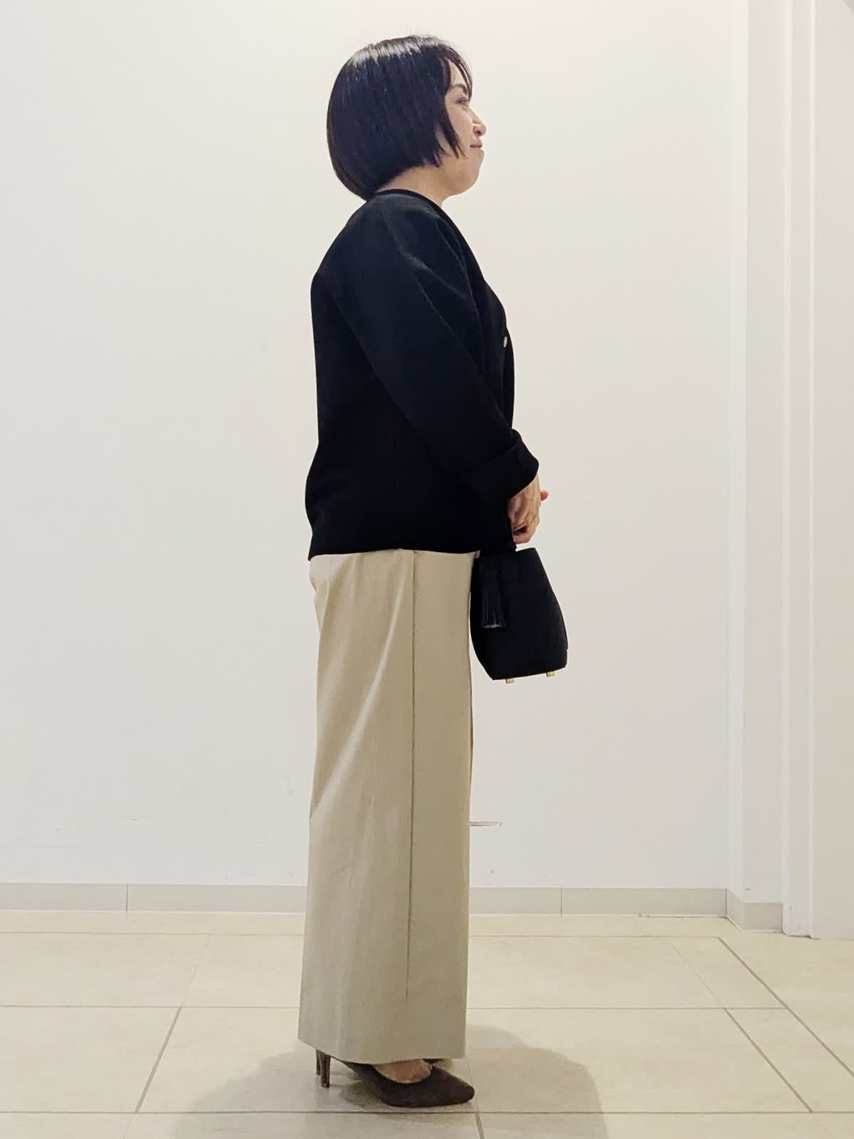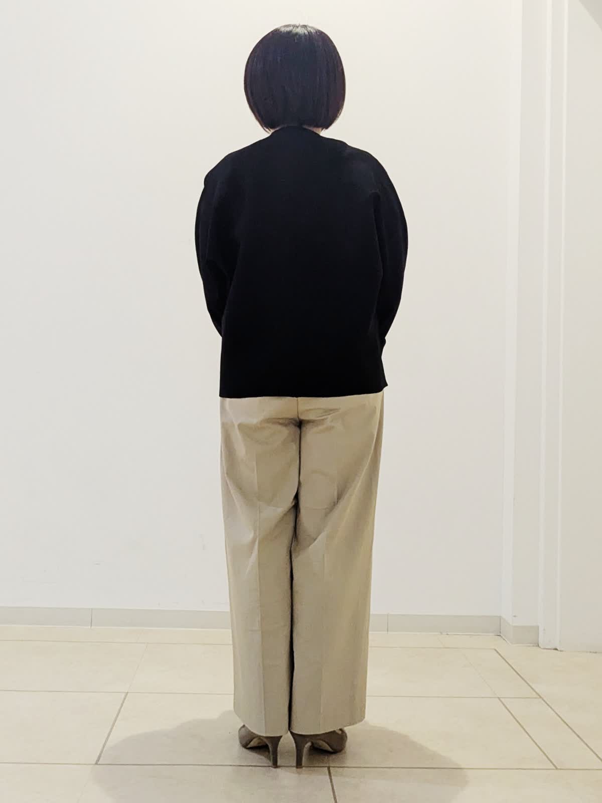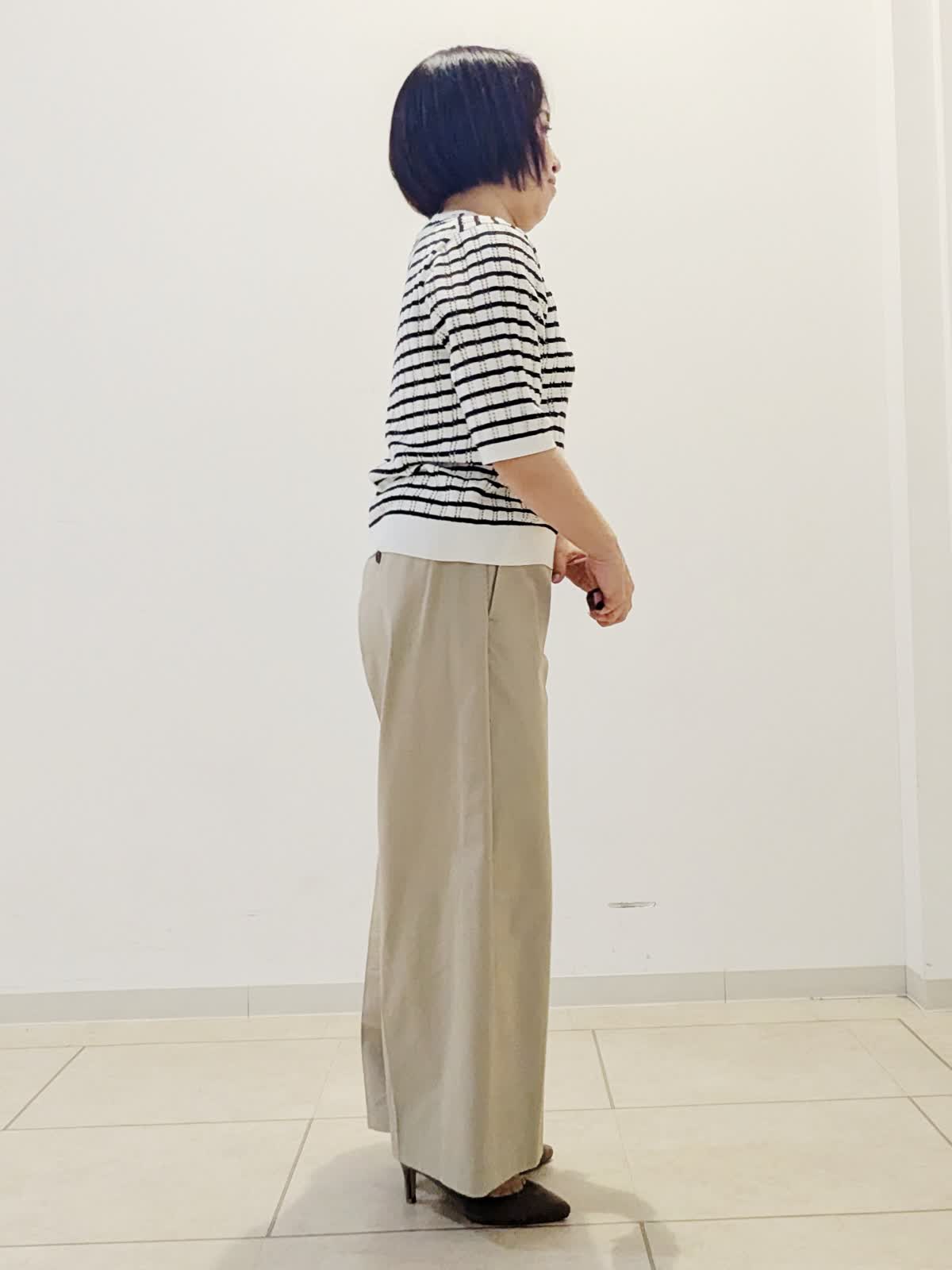 【着用サイズ】カーディガン:フリー ニット:フリー パンツ:9号【着用カラー】カーディガン:ブラック ニット:ボーダー パンツ:キャメル 春のお仕事コーデです。 黒色のカーディガンはお仕事の必需品ですよね。ドルマンスリーブなのでインナーのデザインに関係なく羽織っていただけます。インナーの5分袖ニットは袖が長めなので1枚でも安心です。どちらも着回しがきくので、他のものと組み合わせていろいろな感じをお楽しみください!
