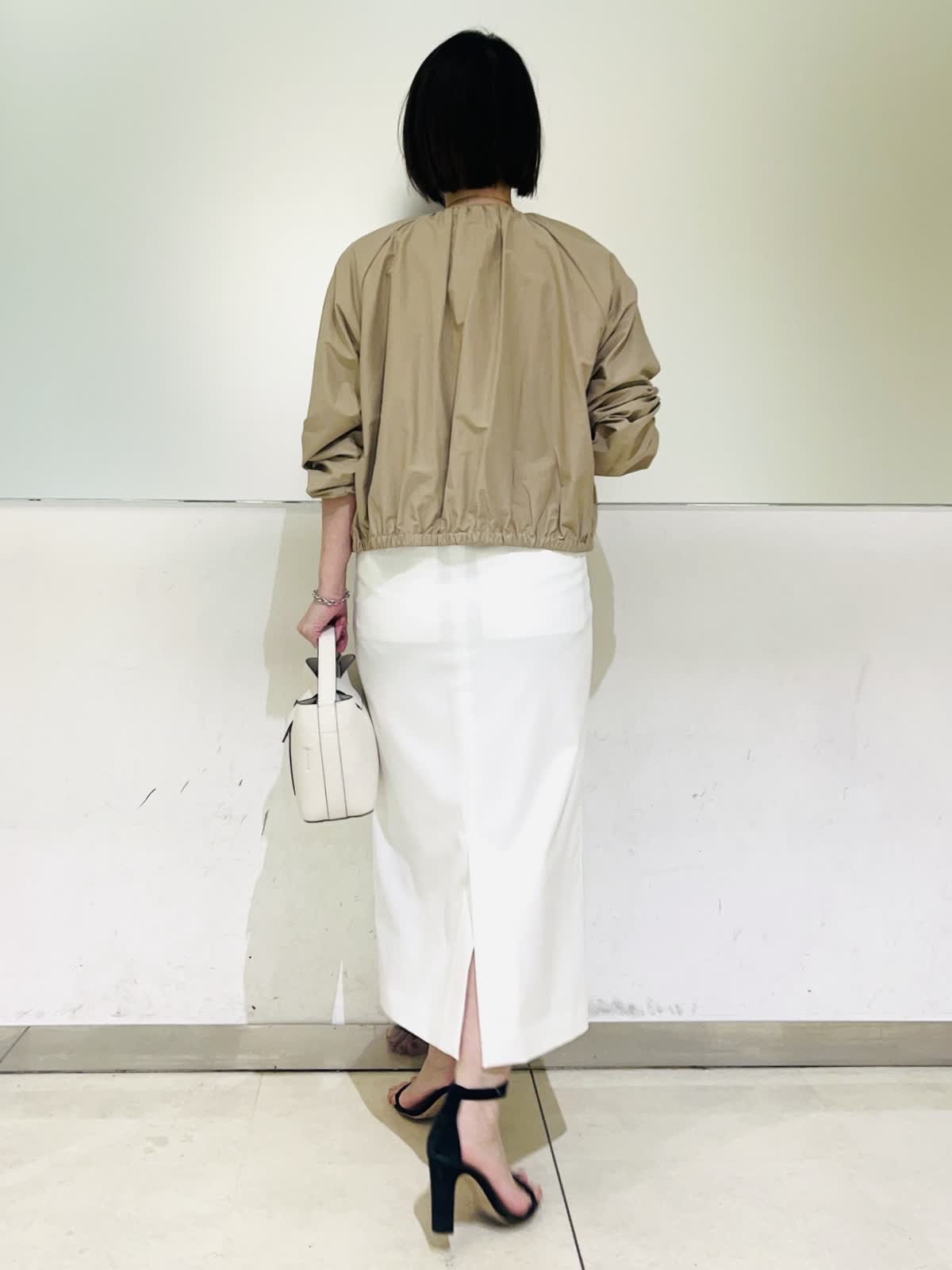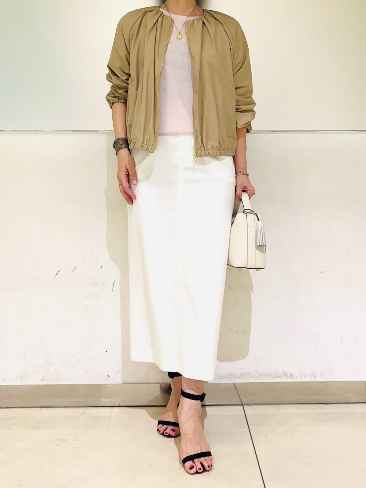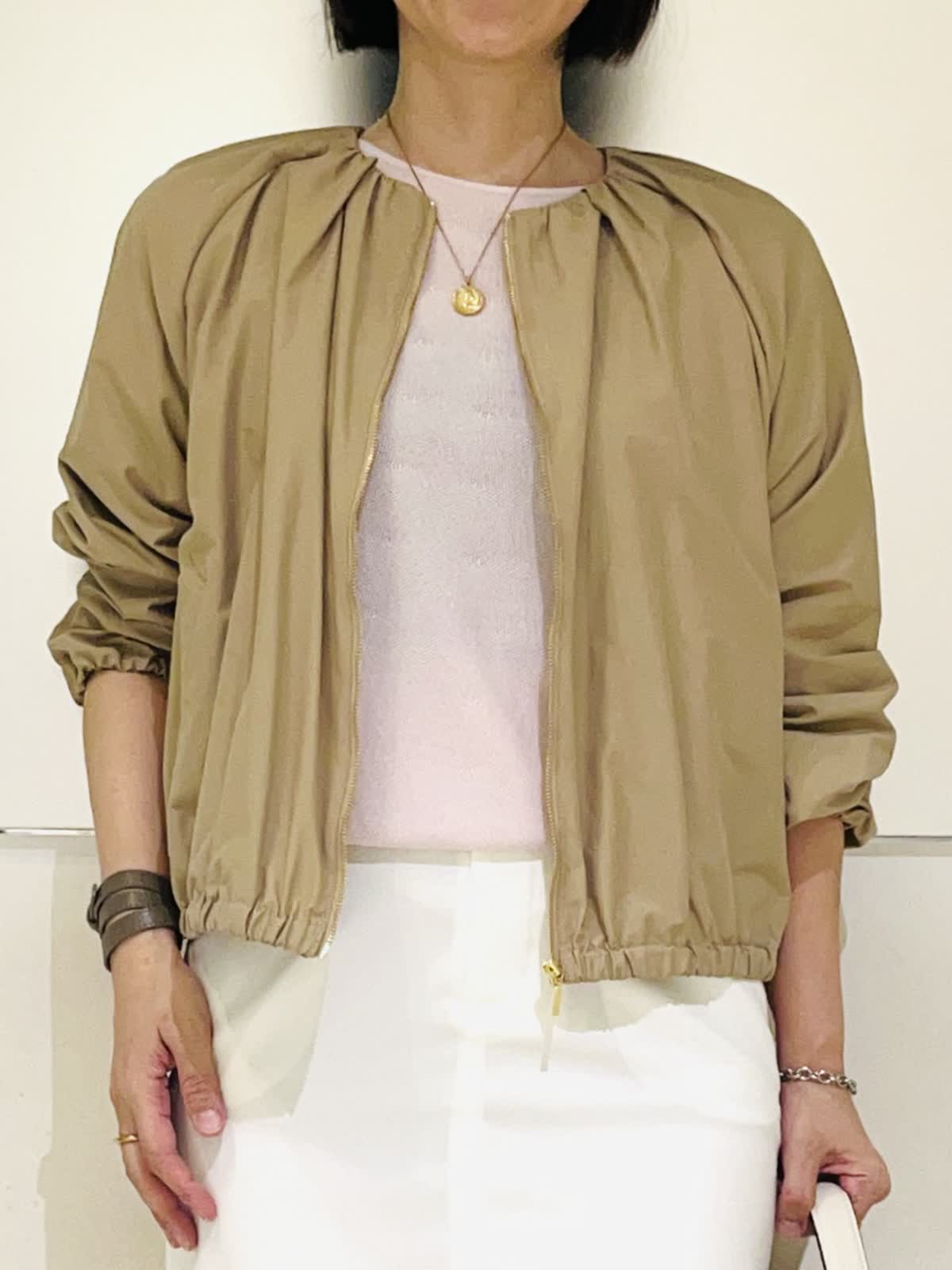 【着用アイテム】すべて9号 【着用カラー】ブルゾン:ベージュ ニットグレイッシュピンク スカート:オフホワイト 春のオフィスカジュアル。ギャザーとタックによって丸みのあるシルエットのブルゾン。コンパクトな着丈ですっきりしたデザインなので、オフィスの中での軽い羽織りにぴったり。スカート合わせできれい目な雰囲気、パンツ合わせならモードな雰囲気とボトムでイメージが変わります。