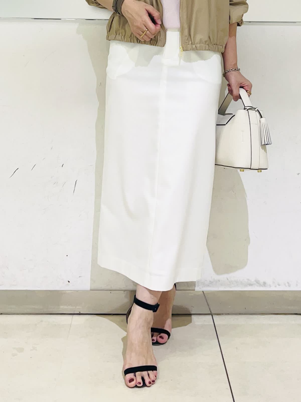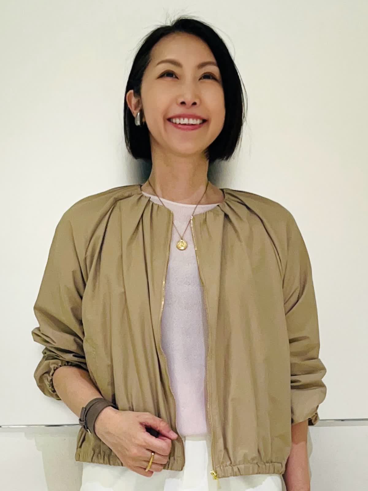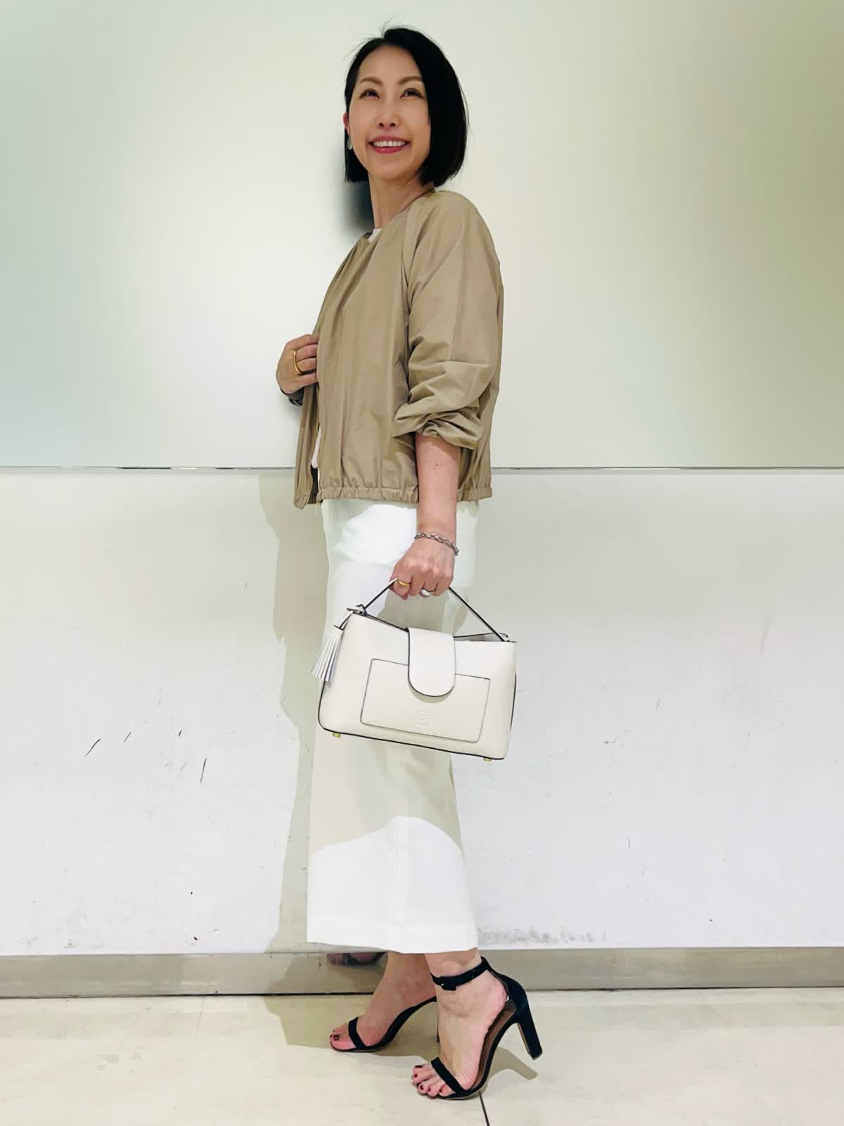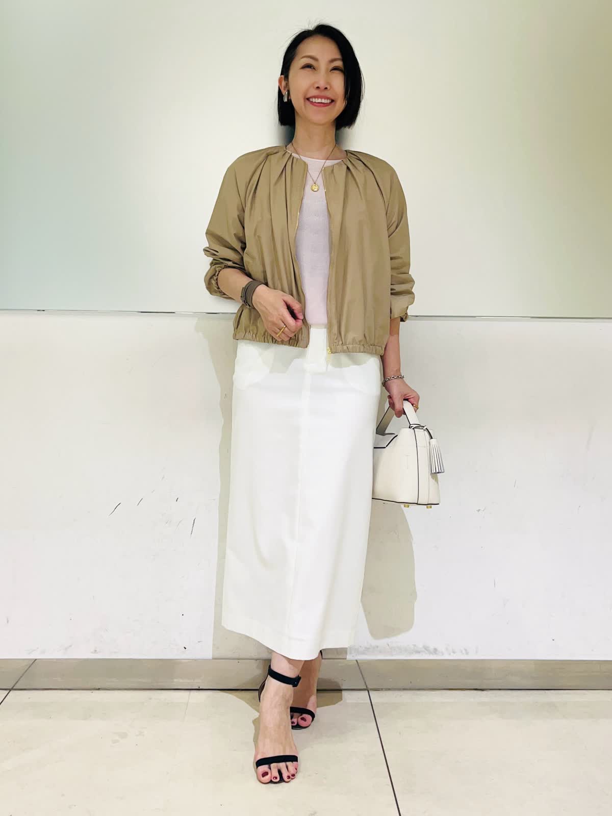 【着用アイテム】すべて9号 【着用カラー】ブルゾン:ベージュ ニットグレイッシュピンク スカート:オフホワイト 春のオフィスカジュアル。ギャザーとタックによって丸みのあるシルエットのブルゾン。コンパクトな着丈ですっきりしたデザインなので、オフィスの中での軽い羽織りにぴったり。スカート合わせできれい目な雰囲気、パンツ合わせならモードな雰囲気とボトムでイメージが変わります。