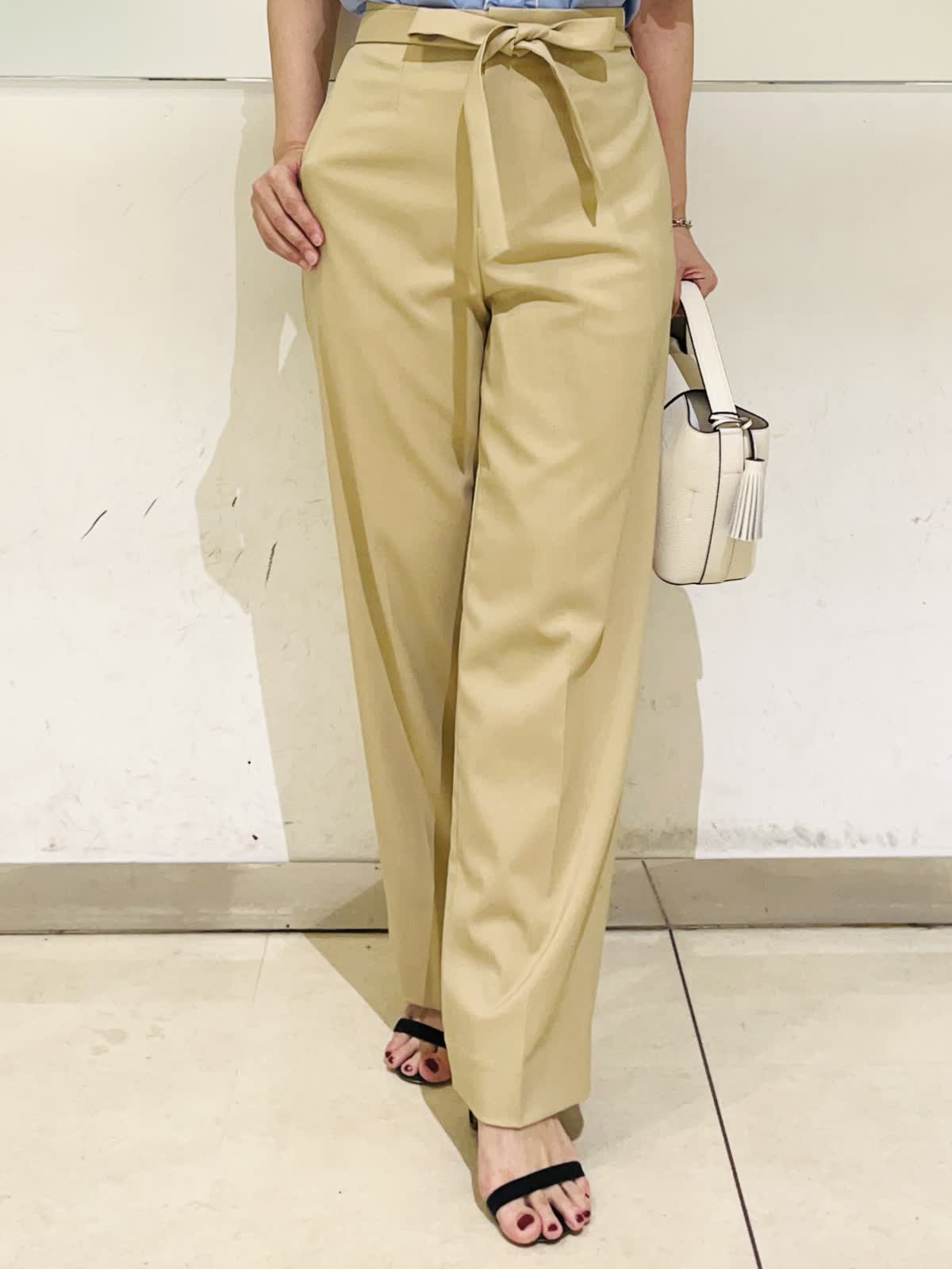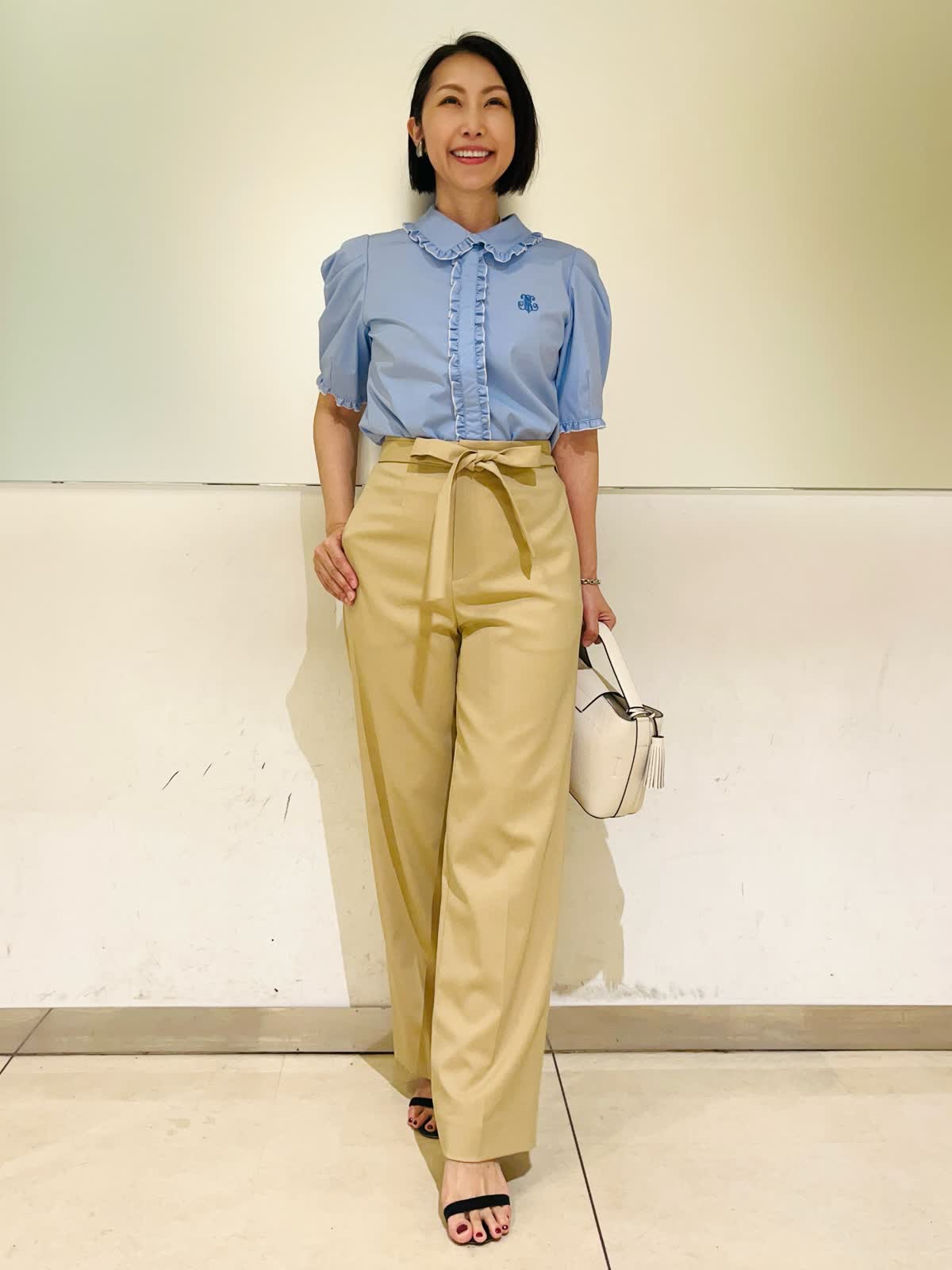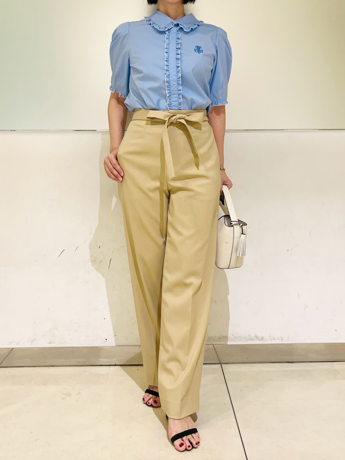 【着用アイテム】すべて9号 【着用カラー】ブラウス:サックス パンツ:ベージュ 初夏のオフィスカジュアル。オフィスカジュアルに欲しいのはきちんと間と清潔感。サックスのブラウスならそのどちらも叶います。爽やかなサックスに白の配色を施すことによってより清涼感が出ます。合わせたパンツも適度にら落ち感があり、カジュアルにならないきれい目なベージュです。きちんと感がありながら、フェミニンな雰囲気も兼ね備えたスタイリングです。