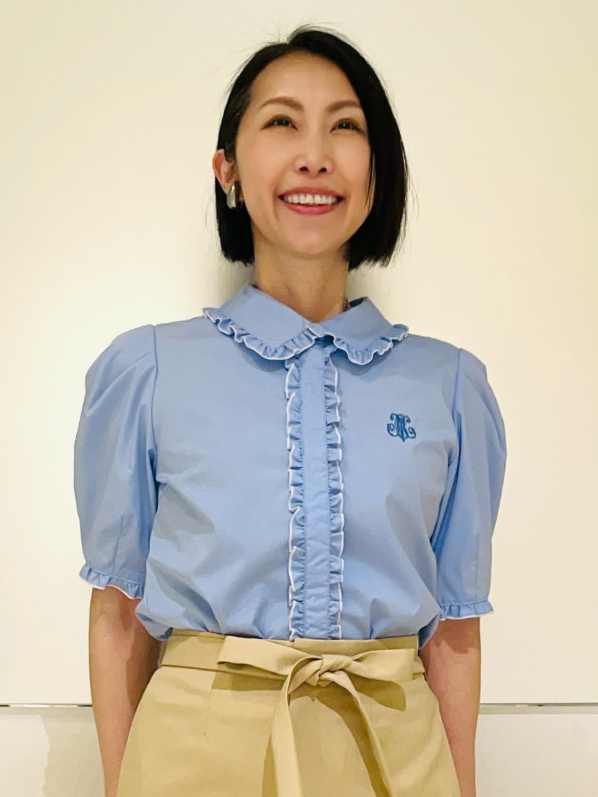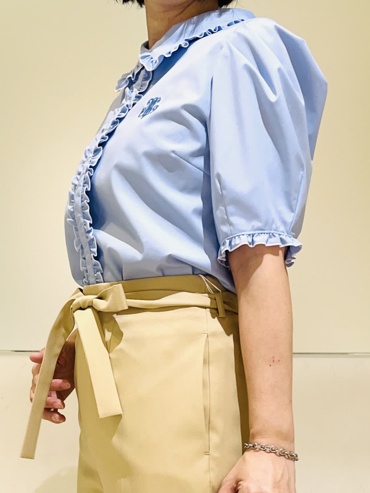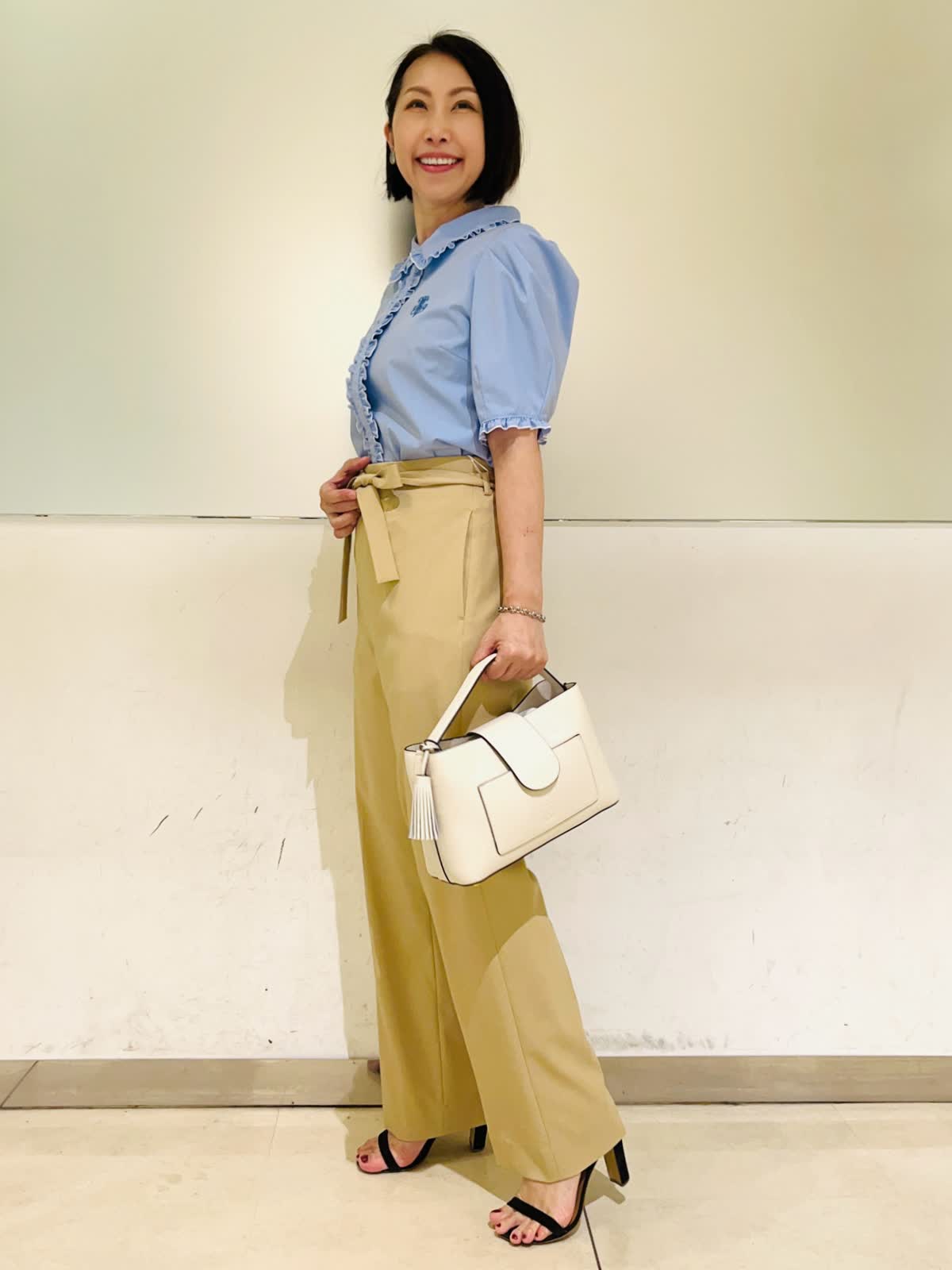 【着用アイテム】すべて9号 【着用カラー】ブラウス:サックス パンツ:ベージュ 初夏のオフィスカジュアル。オフィスカジュアルに欲しいのはきちんと間と清潔感。サックスのブラウスならそのどちらも叶います。爽やかなサックスに白の配色を施すことによってより清涼感が出ます。合わせたパンツも適度にら落ち感があり、カジュアルにならないきれい目なベージュです。きちんと感がありながら、フェミニンな雰囲気も兼ね備えたスタイリングです。