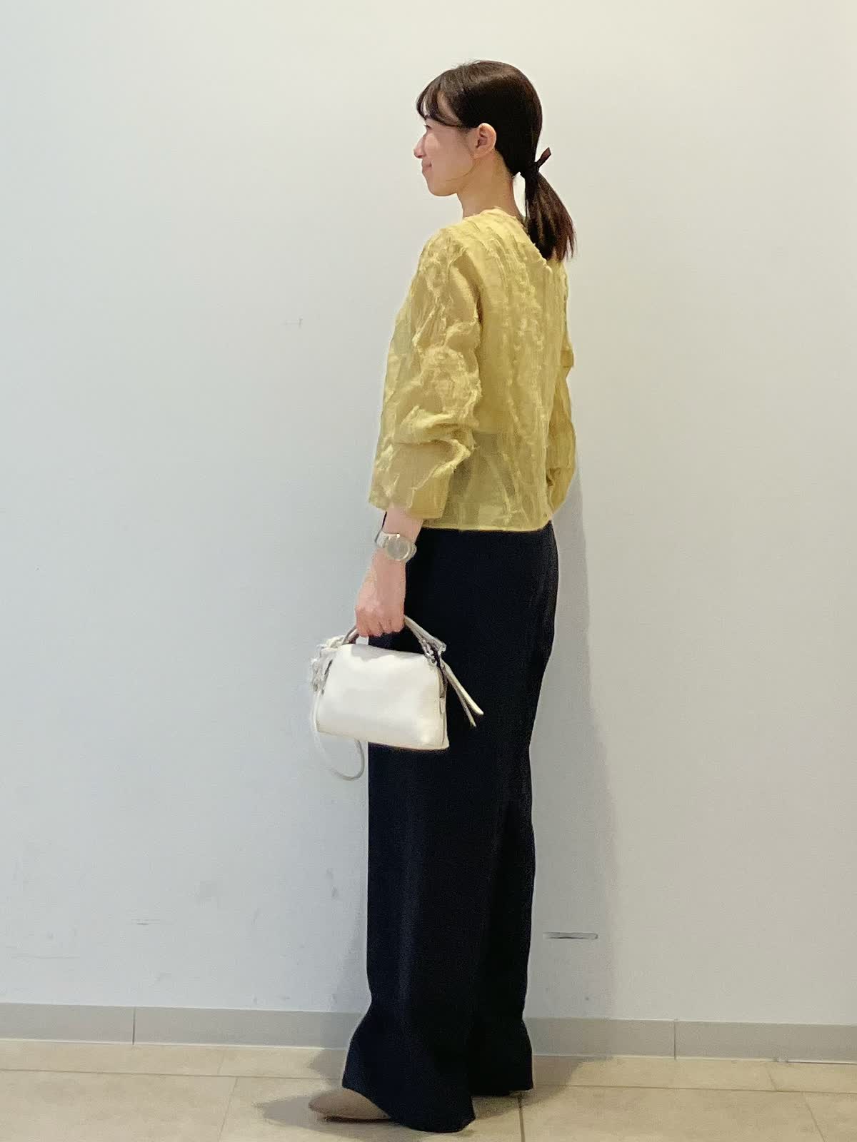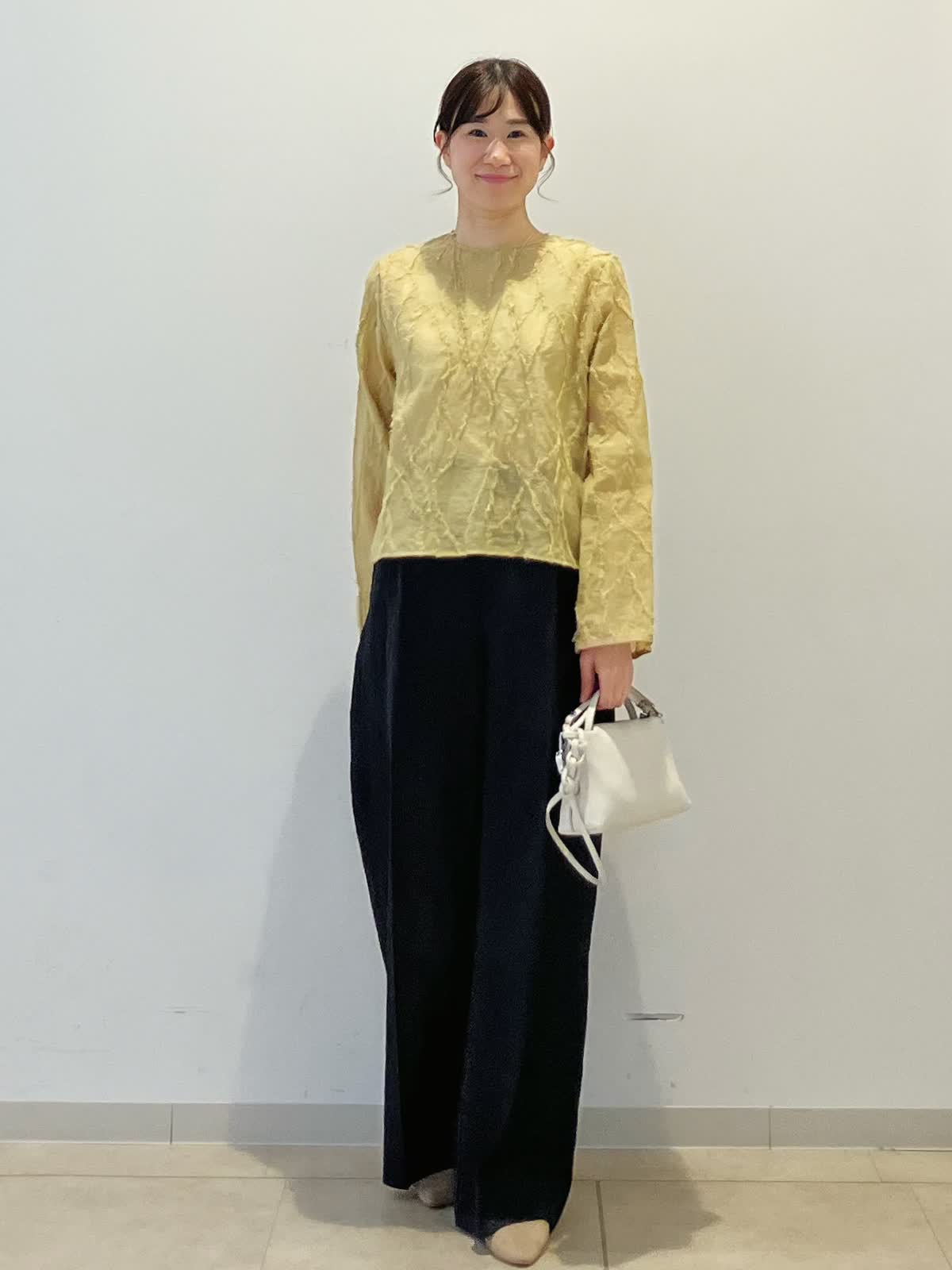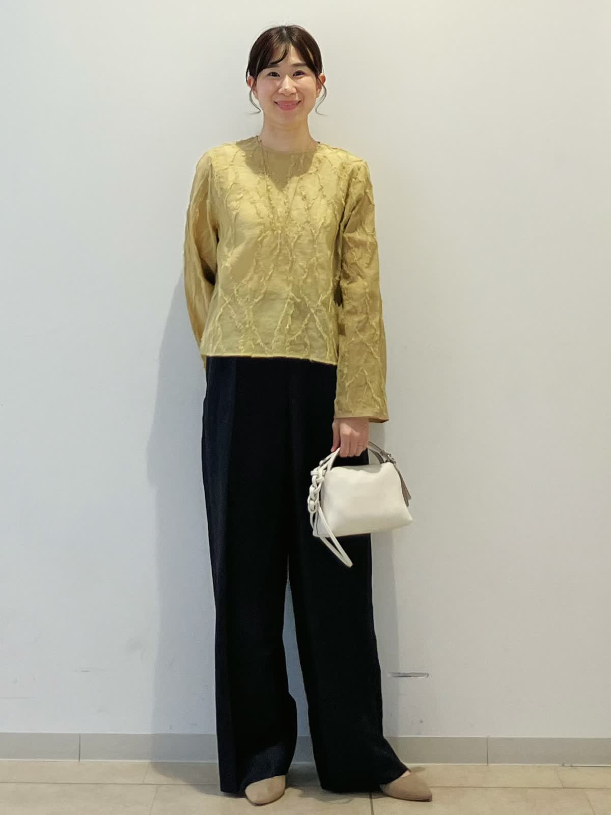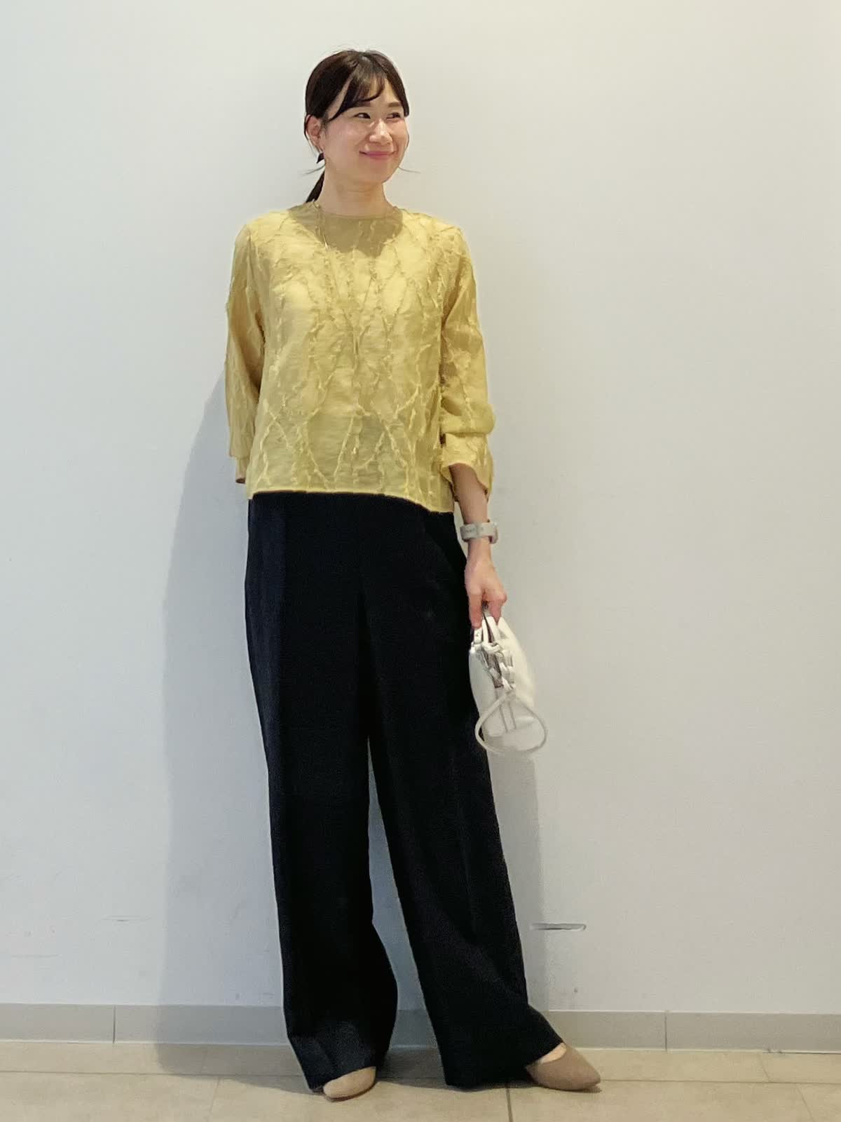 【着用サイズ】ブラウス:9号 パンツ:9号 「キレイめスタイル」 上品なシアー感で、肌触りの良い柔らかいブラウス。 フリンジのような刺繍が素敵です。 オフィスにもぴったり。きちんと感のあるスタイルです。