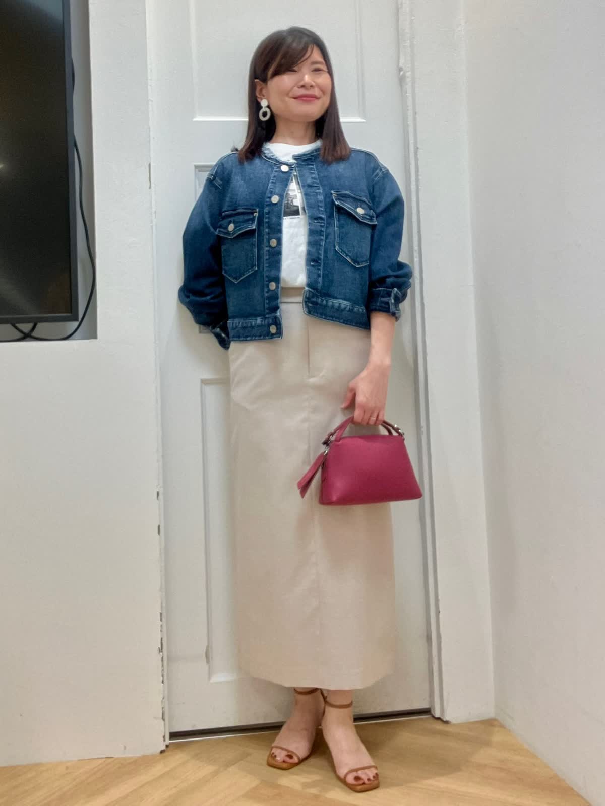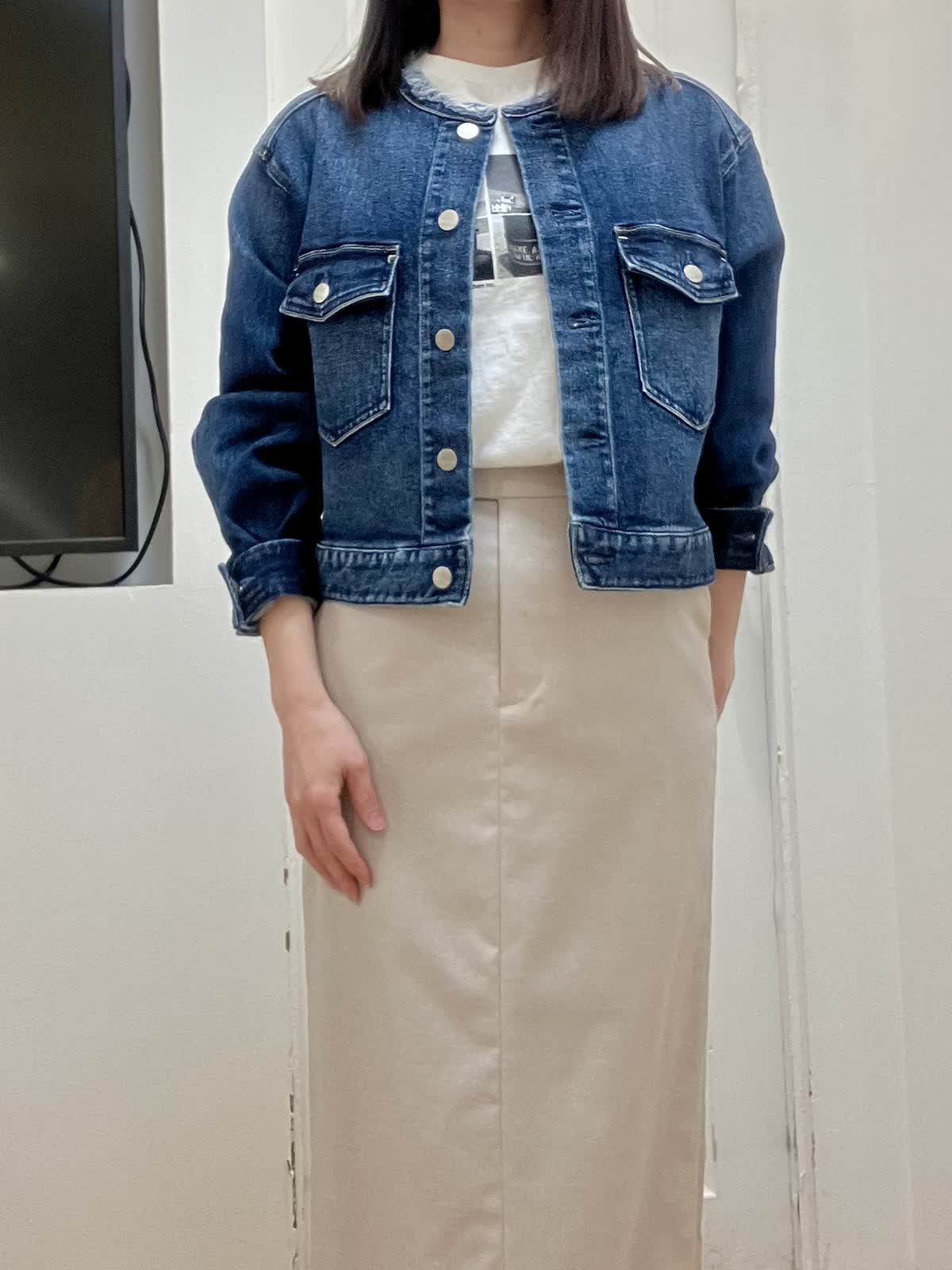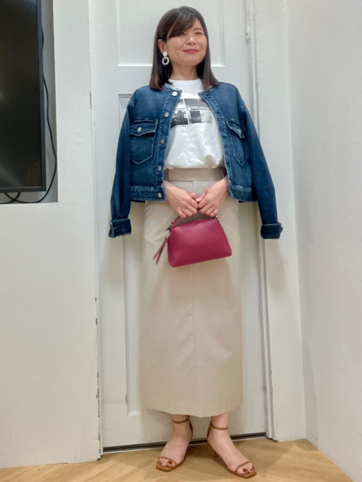 【着用サイズ】全て9号 【着用カラー】ジャケット:インディゴ カットソー:オフホワイト スカート:ベージュ カジュアルお出掛けスタイル ヘルシー別注デニムジャケットはノーカラーフリンジデザインがポイント。コンパクト丈で羽織るだけで今っぽいコーデに。 スカートは張りのある素材感で、綿麻混なので夏場まで着回しできます。長めのタイトシルエットなので足元を選ばずスニーカー合わせも◎インナーはフォトT合わせでカジュアルにしました。