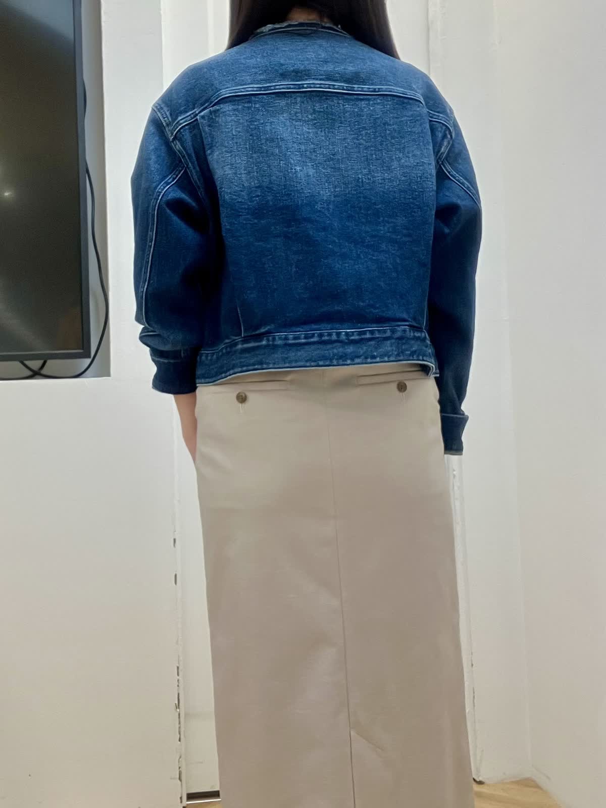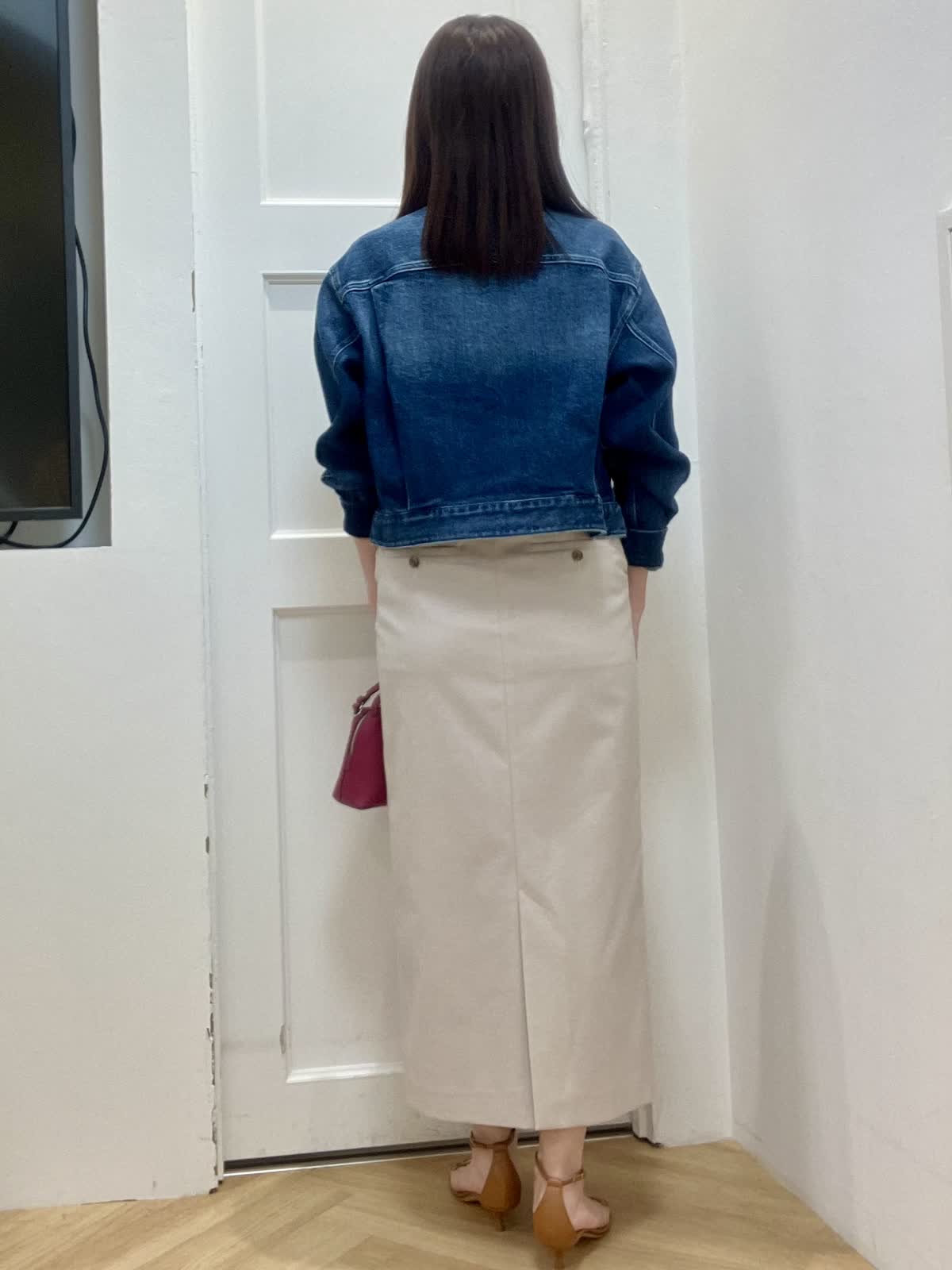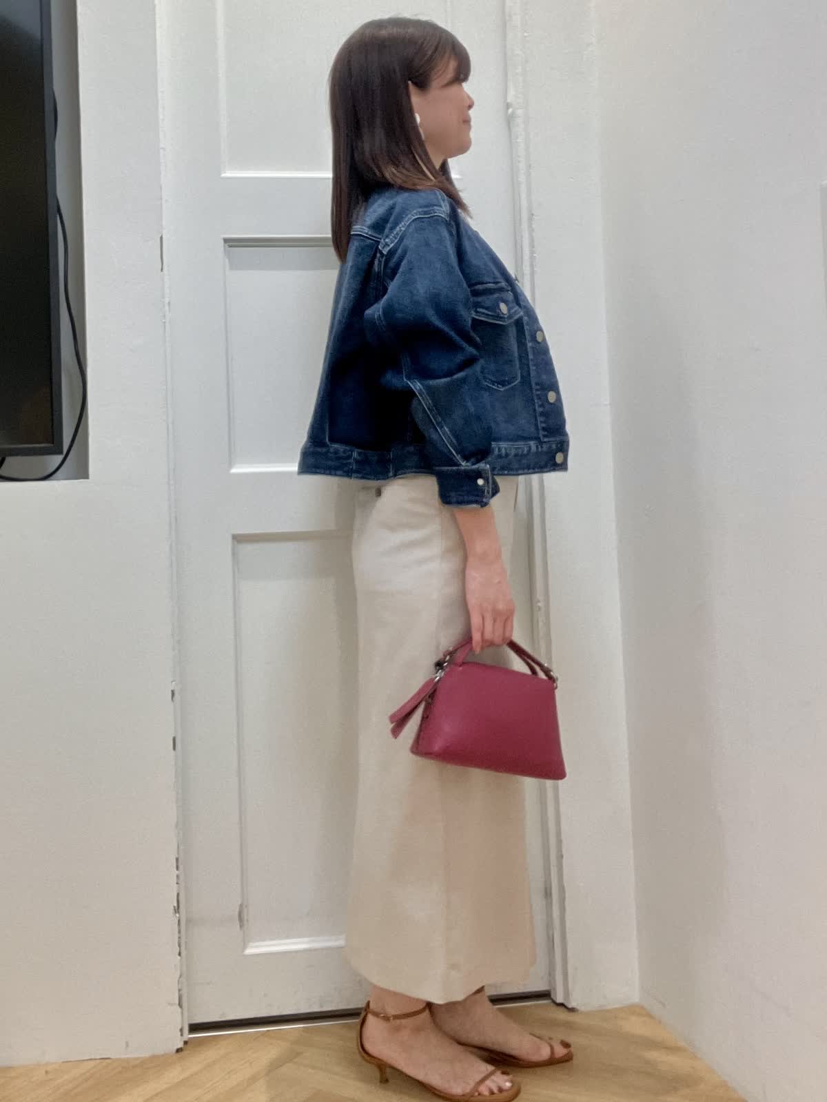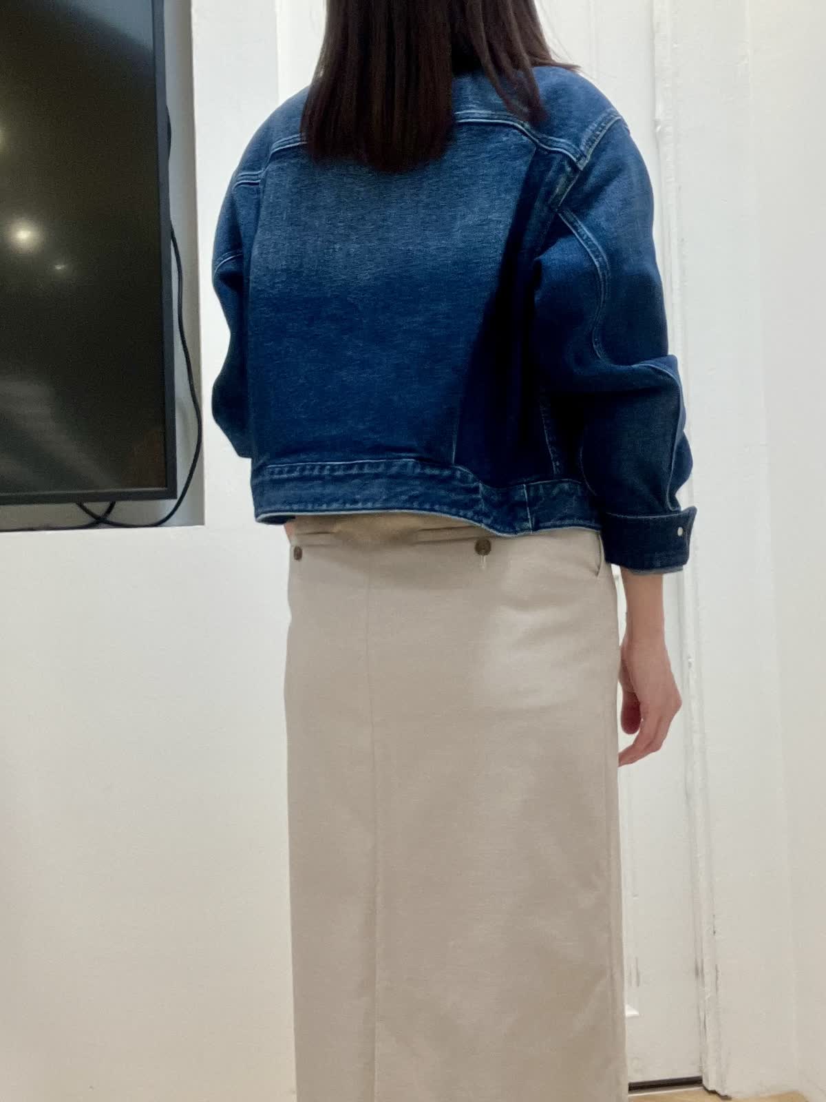 【着用サイズ】全て9号 【着用カラー】ジャケット:インディゴ カットソー:オフホワイト スカート:ベージュ カジュアルお出掛けスタイル ヘルシー別注デニムジャケットはノーカラーフリンジデザインがポイント。コンパクト丈で羽織るだけで今っぽいコーデに。 スカートは張りのある素材感で、綿麻混なので夏場まで着回しできます。長めのタイトシルエットなので足元を選ばずスニーカー合わせも◎インナーはフォトT合わせでカジュアルにしました。