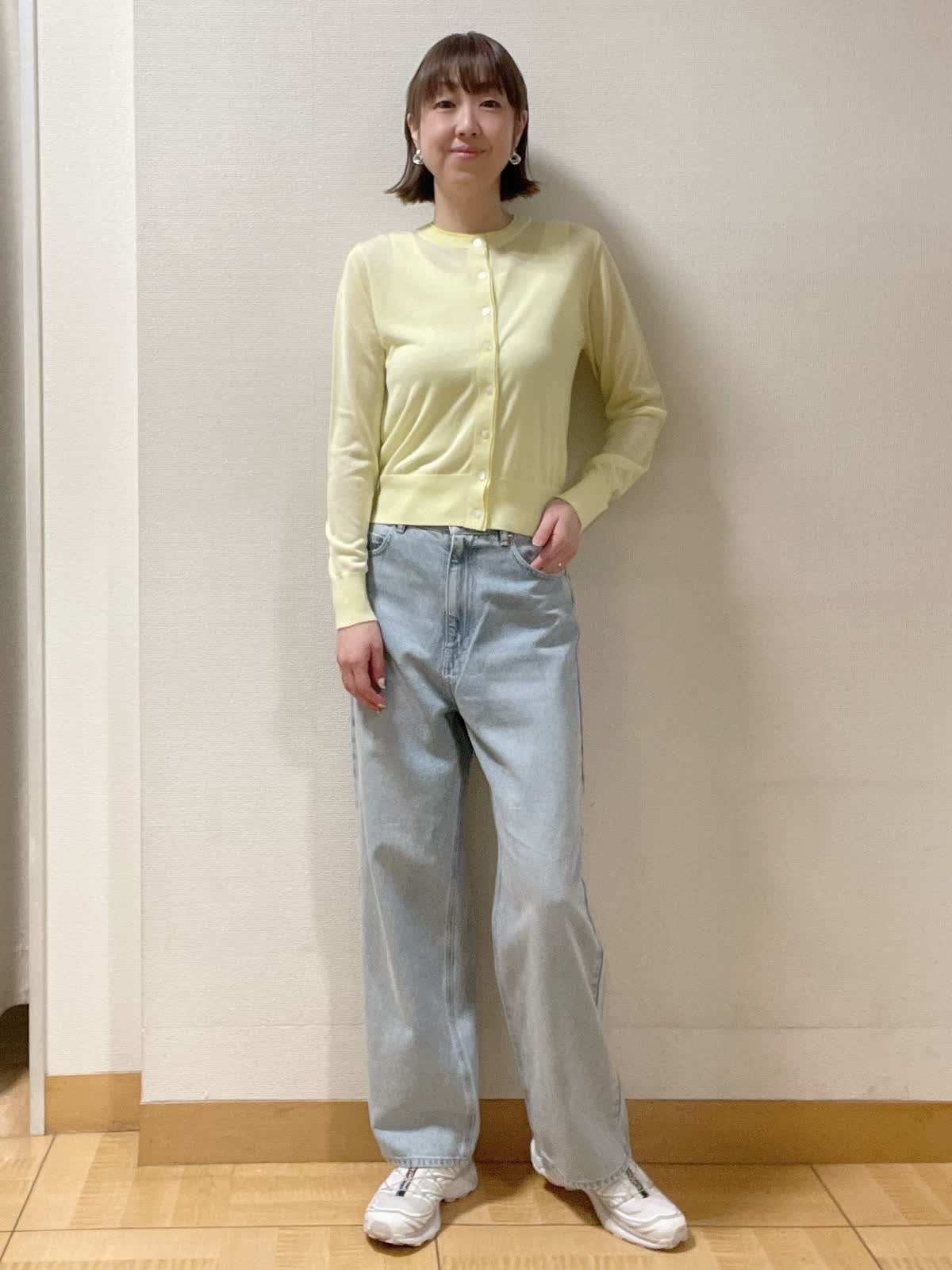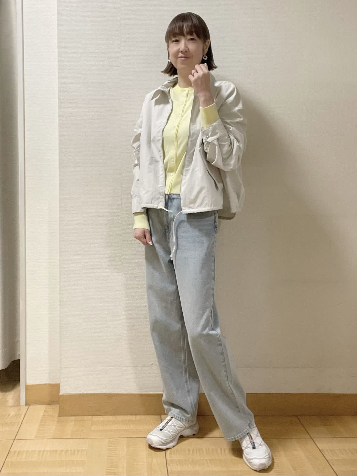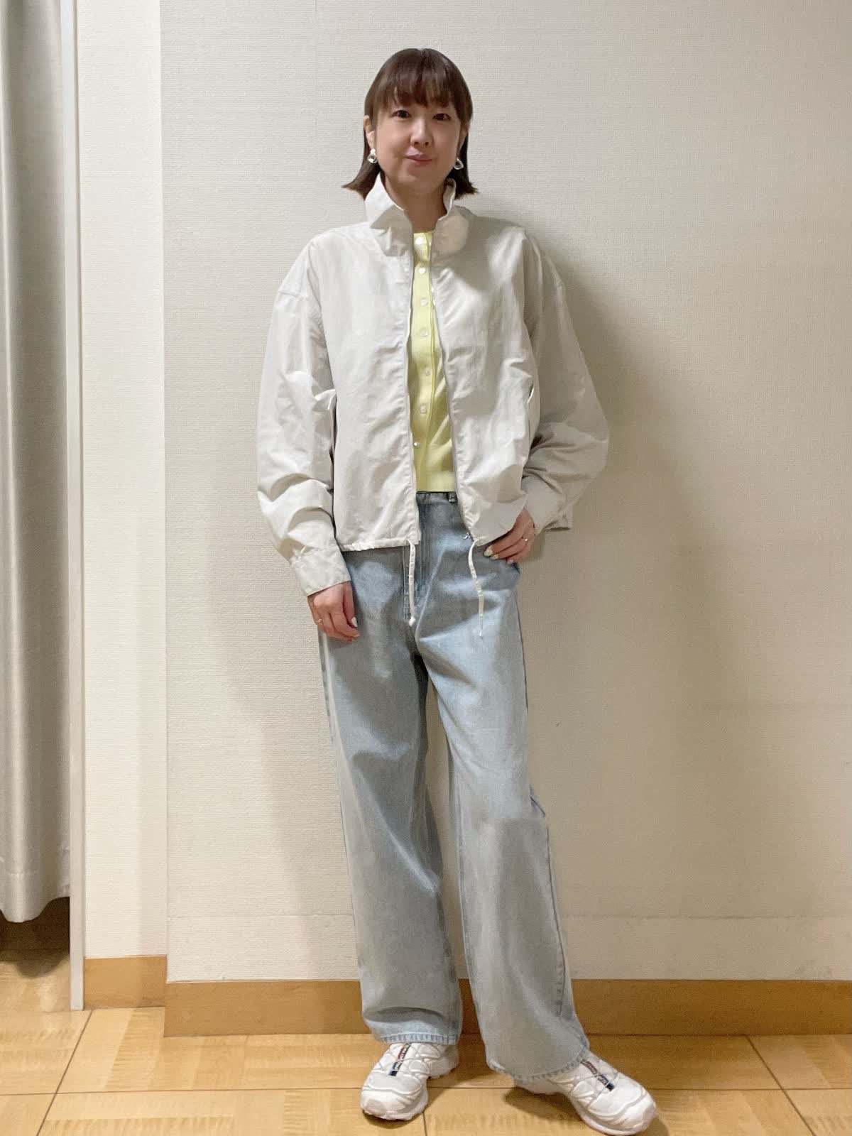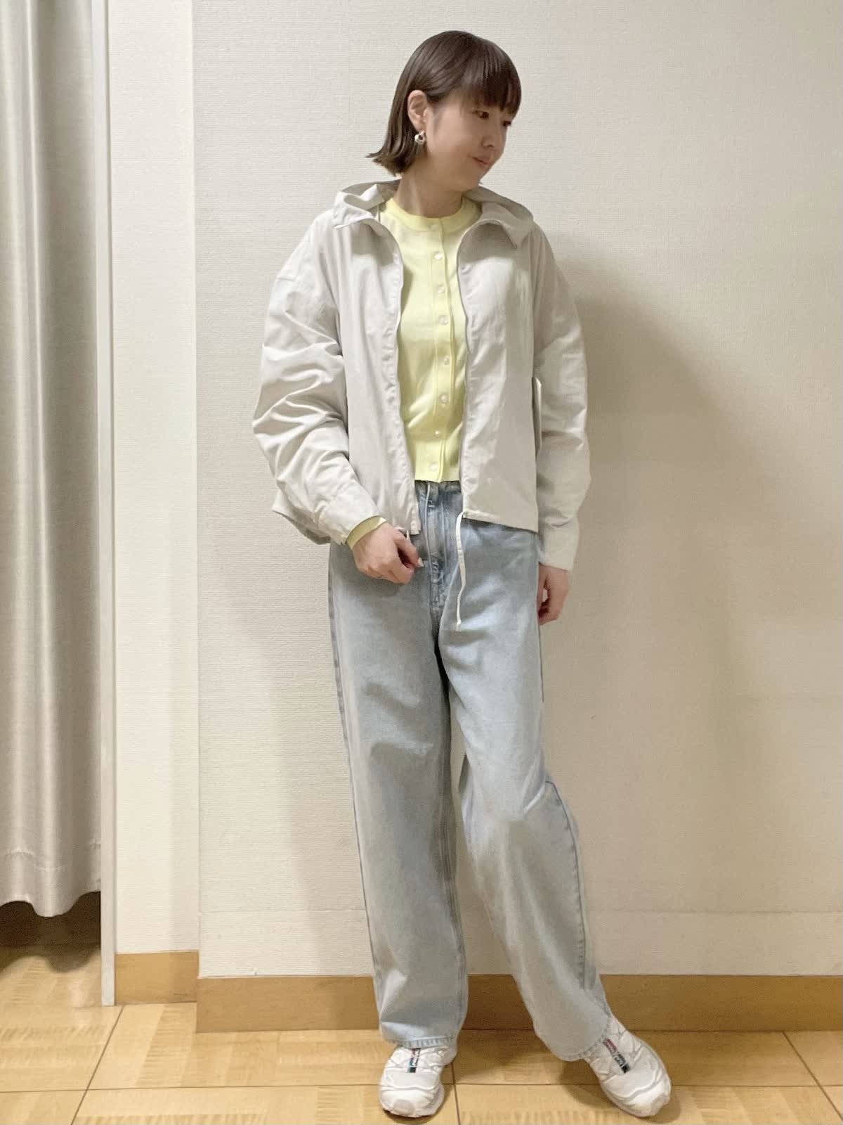 【着用サイズ】コート:フリー 他全て9号【着用カラー】コート:グレーベージュ ニット:イエロー インナーカットソー:ホワイトブラック パンツ:サックス ラフにサラッと羽織れるショートコート。グレーベージュなのでスタイリングしやすく、イエロー×サックスで爽やかなGWスタイルに。