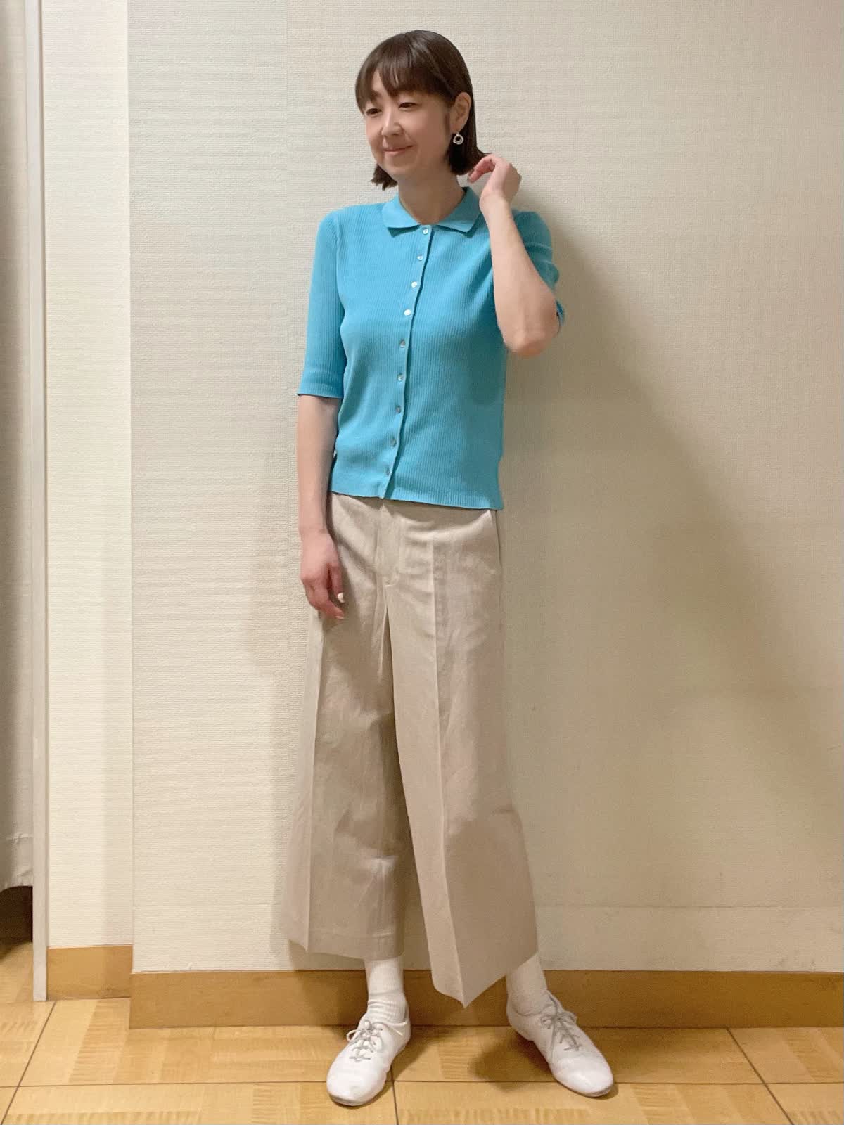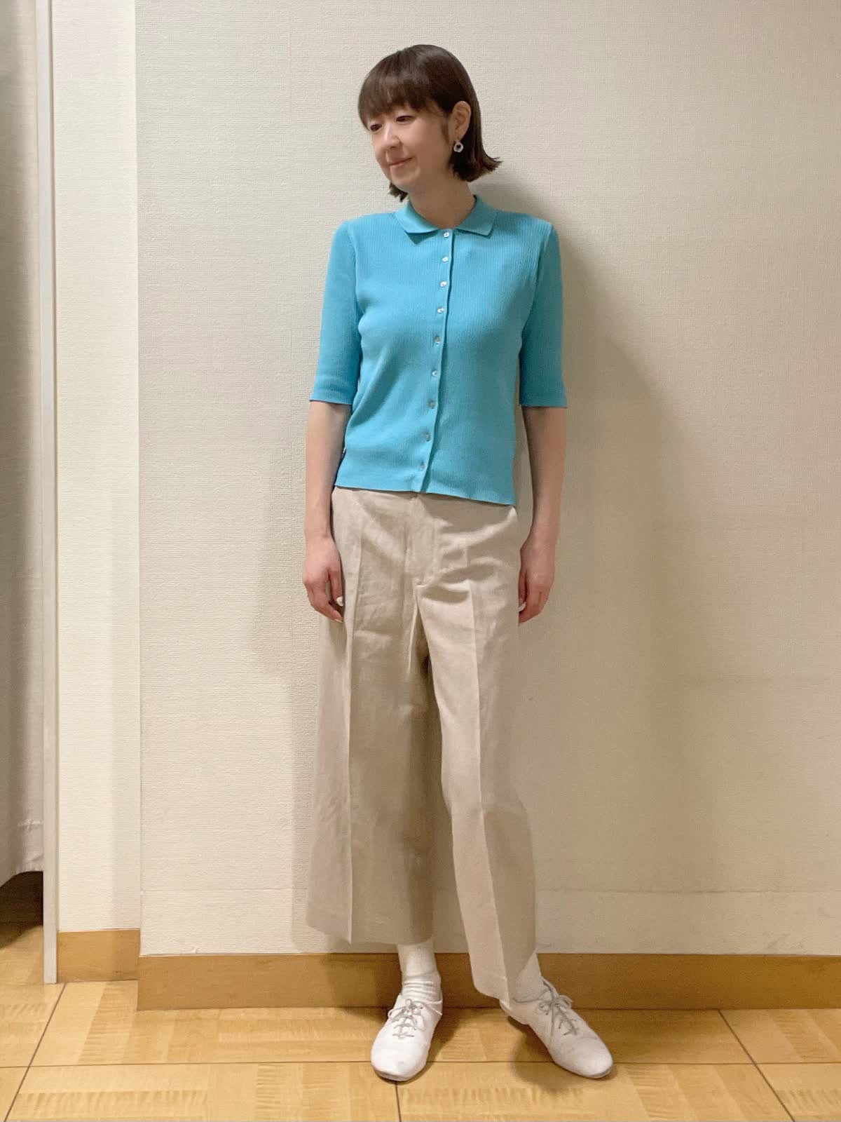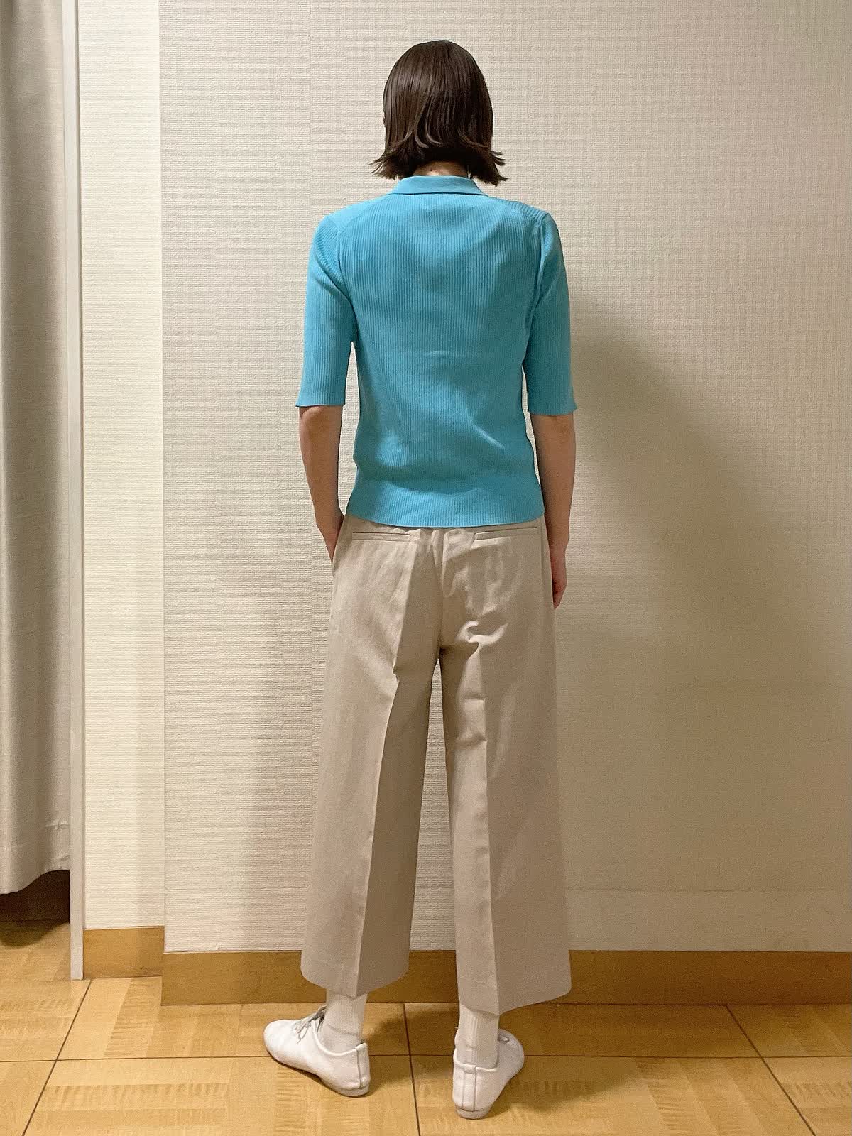 【着用サイズ】ニット:フリー パンツ:9号【着用カラー】ニット:ブルー パンツ:ベージュ しなやかな伸縮性があるポロ襟リブニット。5分袖なので二の腕カバーもバッチリ。ワイドクロップパンツ合わせで初夏スタイルに。