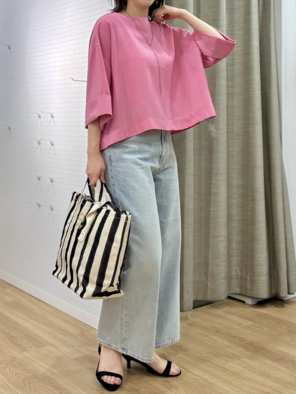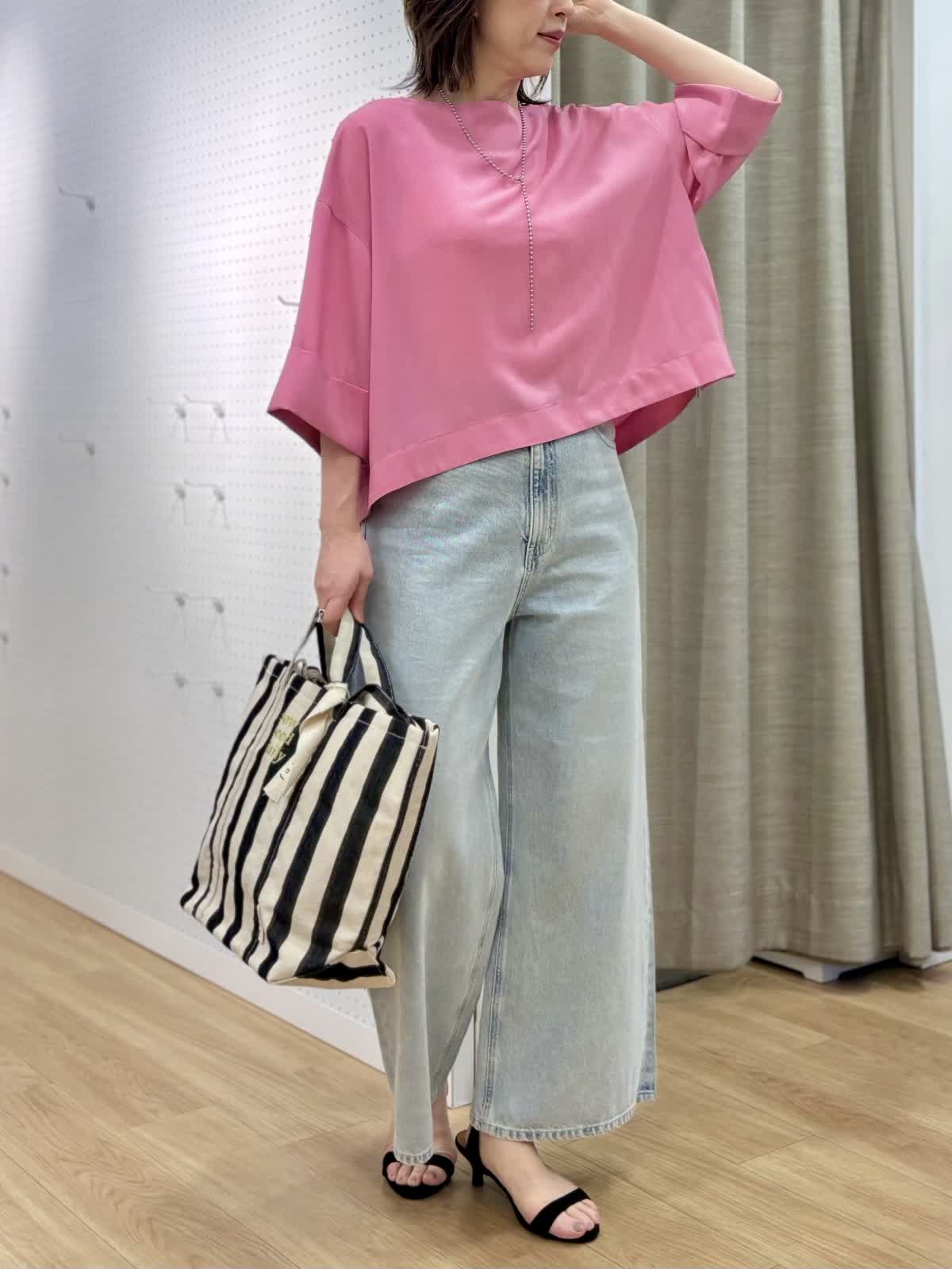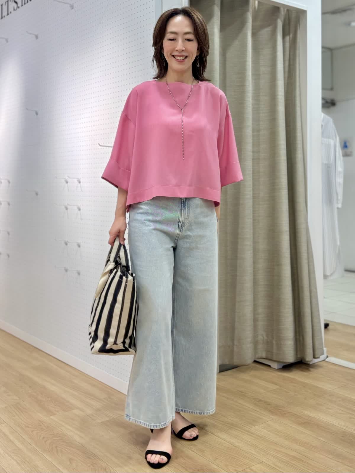 【着用カラー/サイズ】 ブラウス:ピンク/フリー パンツ:サックス/11号 初夏のお出掛けスタイリング。毎年人気のブラウスはお手入れがラクでアイロン無しでシワを気にせず着られます。真夏過ぎて初秋まで着られる出番の多い優秀ブラウスです。日除けしながらも風が通り真夏も快適です。美デコルテなスクエアの襟元が◎