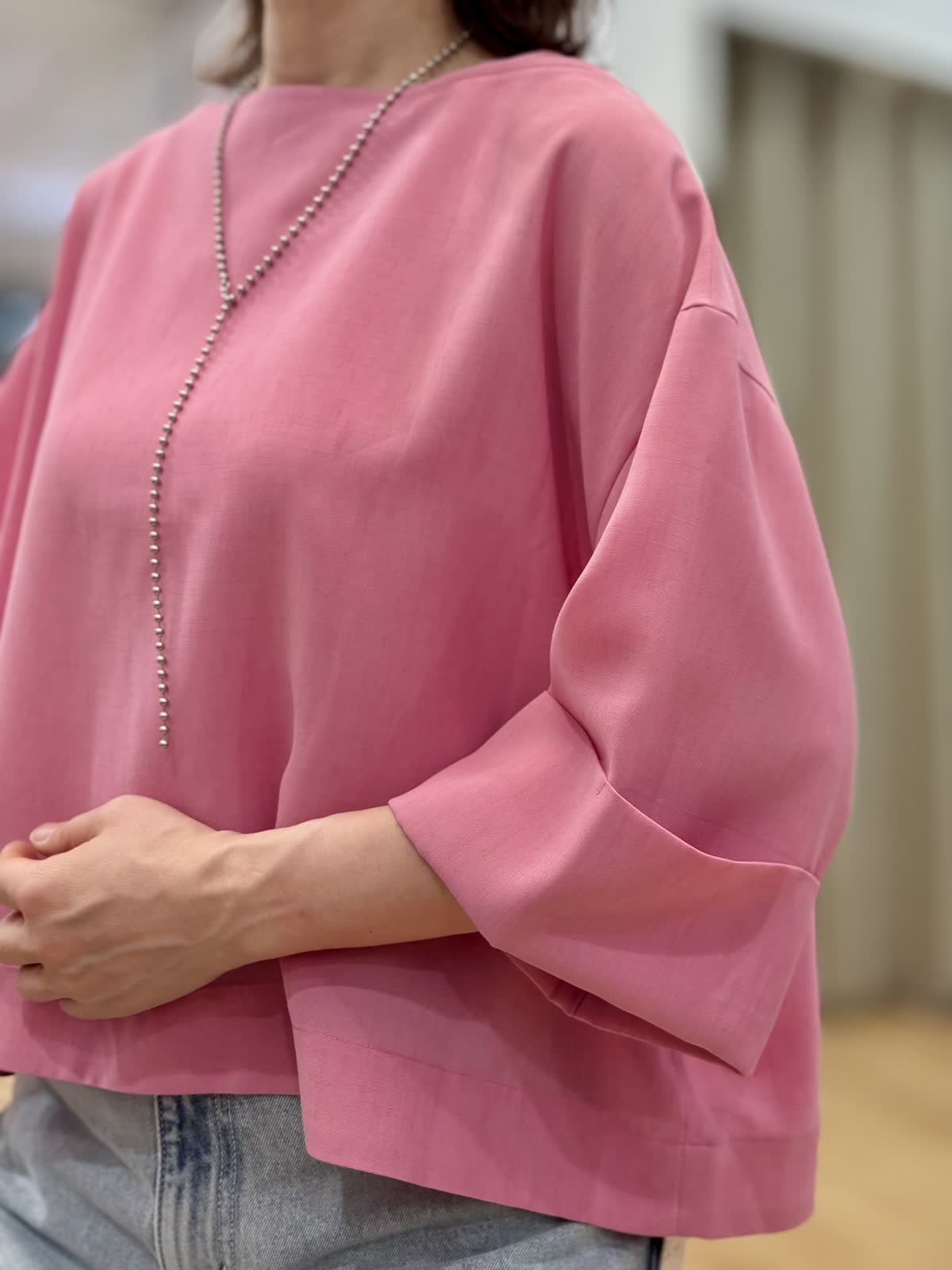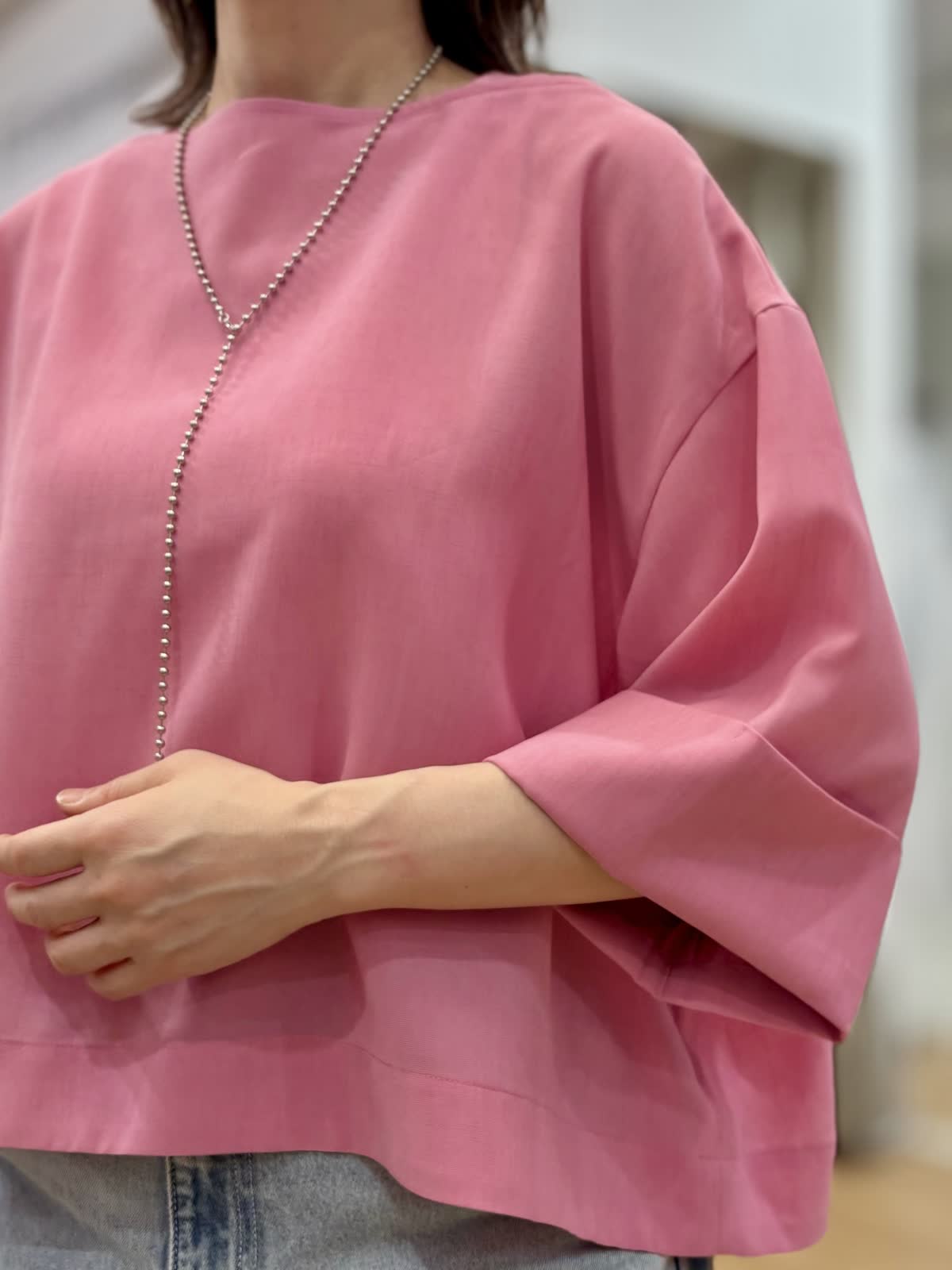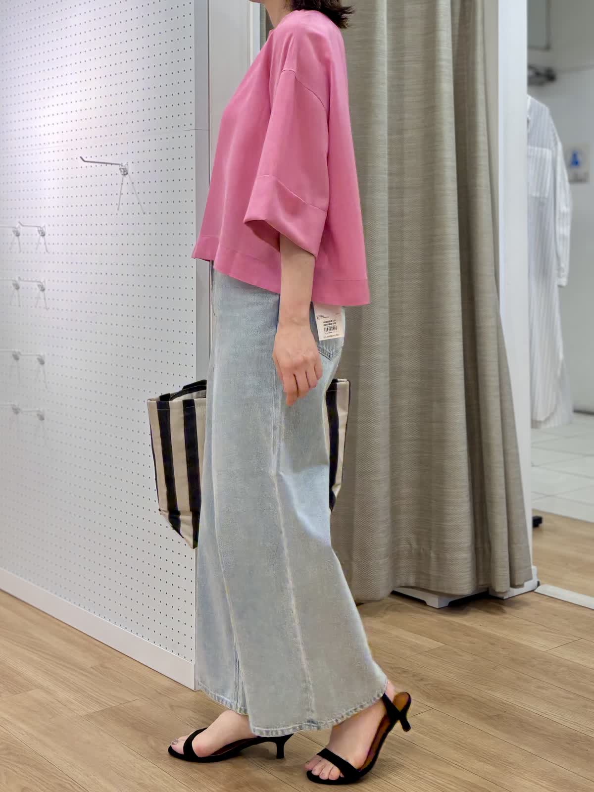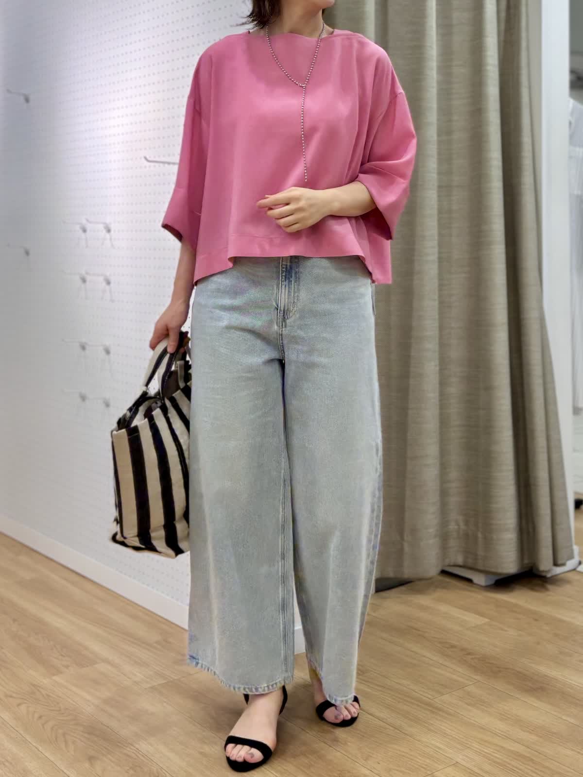 【着用カラー/サイズ】 ブラウス:ピンク/フリー パンツ:サックス/11号 初夏のお出掛けスタイリング。毎年人気のブラウスはお手入れがラクでアイロン無しでシワを気にせず着られます。真夏過ぎて初秋まで着られる出番の多い優秀ブラウスです。日除けしながらも風が通り真夏も快適です。美デコルテなスクエアの襟元が◎