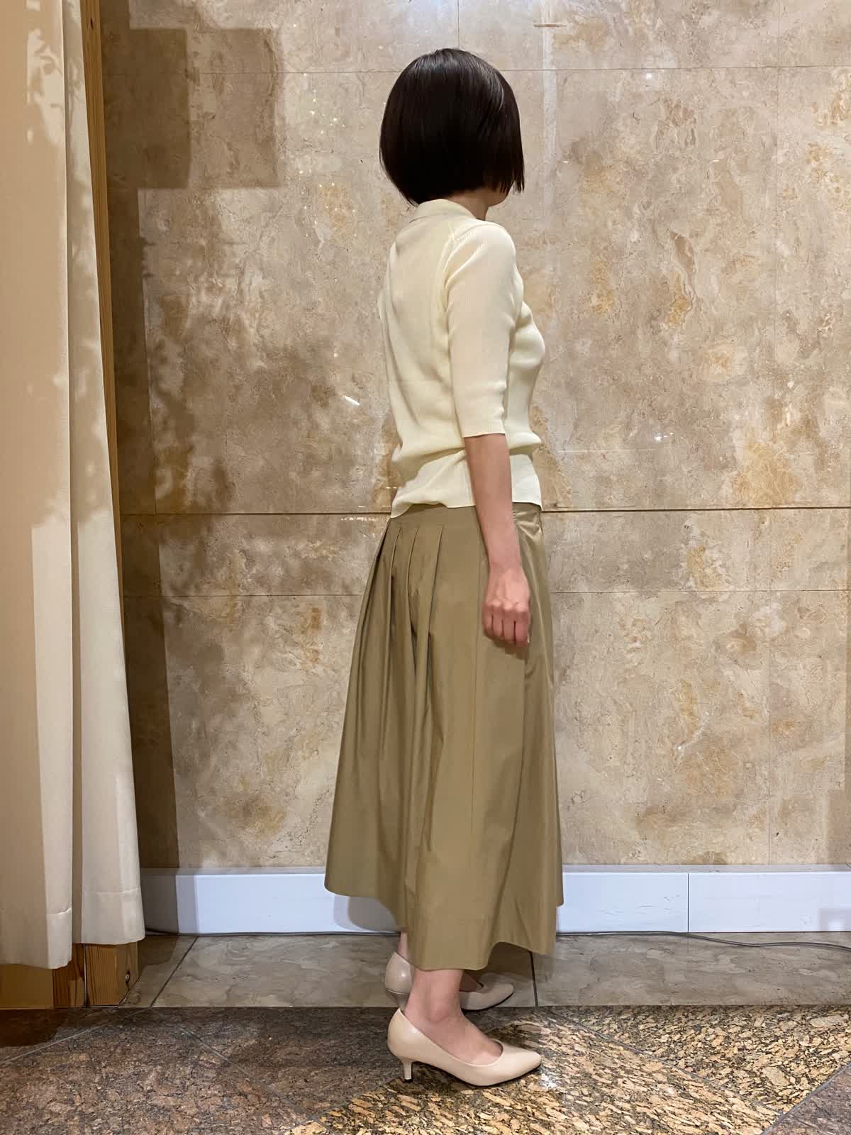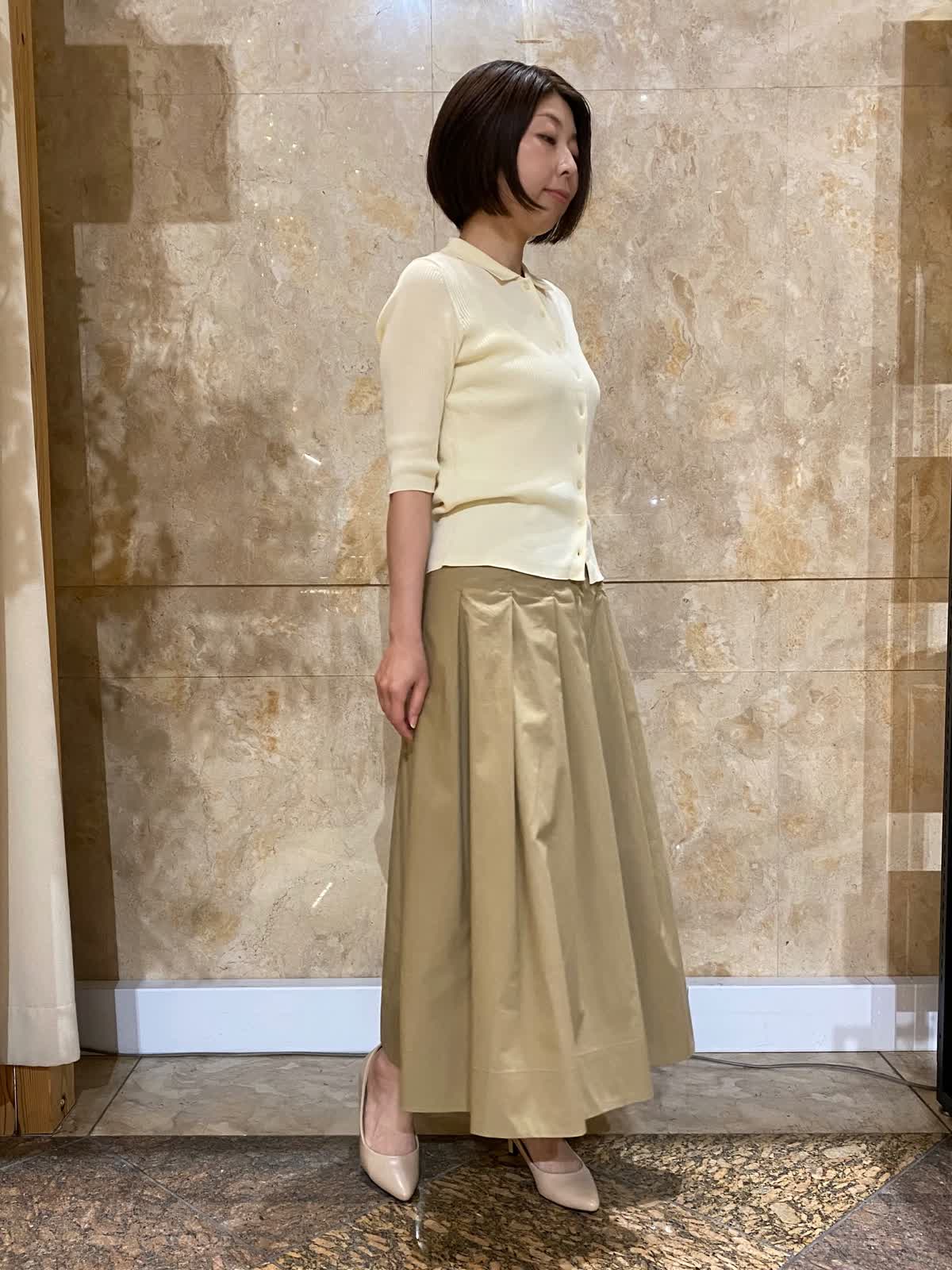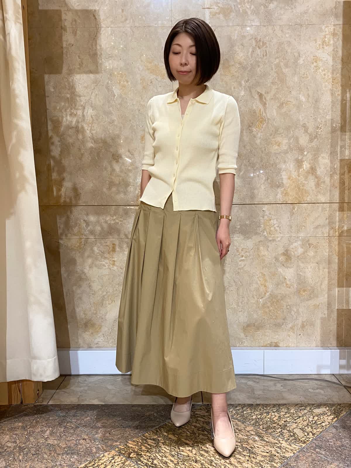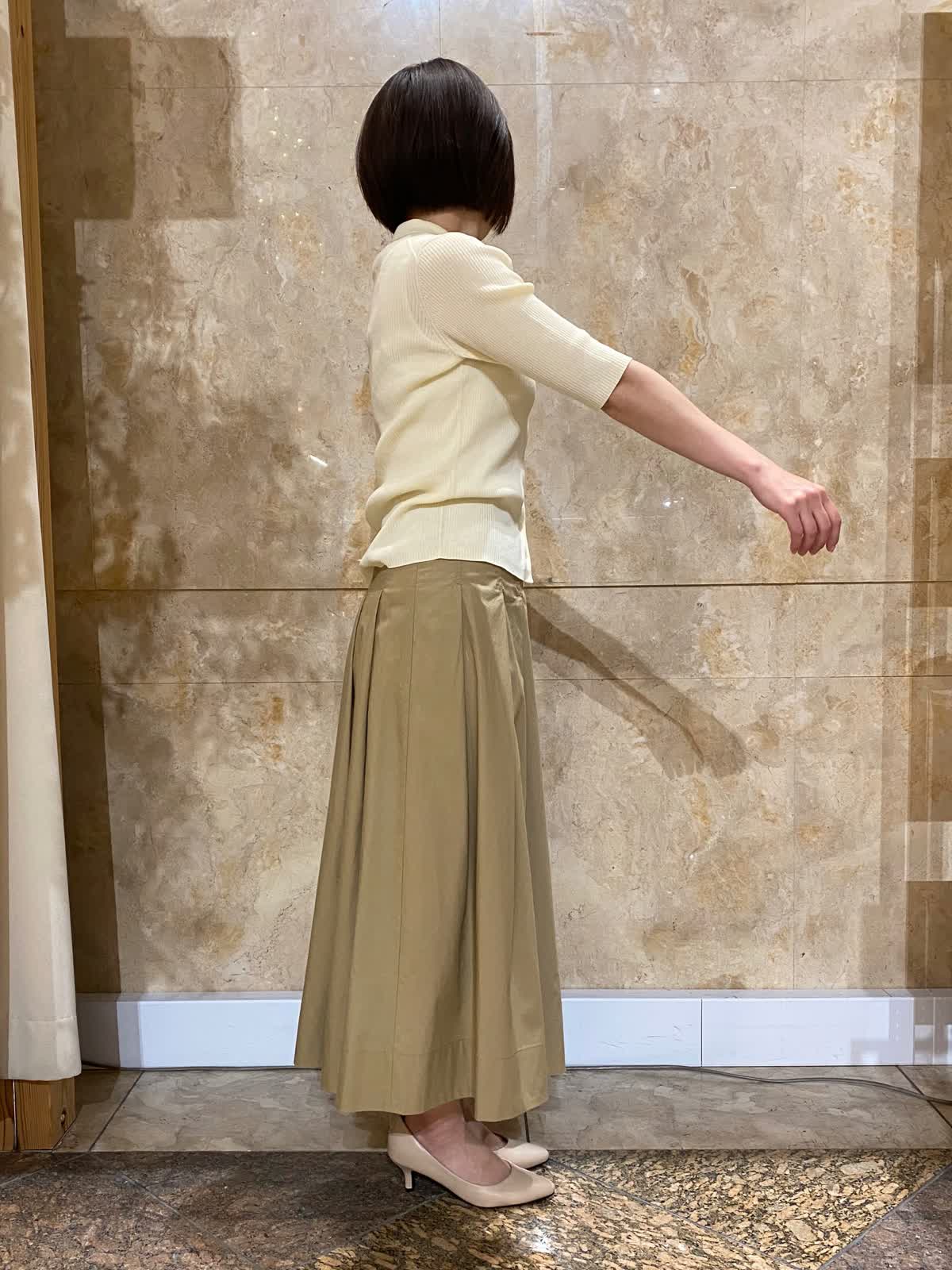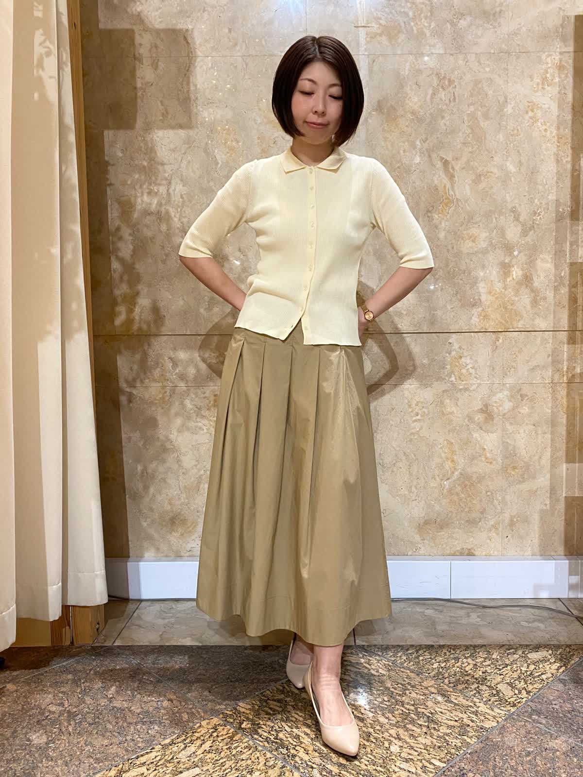 【着用サイズ/カラー】 ニット:フリーサイズ/ イエロー スカート:9号/ ベージュ ポロ襟ニットは春夏のトレンドアイテム。リブですっきりしたシルエットですが、伸びがあり柔らかいので動きやすく着心地が良いです。羽織にもなり、ボタンの開け具合で印象が変わるのでアレンジが効きます。スカートははり感のあるフレアスカート。暑い時期にも涼しく快適。後ろにゴムが入っているのでお腹周りがしんどくなく、上品見えするデザインです。