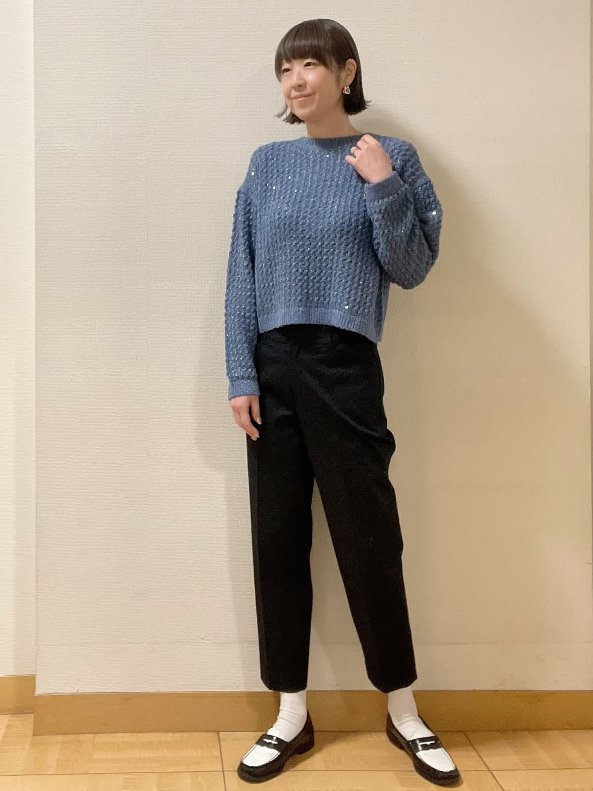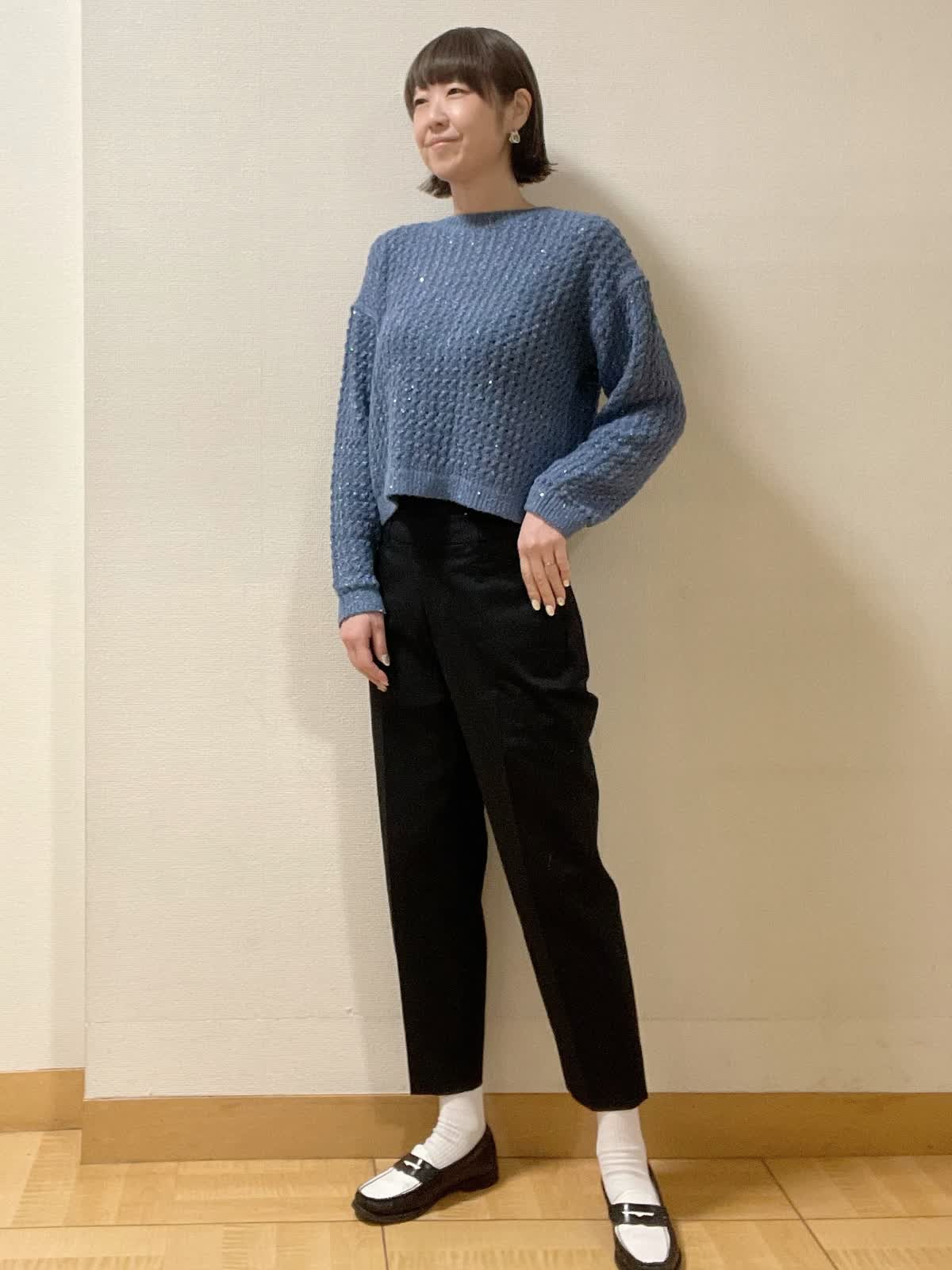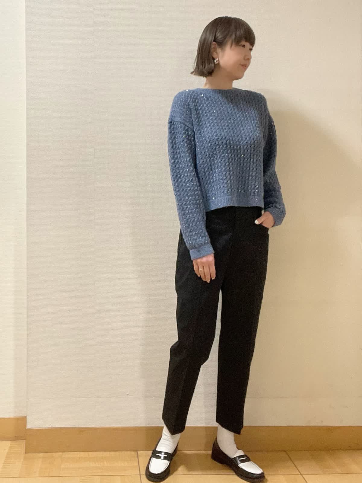 【着用サイズ】共に9号【着用カラー】ニット:サックス パンツ:ブラック さりげないスパンコールがアクセントになるプルオーバーニット。着丈が短めでスッキリした印象に。ベーシックパンツと相性抜群です。
