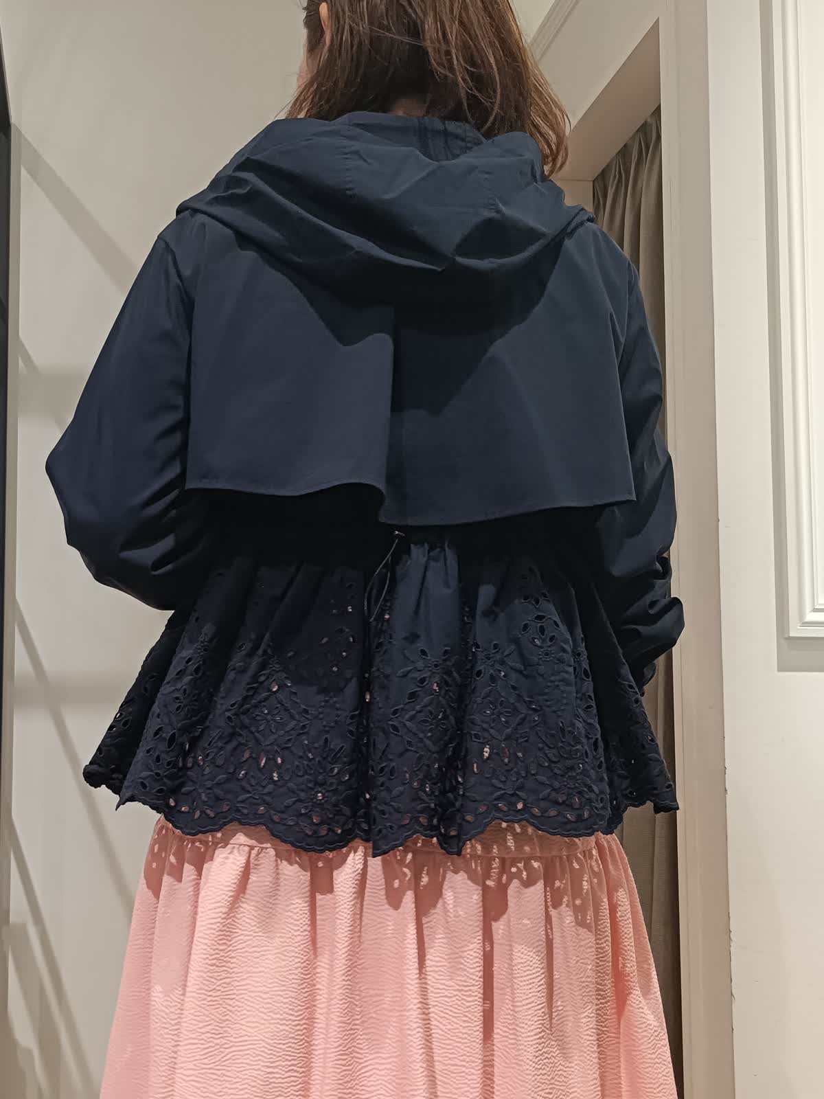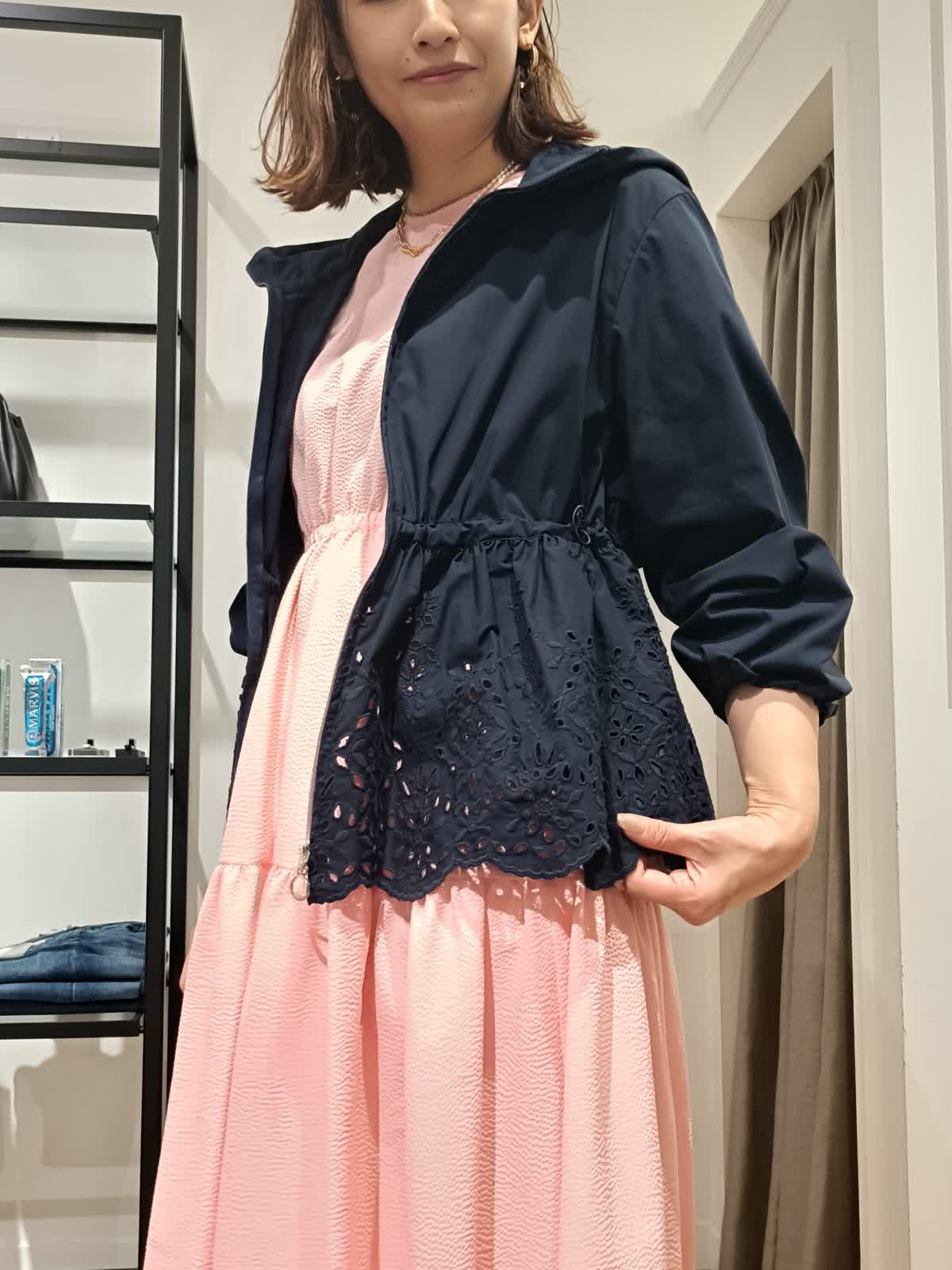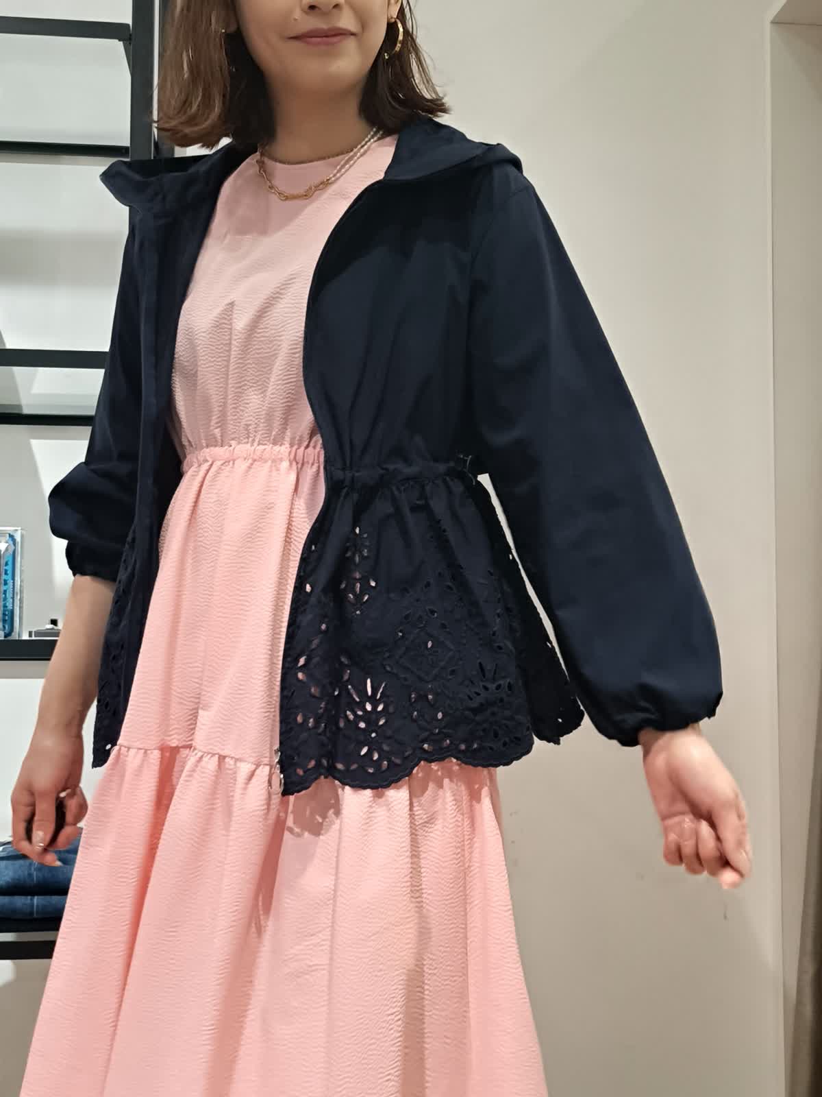 【着用サイズ:カラー】ワンピース:9号:ピンク ブルゾン:9号:ネイビー 大人のためのラッシュガードブルゾン。UVカット、撥水加工が施されたレース素材。ウエスト部分には絞りも付いており、お好きなシルエットに調整できます。フェミニンにも、キレイめカジュアルにもコーディネートしやすいデザインになっています。日差しや、急な雨にも対応できるので、これからの季節にぴったりです。オリジナルピンクのワンピースとあわせて軽やかなコーディネートにしてみました。
