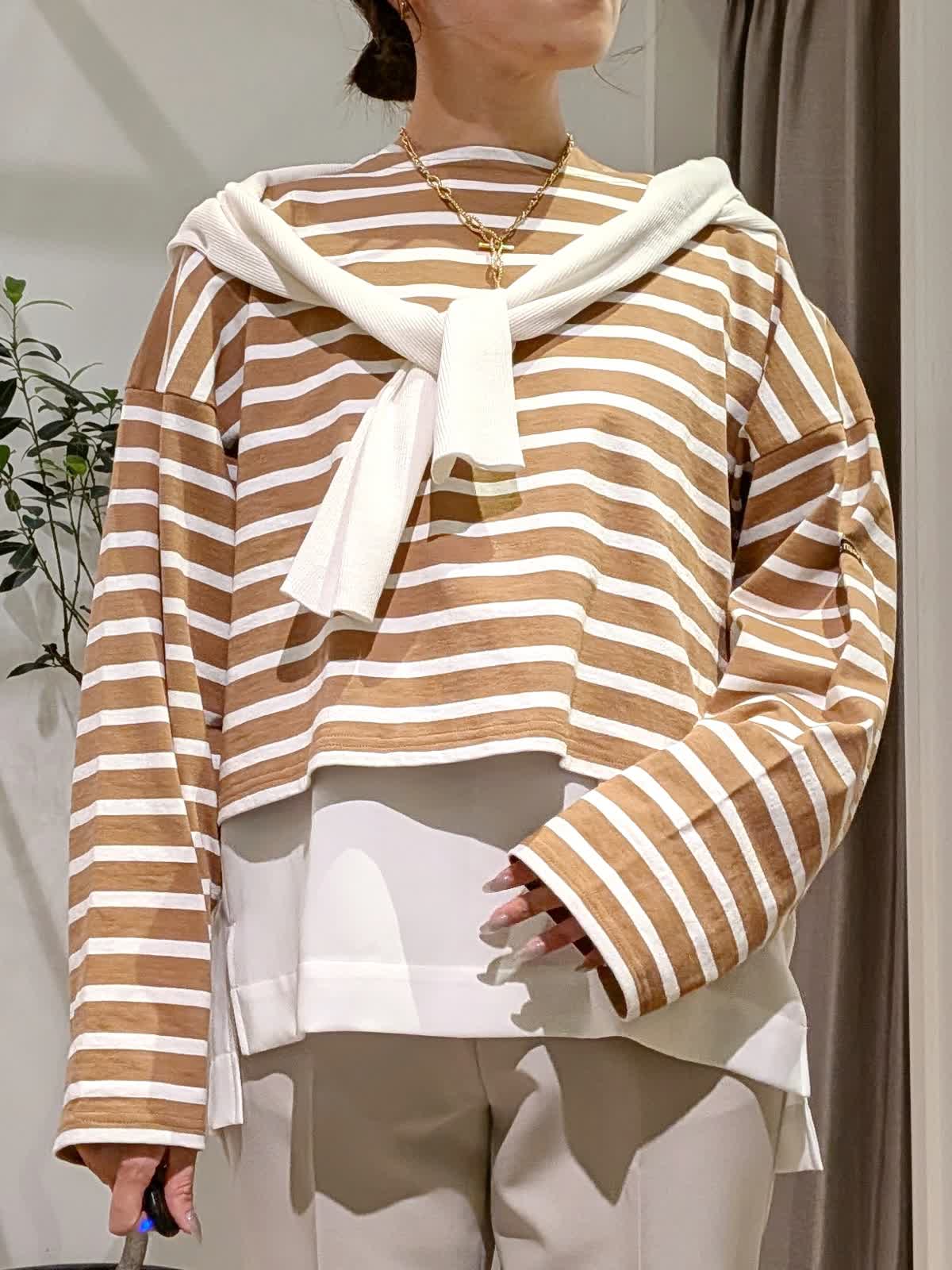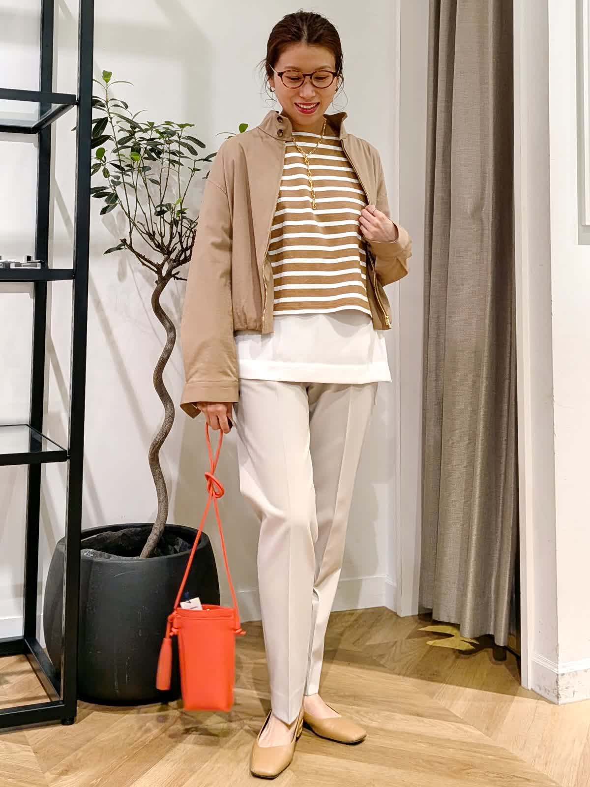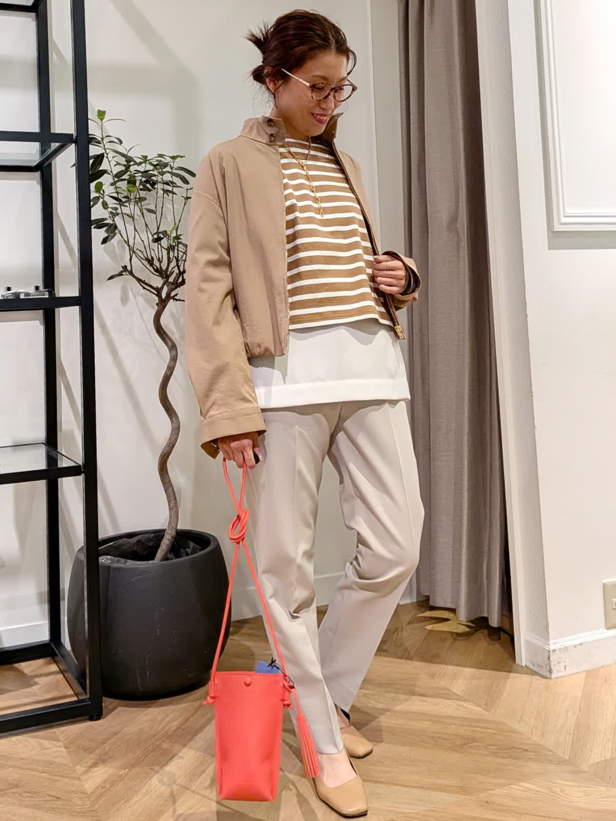 【着用サイズ】ブルゾン、ボーダーカットソー?キャメル ブラウス?オフホワイト パンツ?グレーベージュ?全て9号 スタンドカラーブルゾンは薄手で軽量。ちょっとした羽織に大活躍する一着。 丈感はコンパクトですがしっかり着込めるタイプ。ボーダーカットソーは一枚で着ても可愛いですがヒップ周りをカバーする為お洒落感UPする為ブラウスをレイヤードしてみまた。 今年最後になる?!美脚シリーズは安定の美しさ。野外イベントなどでも活躍するコーデにしてみました。