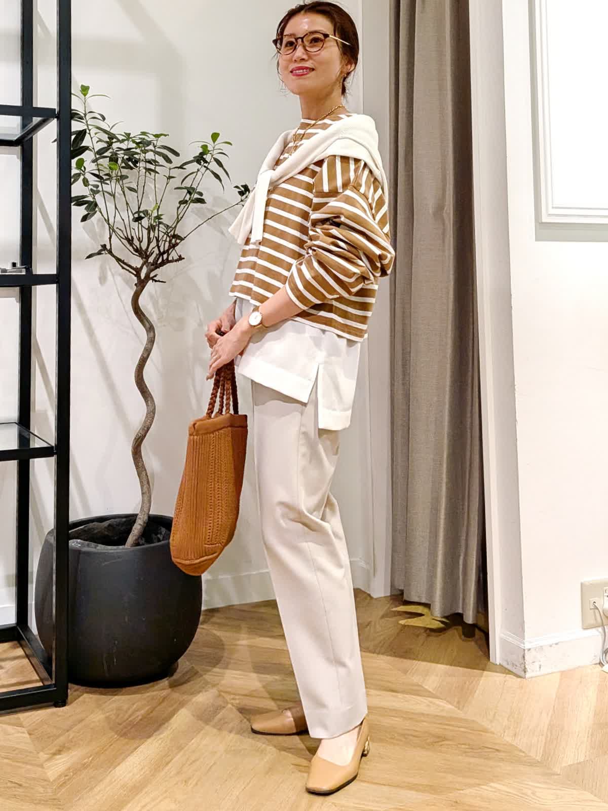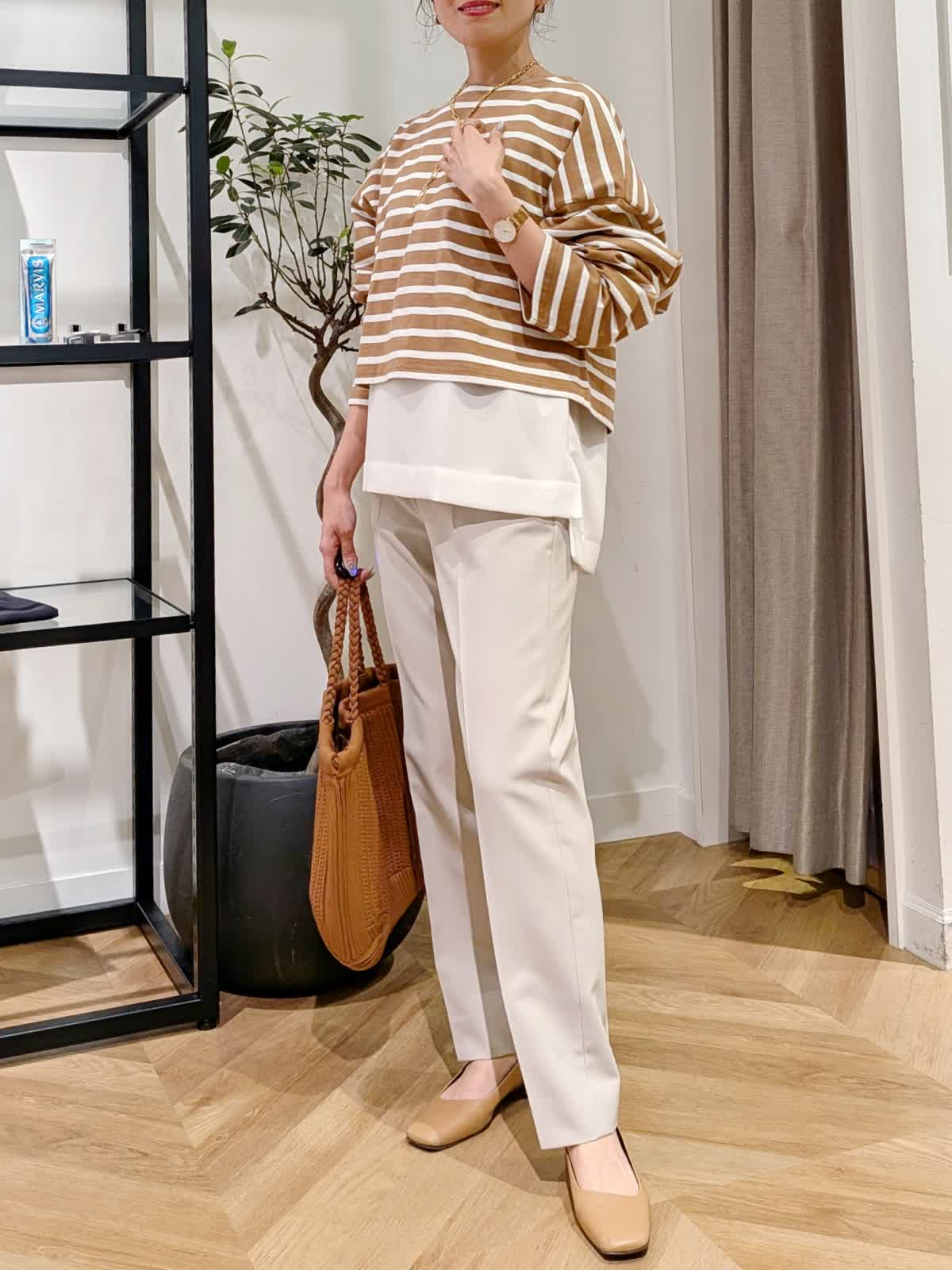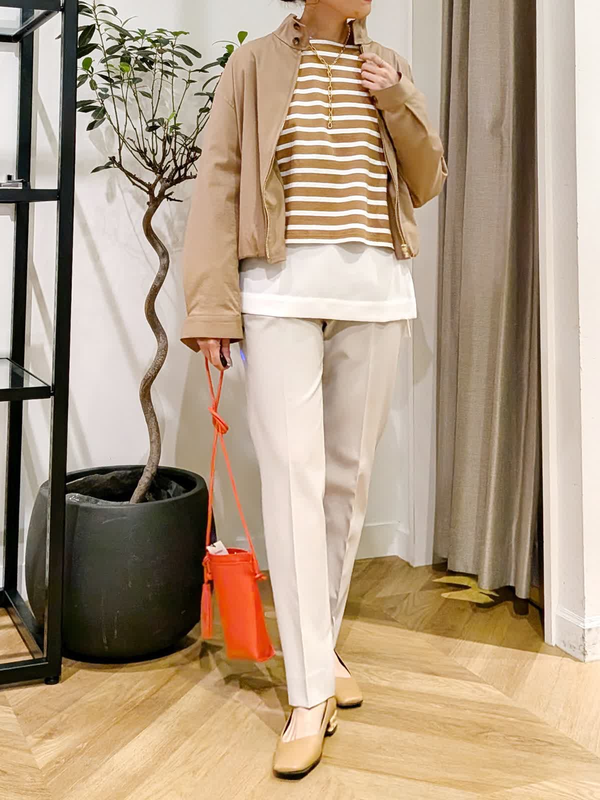【着用サイズ】ブルゾン、ボーダーカットソー?キャメル ブラウス?オフホワイト パンツ?グレーベージュ?全て9号 スタンドカラーブルゾンは薄手で軽量。ちょっとした羽織に大活躍する一着。 丈感はコンパクトですがしっかり着込めるタイプ。ボーダーカットソーは一枚で着ても可愛いですがヒップ周りをカバーする為お洒落感UPする為ブラウスをレイヤードしてみまた。 今年最後になる?!美脚シリーズは安定の美しさ。野外イベントなどでも活躍するコーデにしてみました。