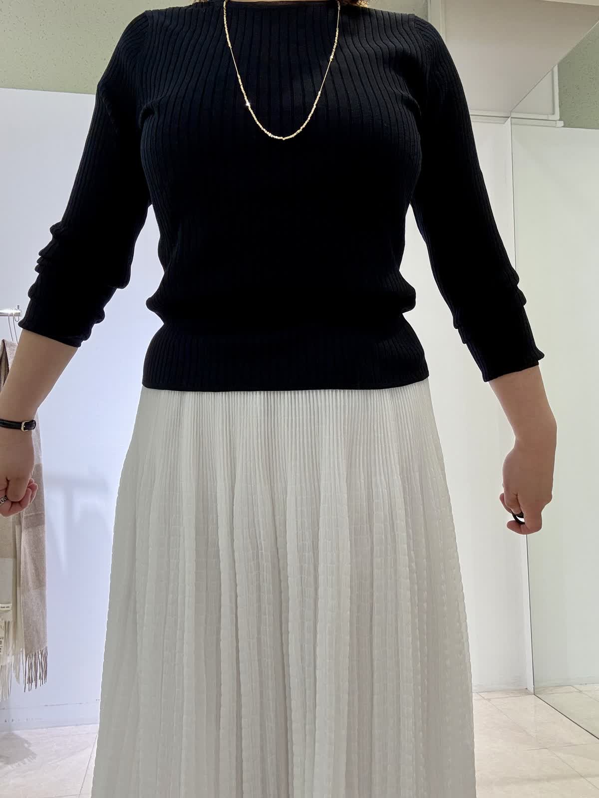 デニムジャケット着用サイズ 9号 ノーカラーのデザインです。ショート丈でボリュームがあるボトムスと相性が良いです。腕周りなど余裕がありストレッチが効いていて窮屈さがないです! ニット着用サイズ 11号 シルクが混入しているリブのシンプルなニットです。お洗濯可能です。 スカート着用サイズ 9号 透け感もなく安心して白を着られます。いつもは11号ですがこちらは9号で大丈夫でした