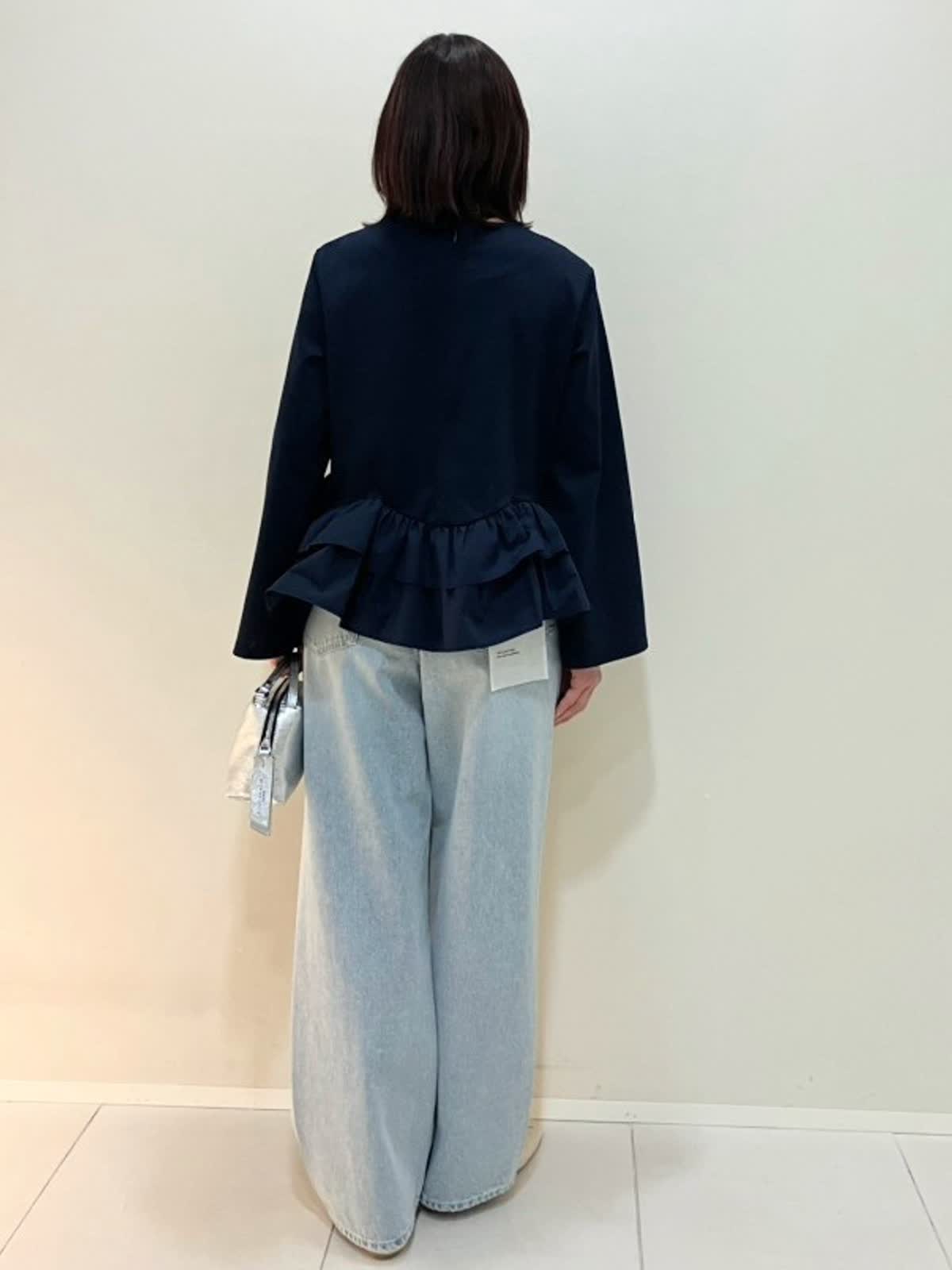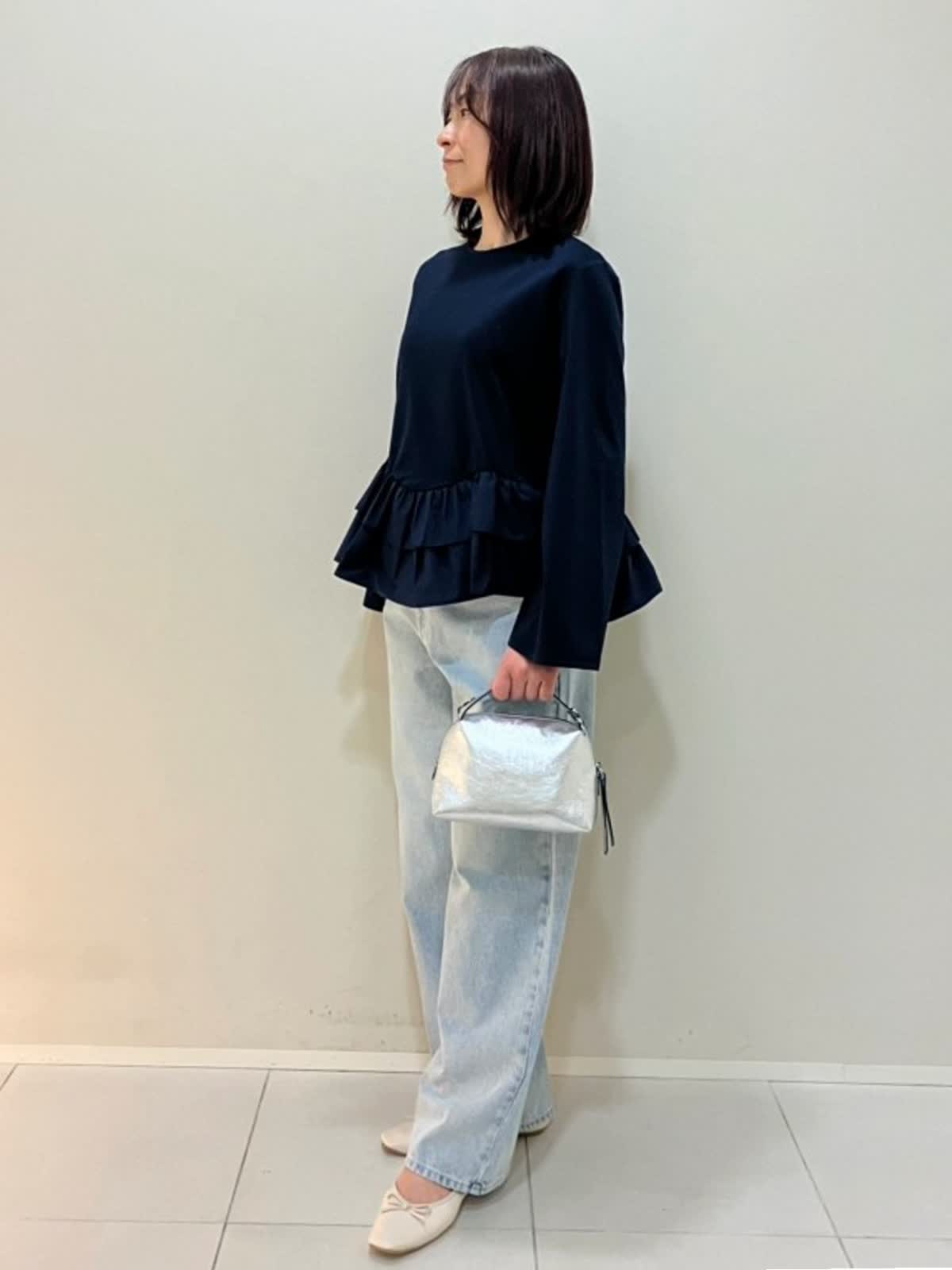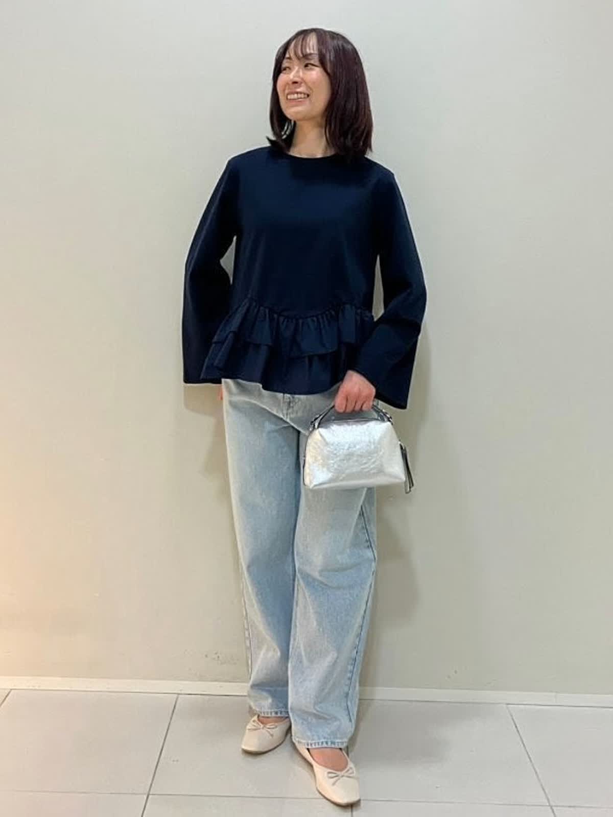 【着用サイズ】カットソー:フリー パンツ:9号【着用カラー】カットソー:ネイビー パンツ:サックス 春のデニムスタイル 裾フリルが華やかなカットソーは、伸縮性があり着心地が良く、足長効果のあるアイテム。デニムと合わせると可愛さが抑えられ、軽やかな雰囲気で着ていただけます。