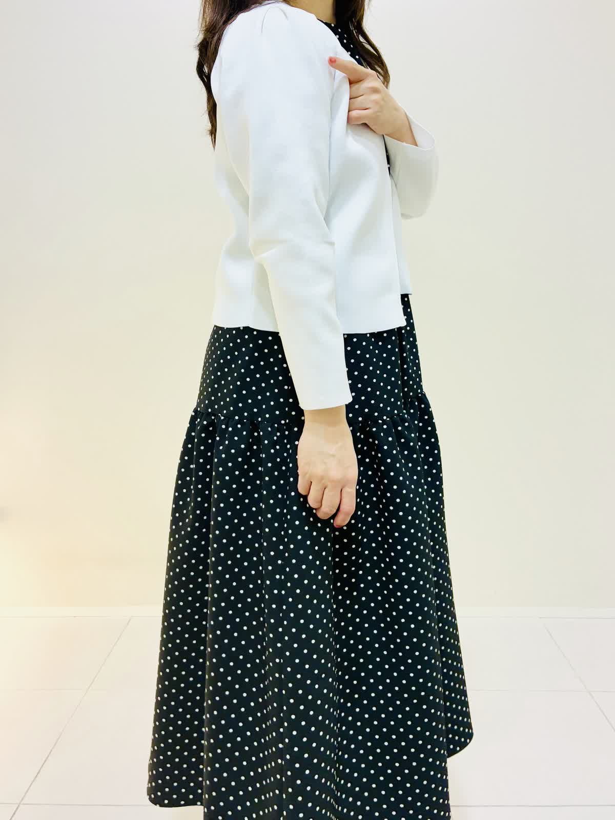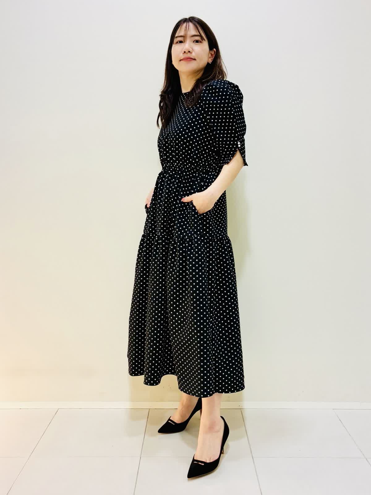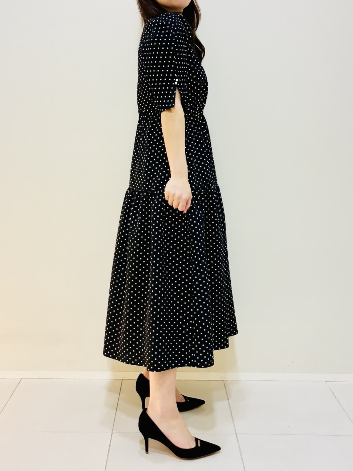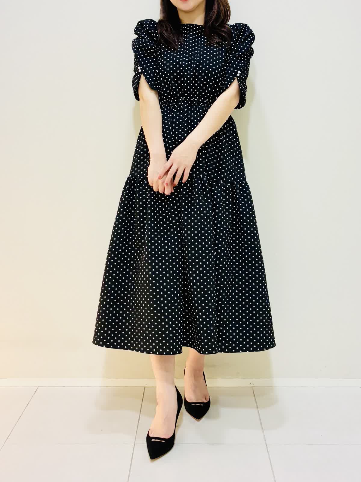 【着用サイズ】 ワンピース:ブラック:9号サイズ カーディガン:オフホワイト:9号サイズ 『ワンピースコーデ』 半袖がかわいいドットのワンピースです。 程よく薄くてサラリと生地で、ウエストが柔らかいゴムなので着心地もすごくいいです。 肩のボリュームもあり一枚でサマになるワンピースにロゴ刺繍のカーディガンを合わせました。ワンピースだけだと肌寒い時期にピッタリです。 スニーカー合わせでカジュアルミックスコーデもおすすめです。