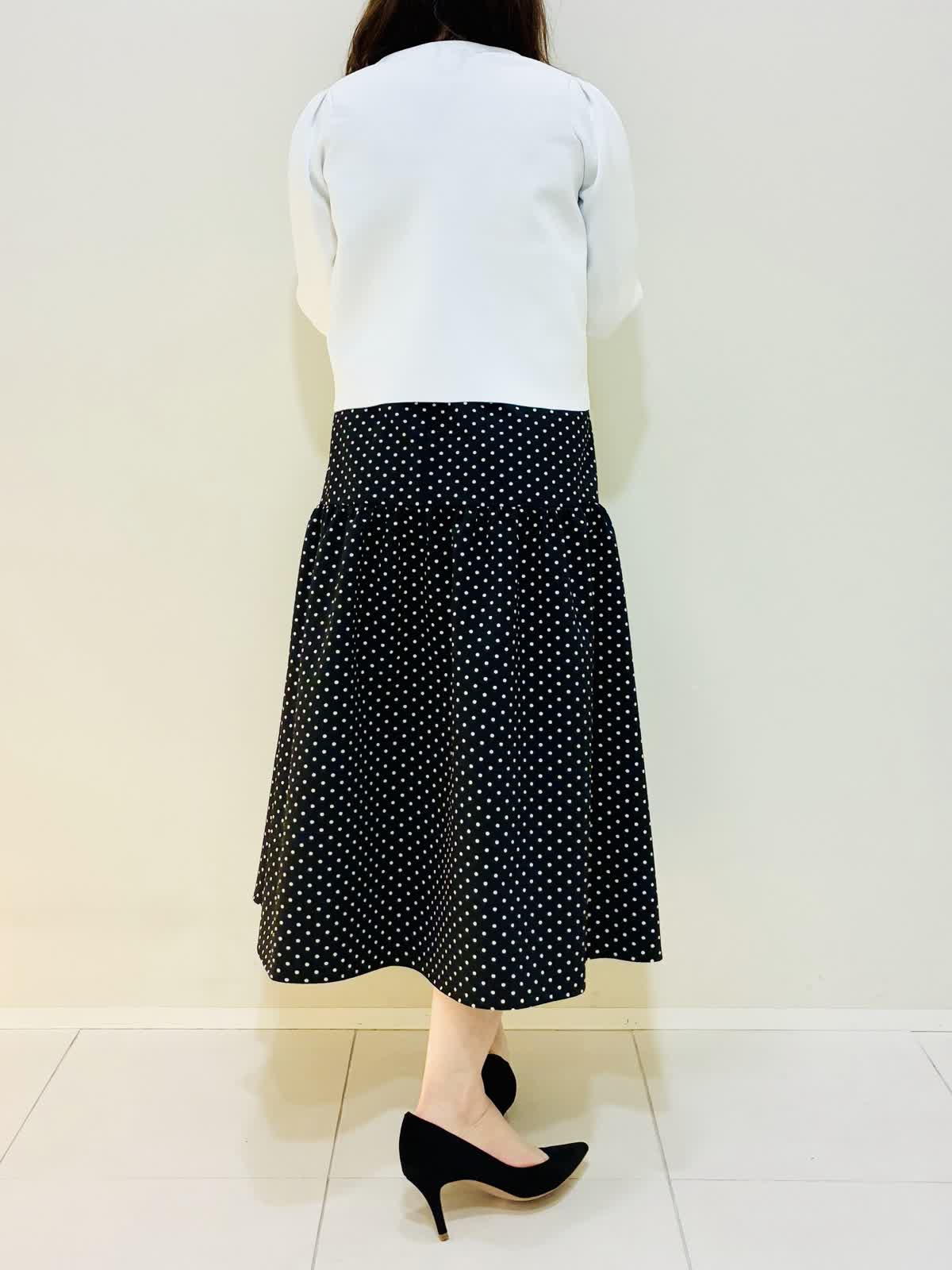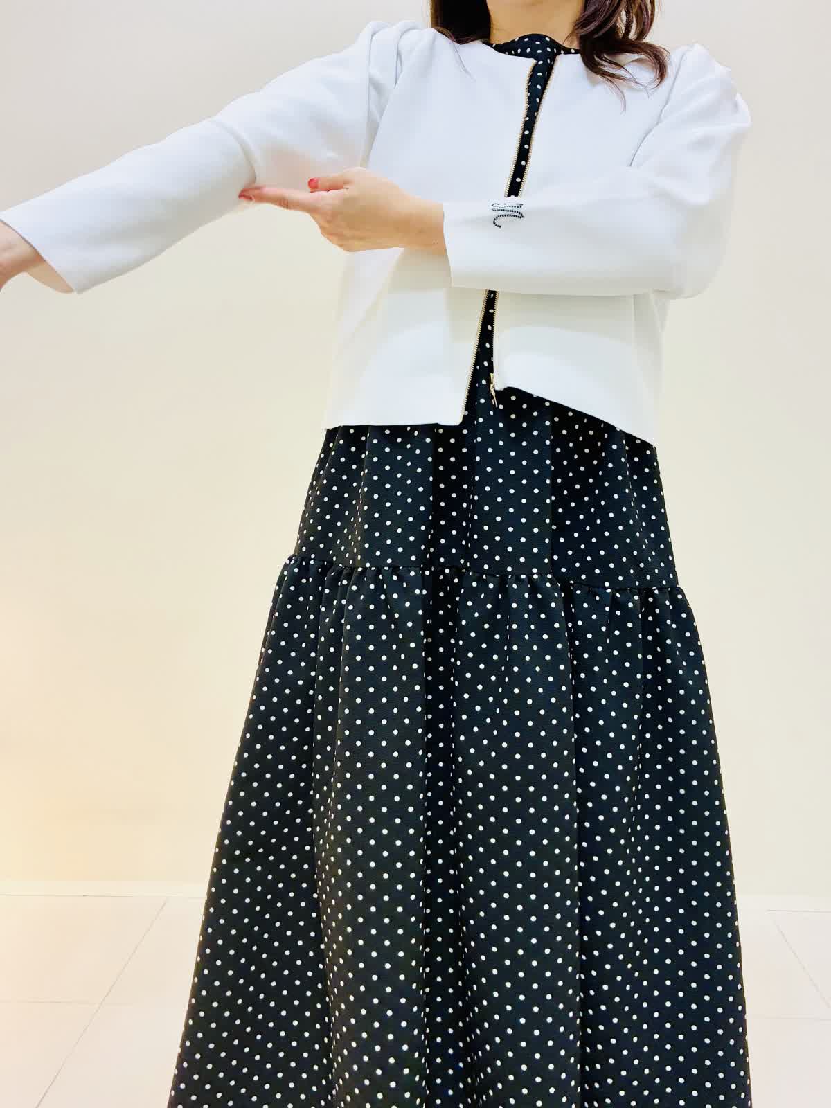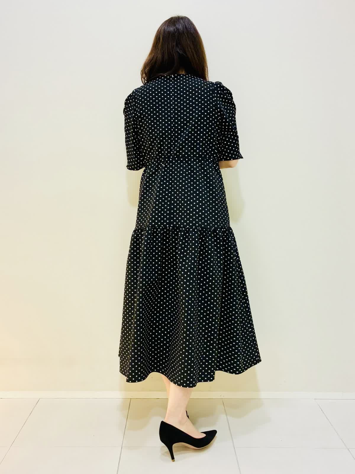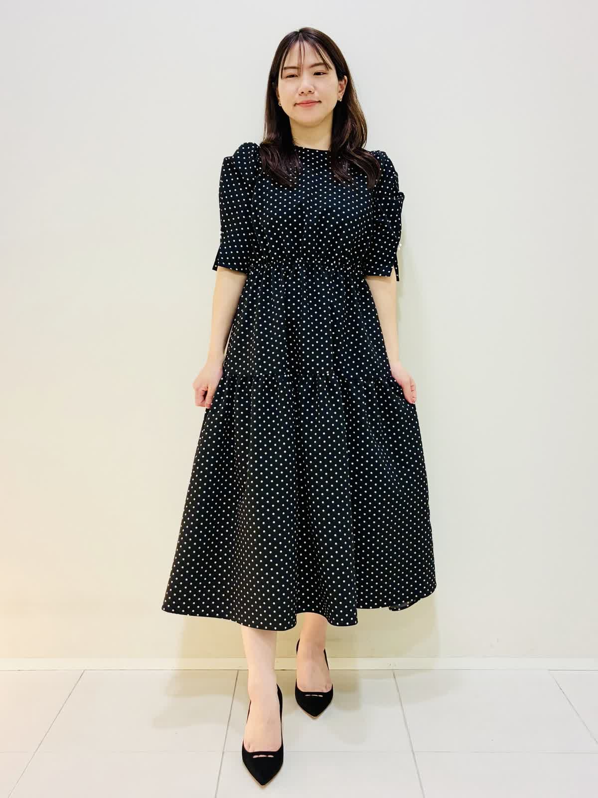 【着用サイズ】 ワンピース:ブラック:9号サイズ カーディガン:オフホワイト:9号サイズ 『ワンピースコーデ』 半袖がかわいいドットのワンピースです。 程よく薄くてサラリと生地で、ウエストが柔らかいゴムなので着心地もすごくいいです。 肩のボリュームもあり一枚でサマになるワンピースにロゴ刺繍のカーディガンを合わせました。ワンピースだけだと肌寒い時期にピッタリです。 スニーカー合わせでカジュアルミックスコーデもおすすめです。