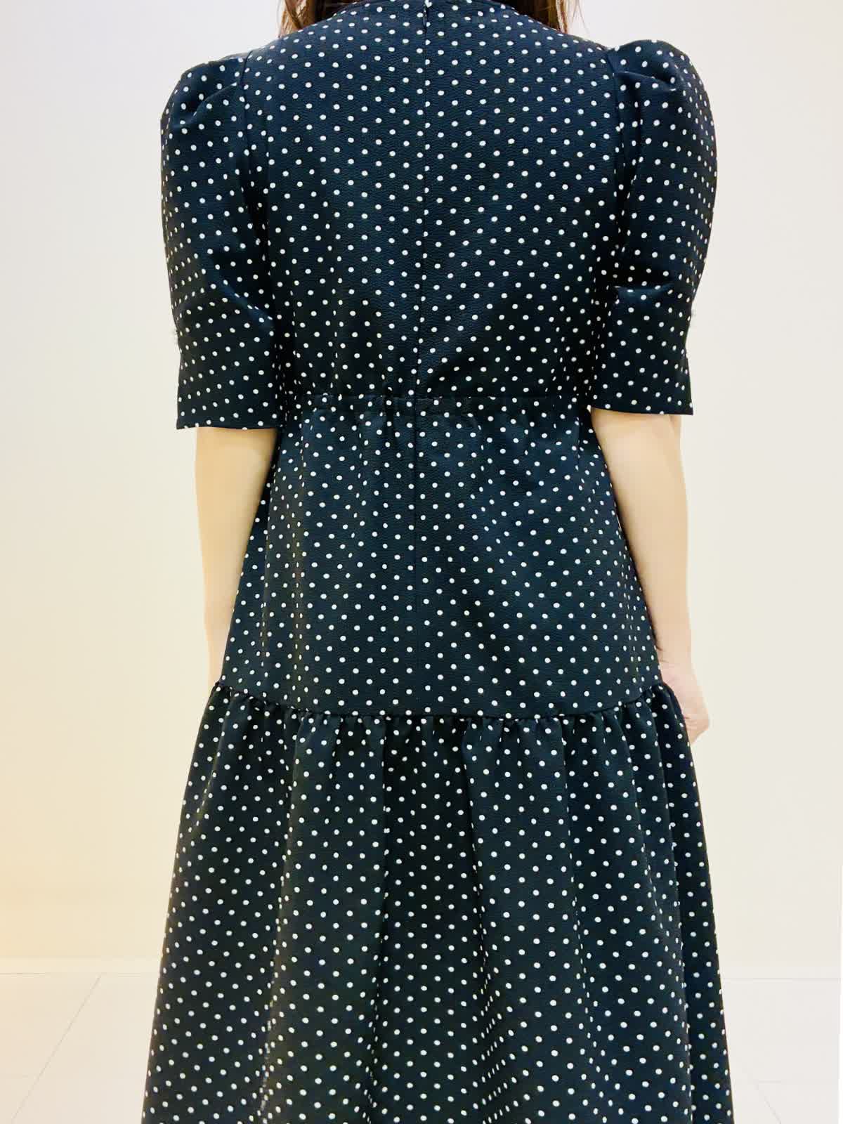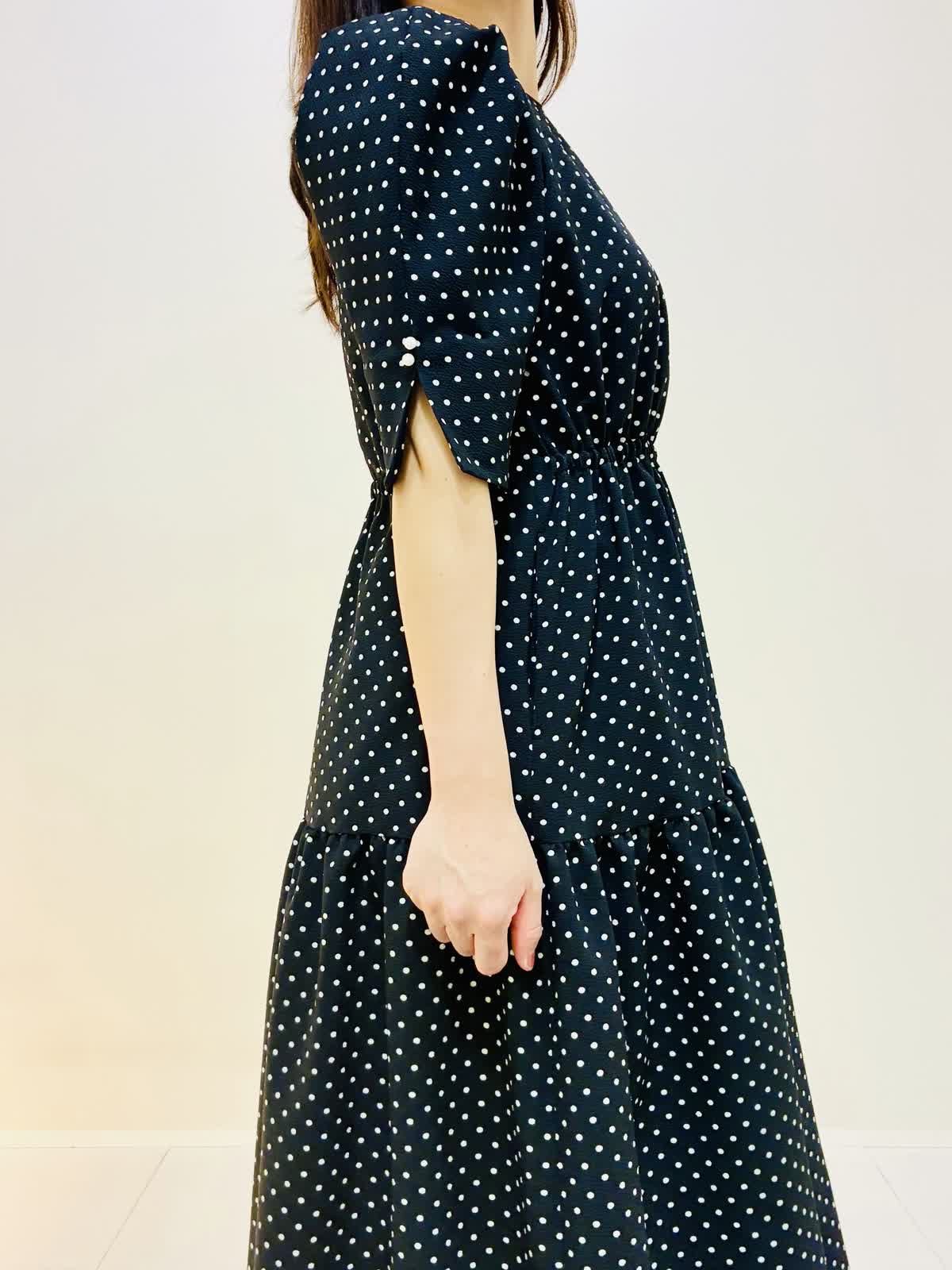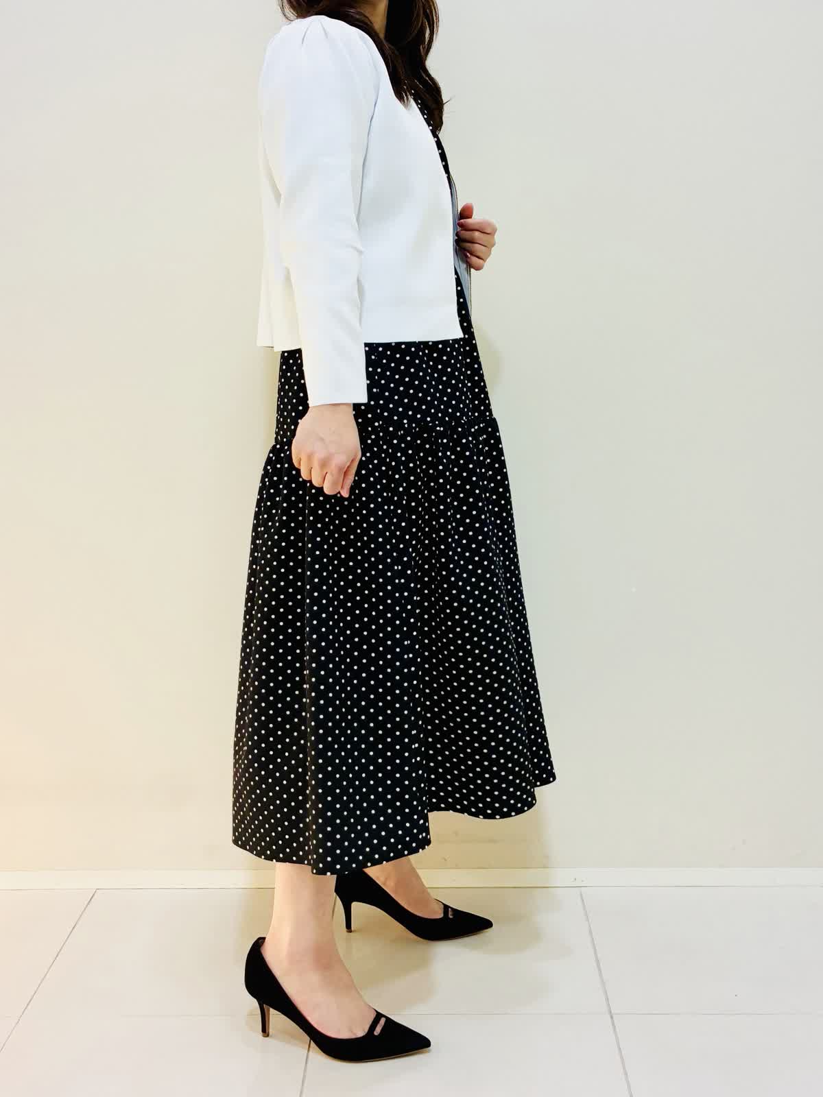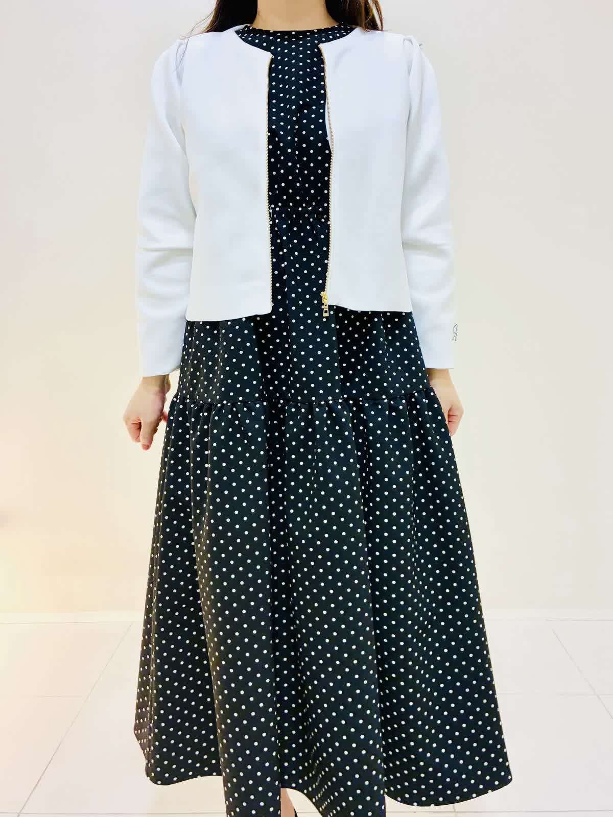 【着用サイズ】 ワンピース:ブラック:9号サイズ カーディガン:オフホワイト:9号サイズ 『ワンピースコーデ』 半袖がかわいいドットのワンピースです。 程よく薄くてサラリと生地で、ウエストが柔らかいゴムなので着心地もすごくいいです。 肩のボリュームもあり一枚でサマになるワンピースにロゴ刺繍のカーディガンを合わせました。ワンピースだけだと肌寒い時期にピッタリです。 スニーカー合わせでカジュアルミックスコーデもおすすめです。