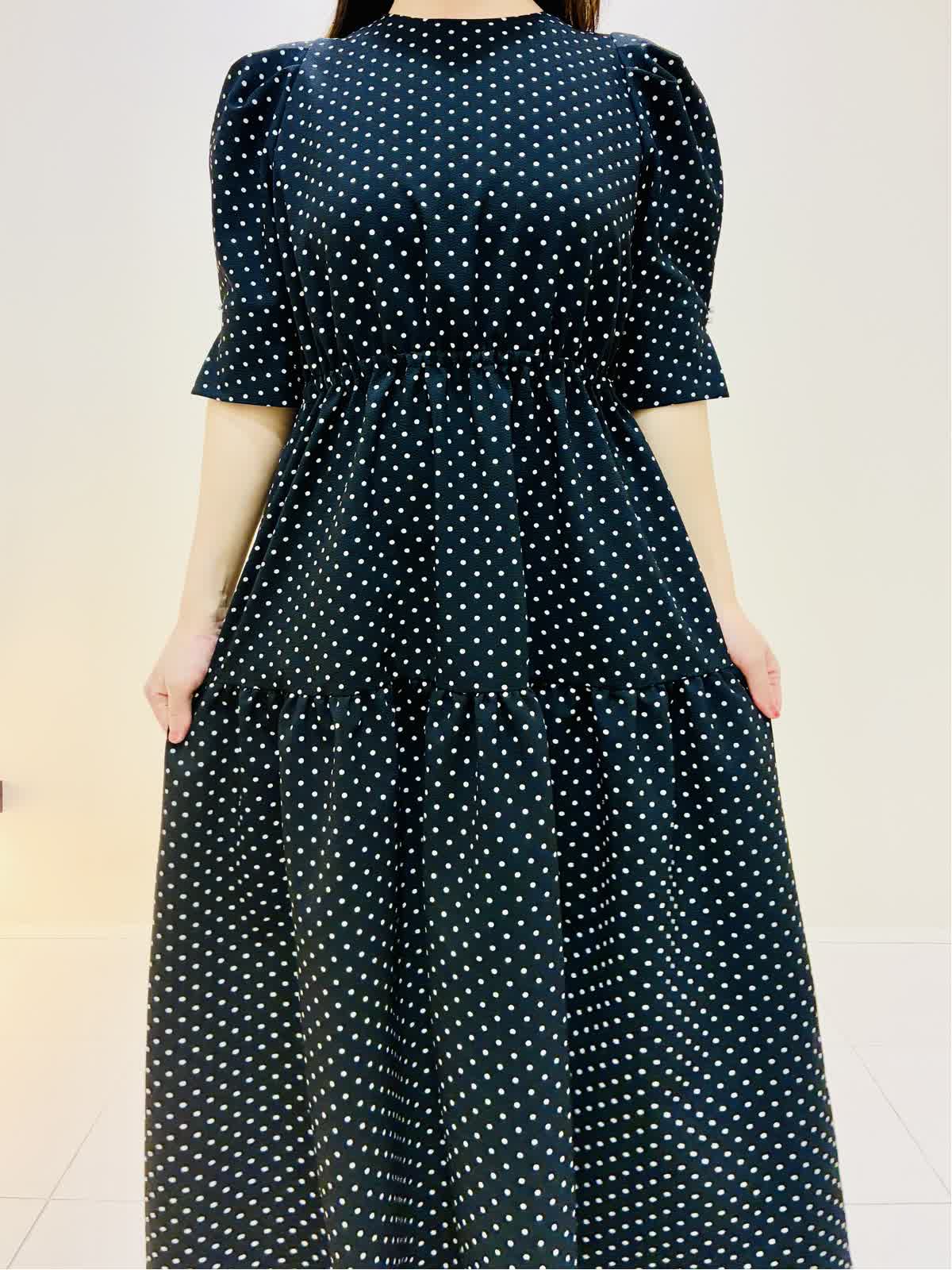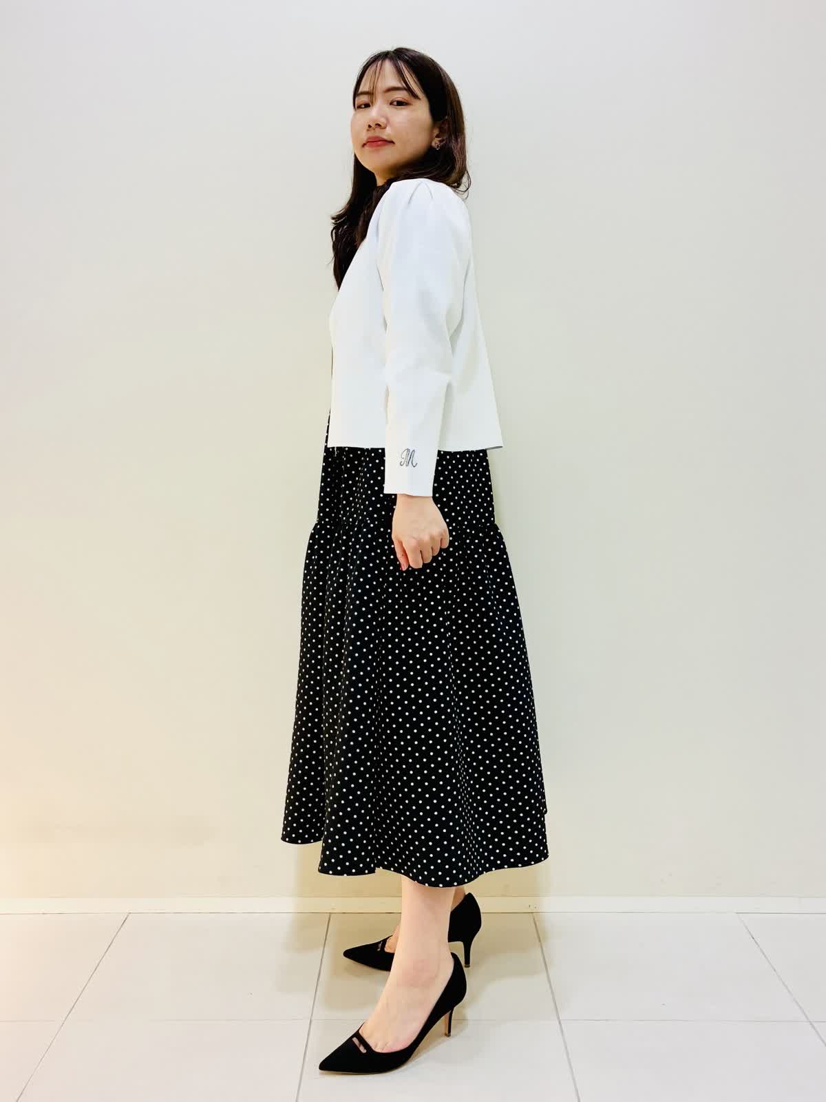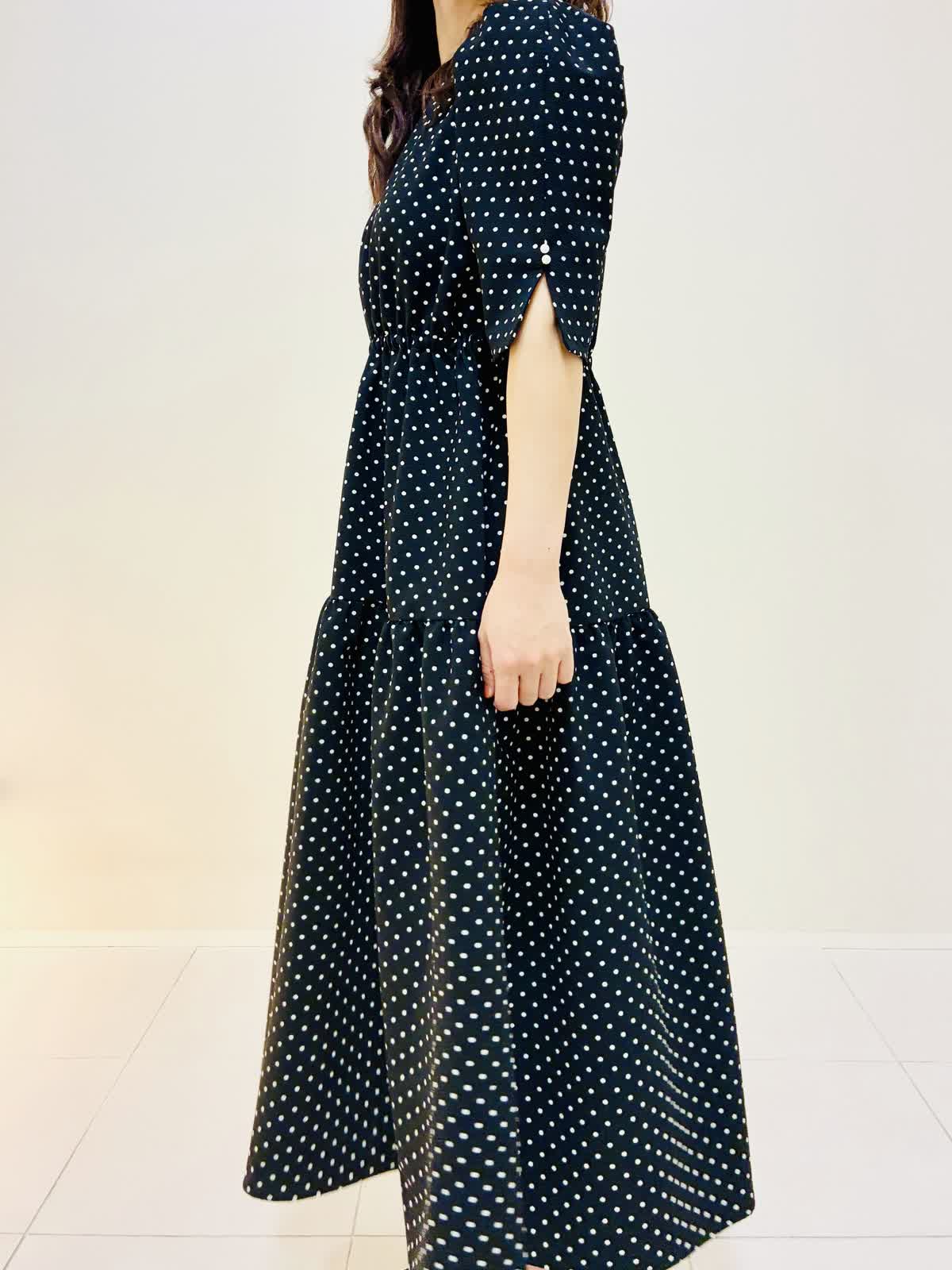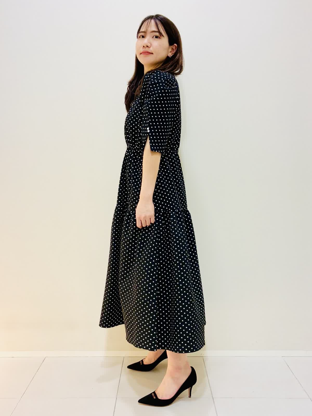 【着用サイズ】 ワンピース:ブラック:9号サイズ カーディガン:オフホワイト:9号サイズ 『ワンピースコーデ』 半袖がかわいいドットのワンピースです。 程よく薄くてサラリと生地で、ウエストが柔らかいゴムなので着心地もすごくいいです。 肩のボリュームもあり一枚でサマになるワンピースにロゴ刺繍のカーディガンを合わせました。ワンピースだけだと肌寒い時期にピッタリです。 スニーカー合わせでカジュアルミックスコーデもおすすめです。