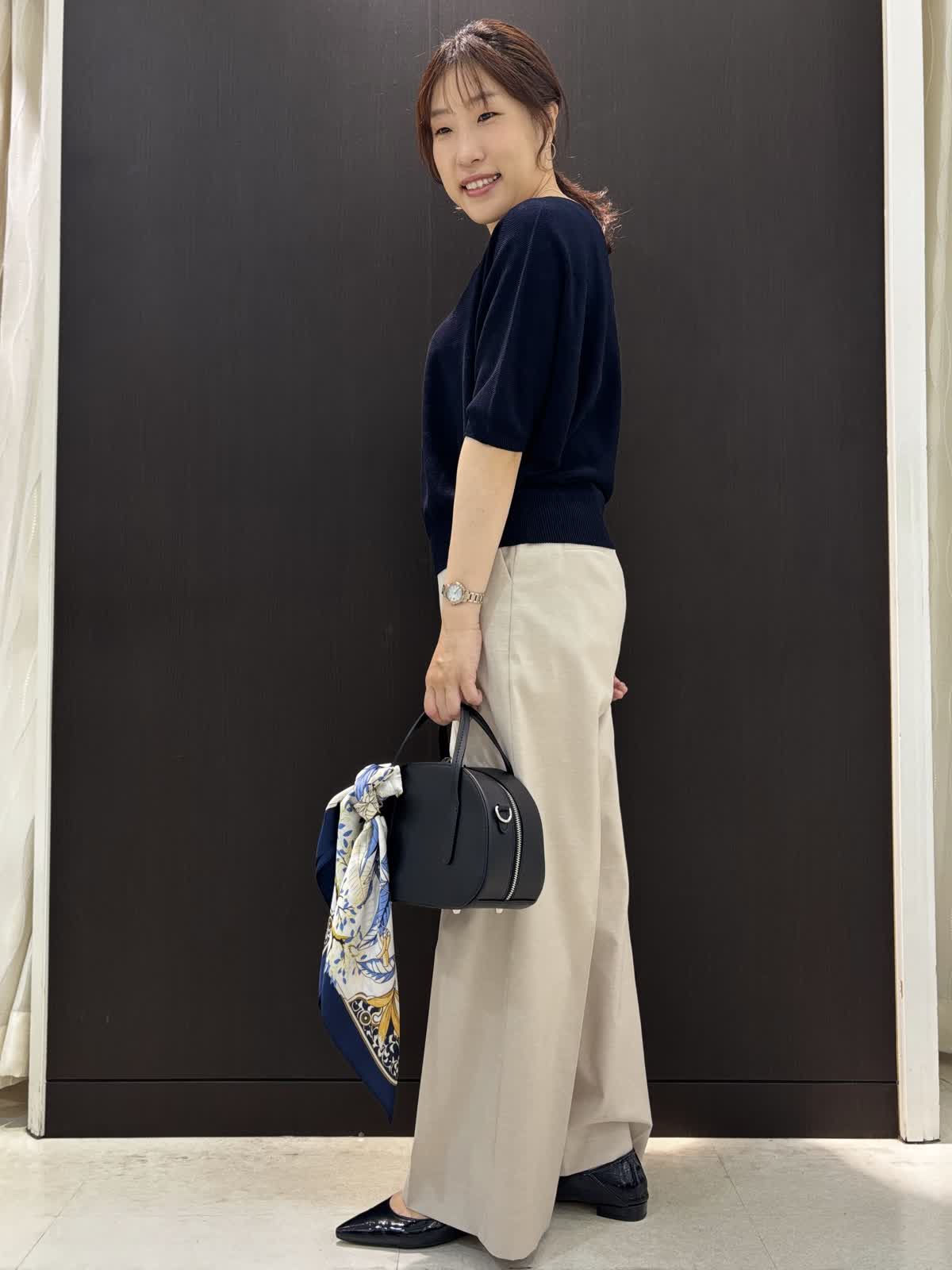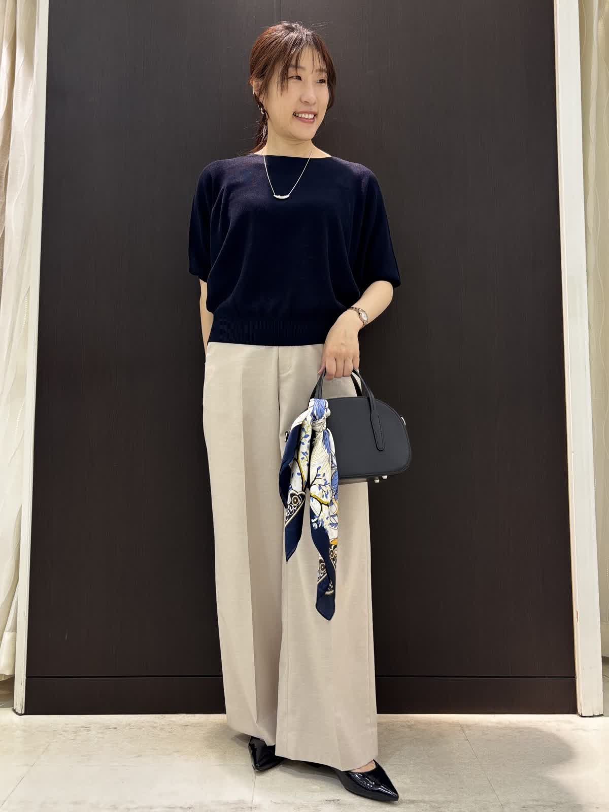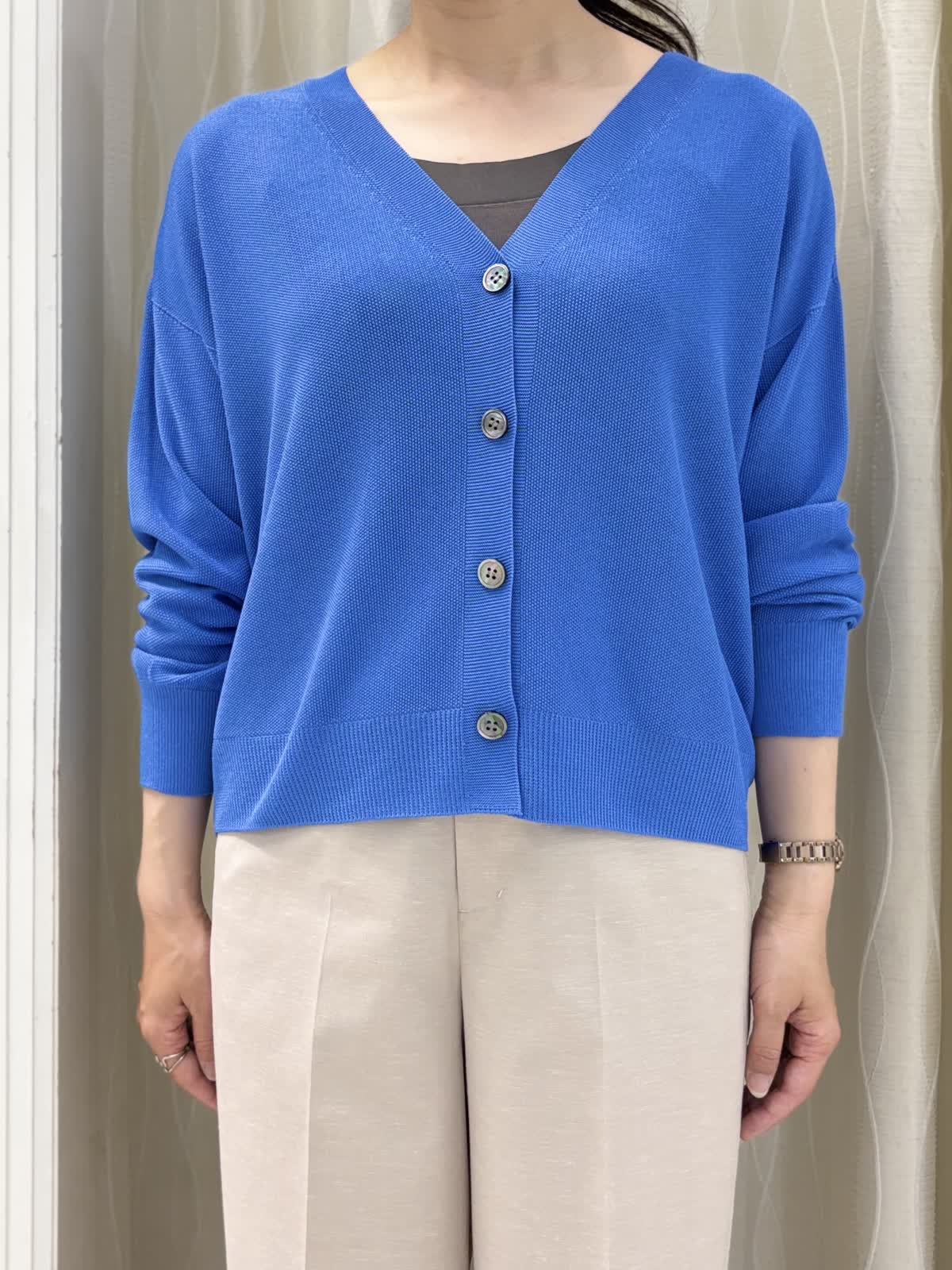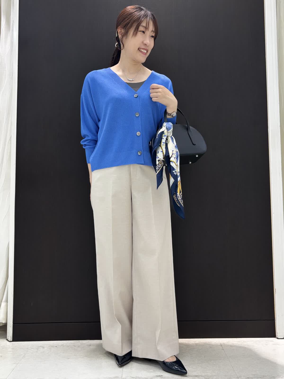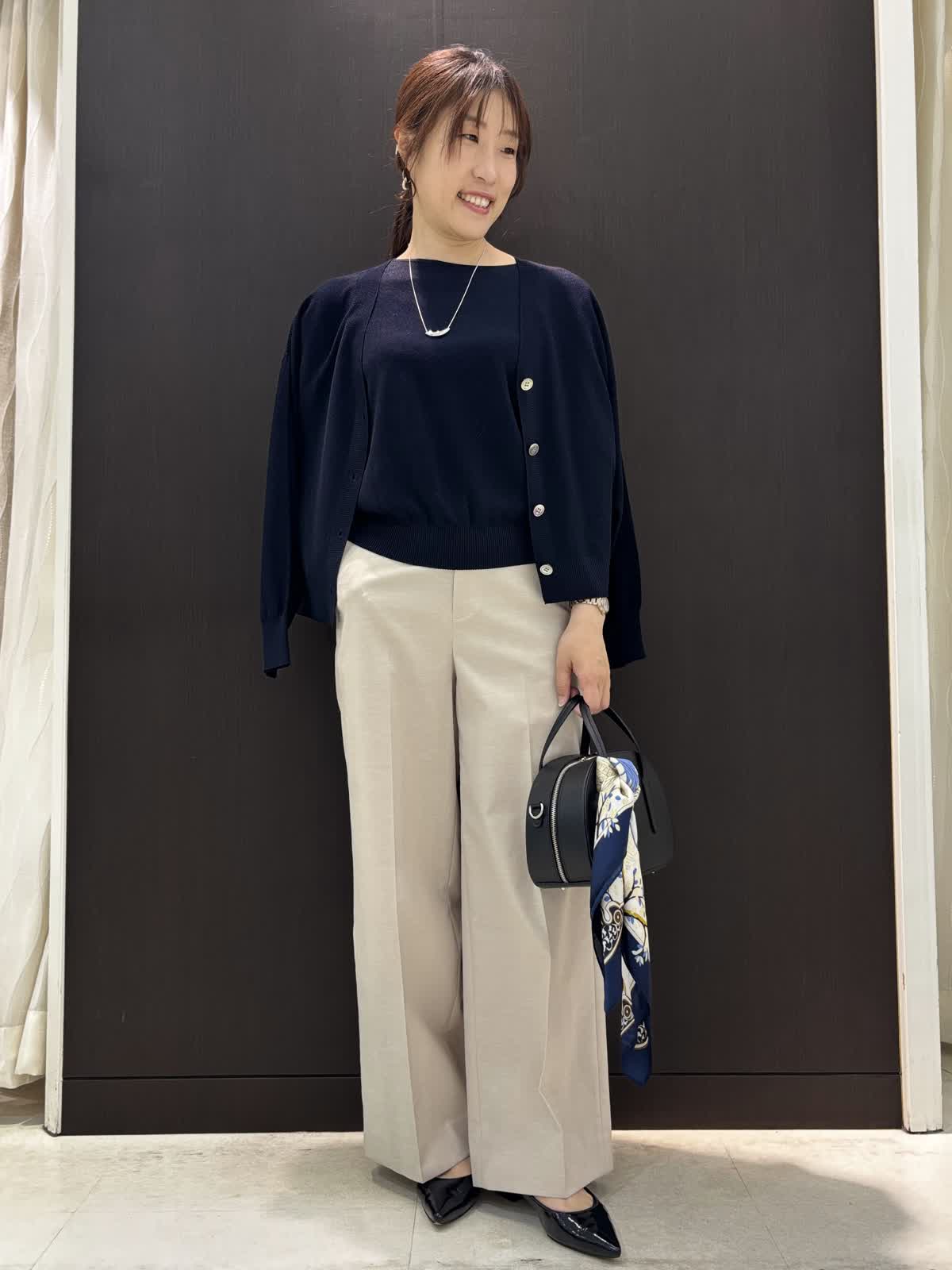 【着用カラー】ニット:ダークネイビー カーディガン:ダークネイビー、ブルー パンツ:ベージュ