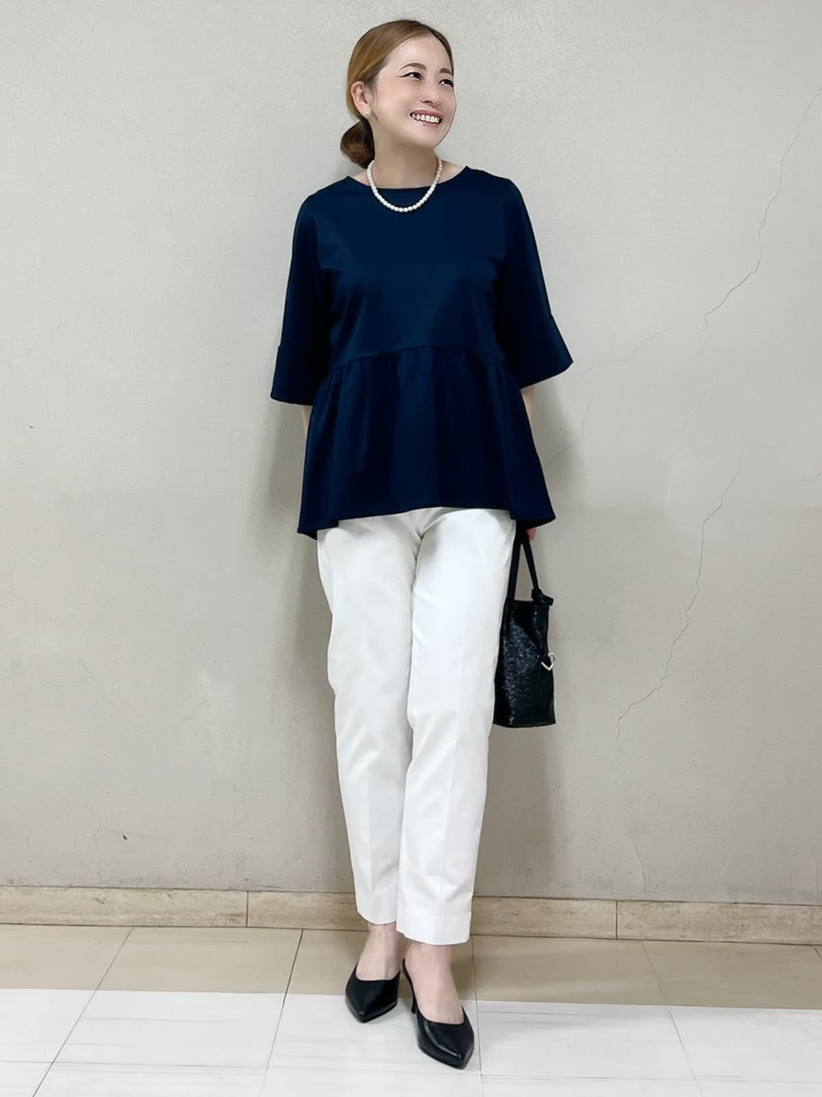 お食事会におすすめのスタイリングです。カットソーはUVカット&接触冷感素材で、これからの季節も快適に着れます。ペプラムシルエットで腰まわりをカバーしつつ、自然にスタイルアップも叶います。ホワイトパンツを合わせて、重たくならず軽やかな印象に。美脚効果のあるパンツはサイズとカラーが豊富なのでお気に入りが見つかると思います。きちんと感もありながら、デイリーにも使いやすい万能コーディネートです。