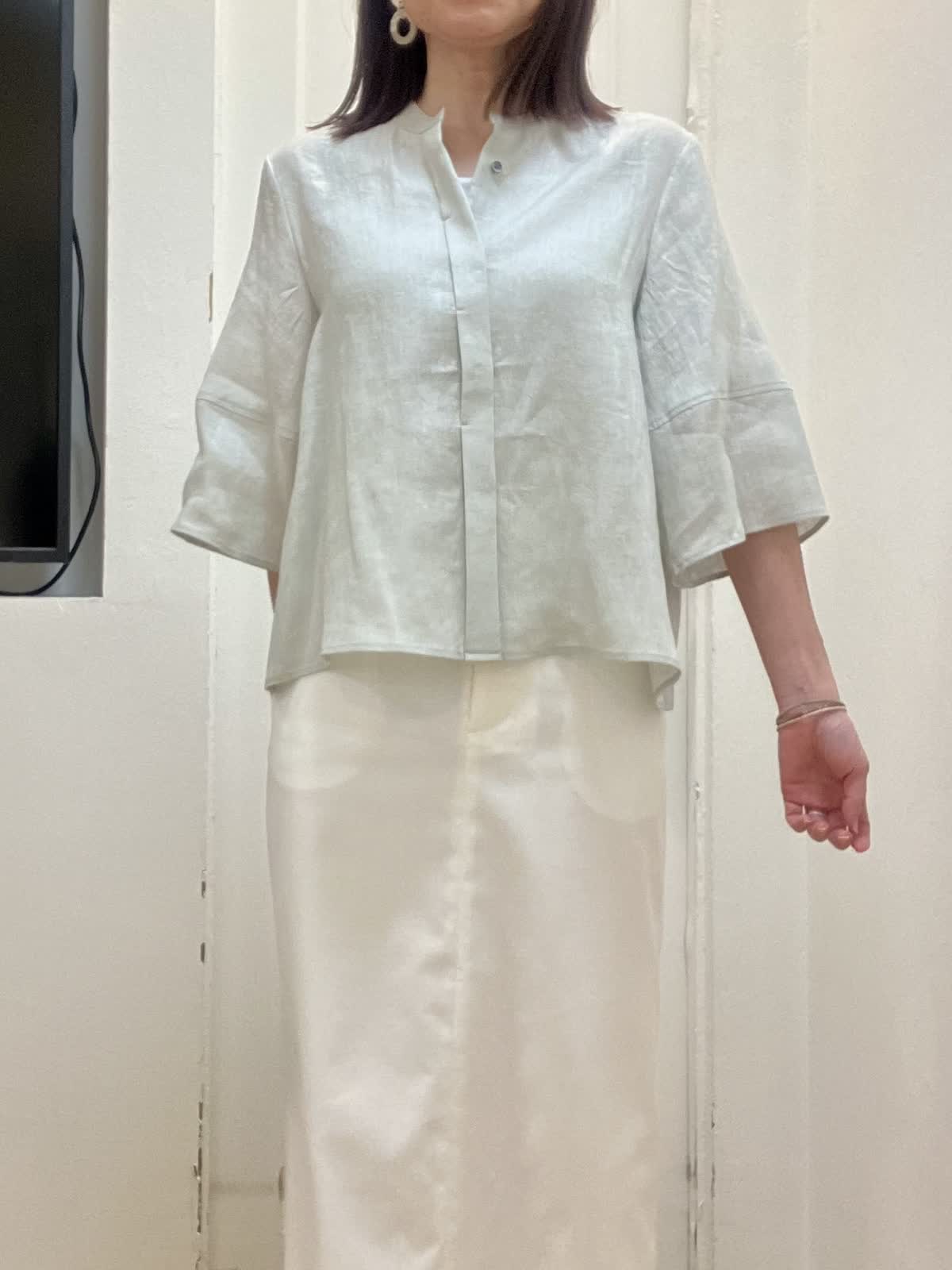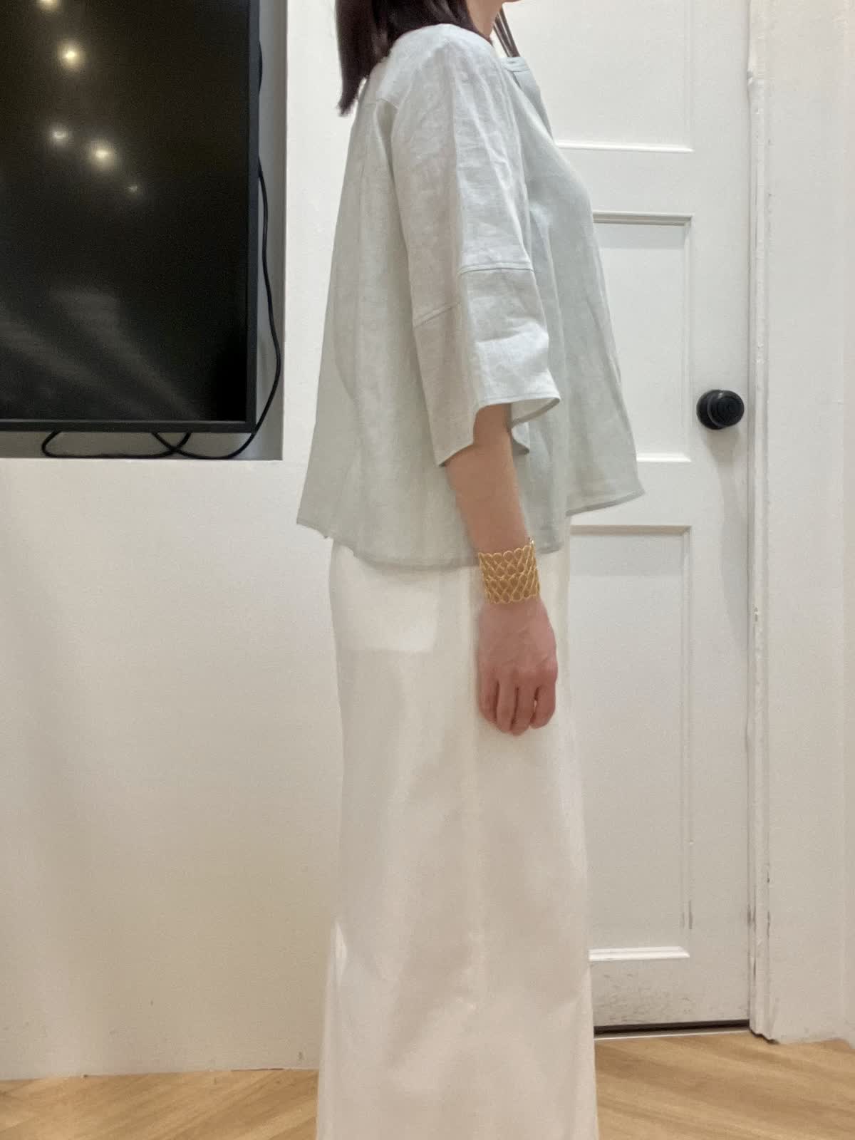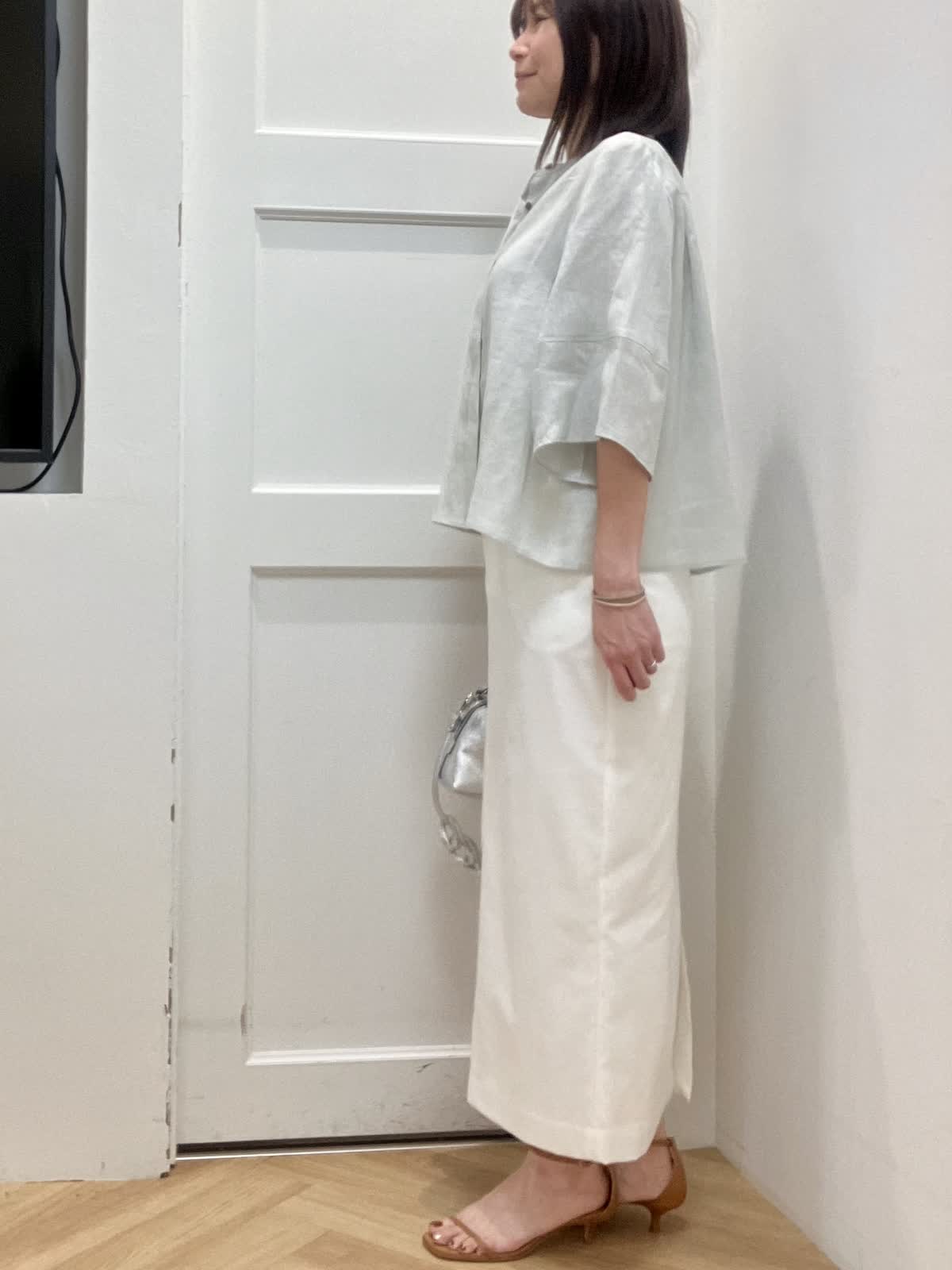 【着用サイズ】全て9号 【着用カラー】ブラウス:ペールグリーン スカート:オフホワイト 初夏のリネンお出掛けスタイル 昨年即完売したリネンコクーンシリーズ。今年は着丈を少し長めに変更し、よりバランスが取りやすくなりました。ふんわり袖デザインと裾が少し広がるシルエットで真夏もとても涼しいです。 シンプルなタイトスカートは着回し力抜群! 綿麻混なので夏場まで着回せます。スニーカー合わせも素敵です。