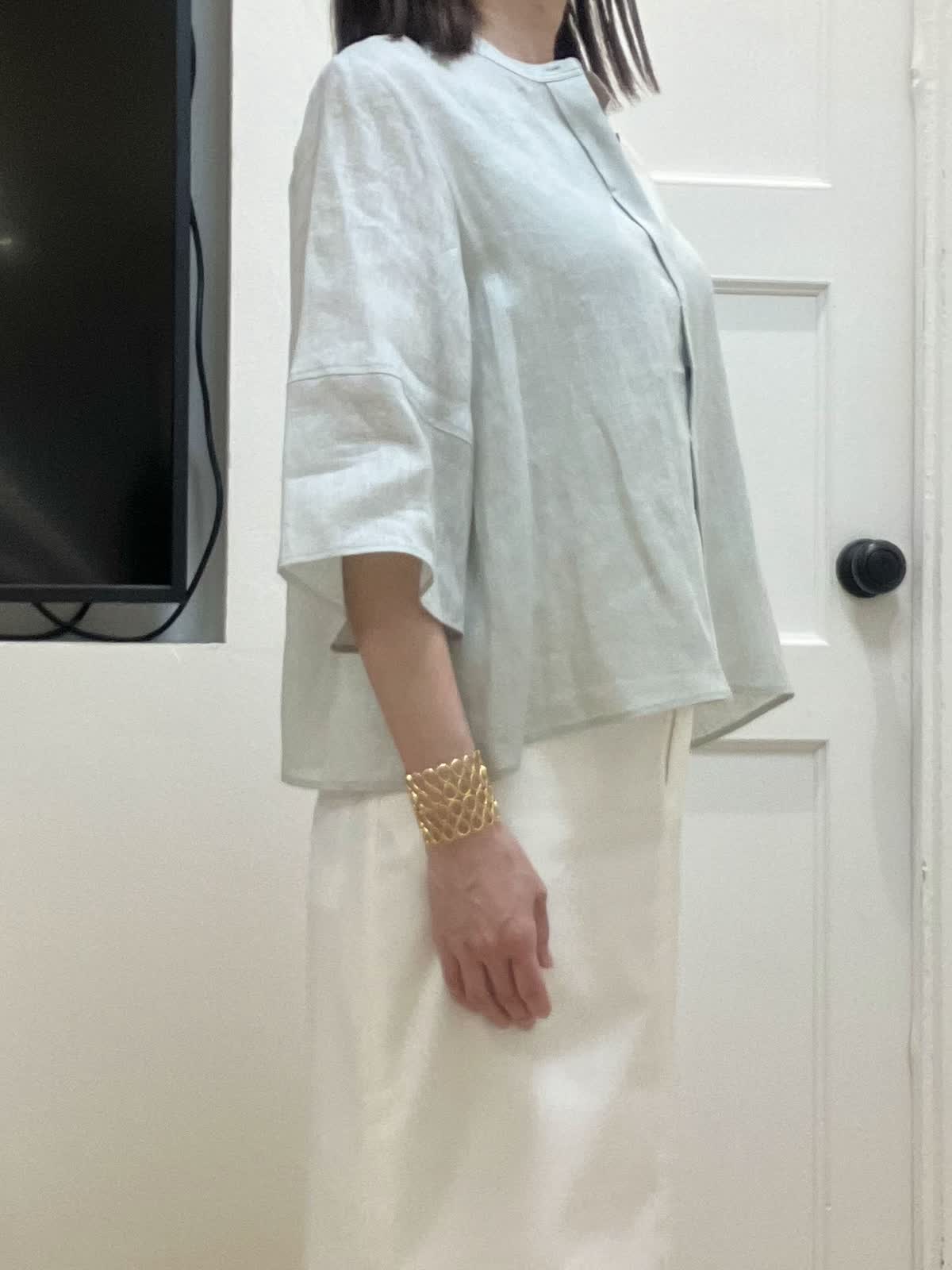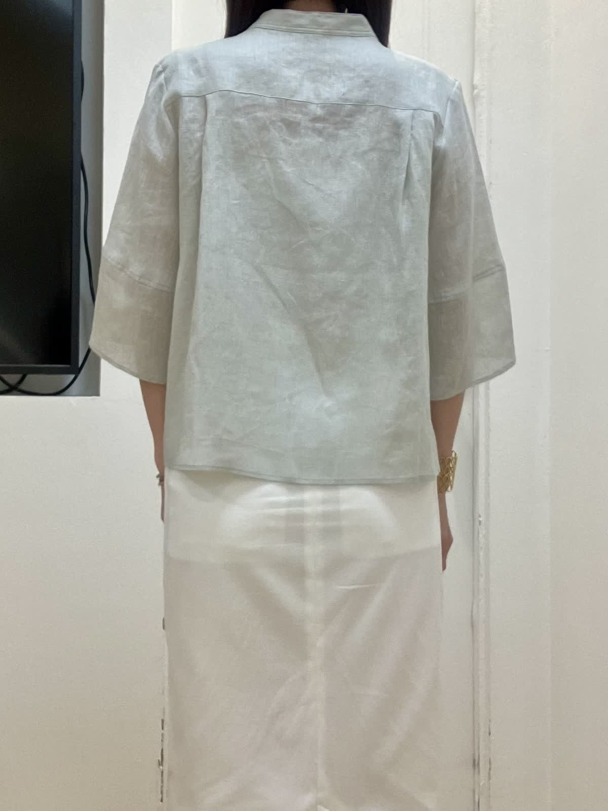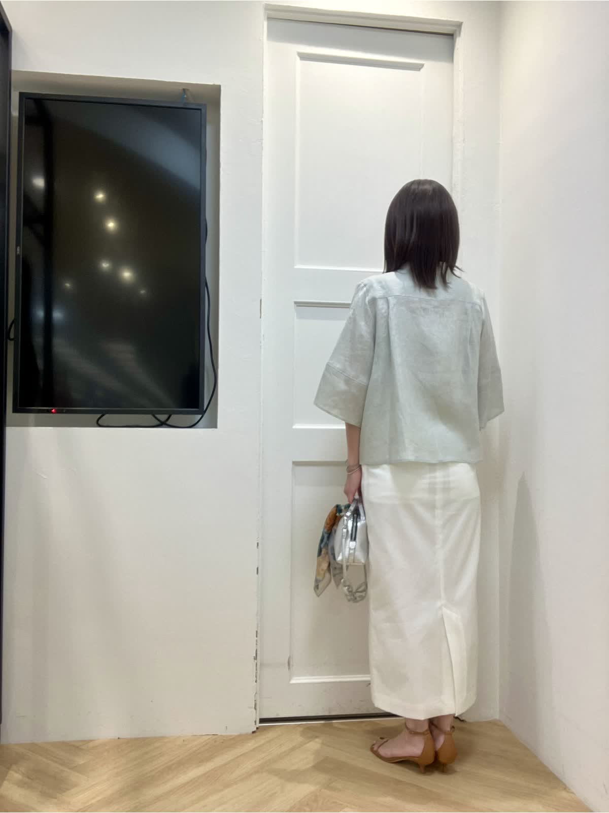 【着用サイズ】全て9号 【着用カラー】ブラウス:ペールグリーン スカート:オフホワイト 初夏のリネンお出掛けスタイル 昨年即完売したリネンコクーンシリーズ。今年は着丈を少し長めに変更し、よりバランスが取りやすくなりました。ふんわり袖デザインと裾が少し広がるシルエットで真夏もとても涼しいです。 シンプルなタイトスカートは着回し力抜群! 綿麻混なので夏場まで着回せます。スニーカー合わせも素敵です。