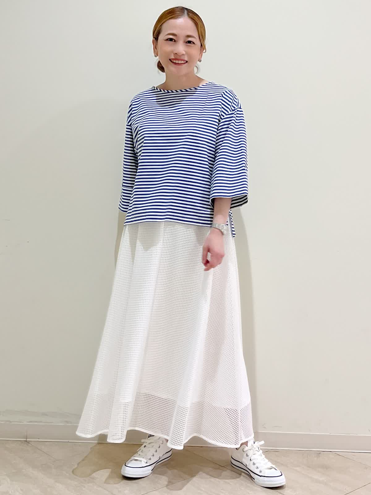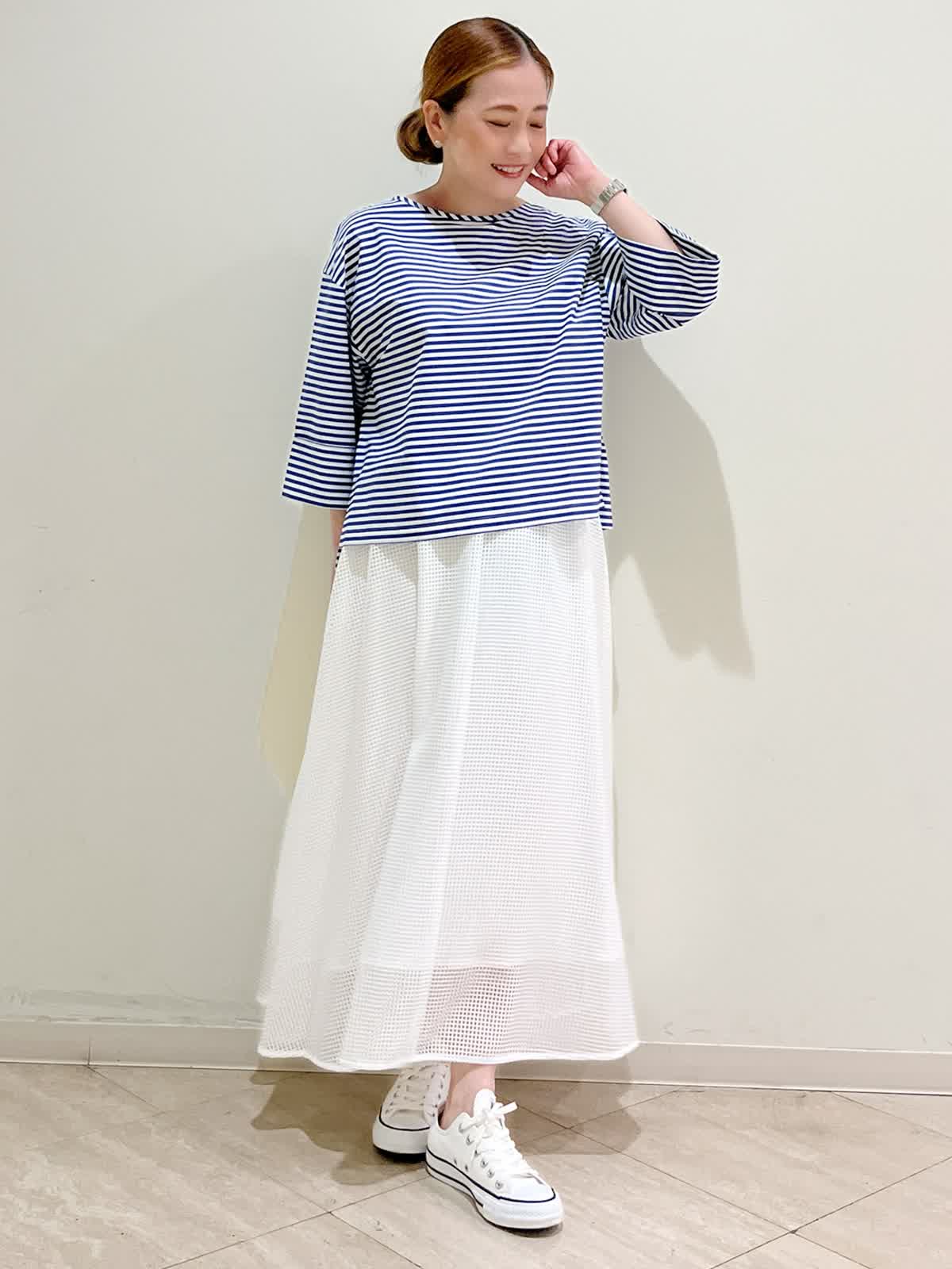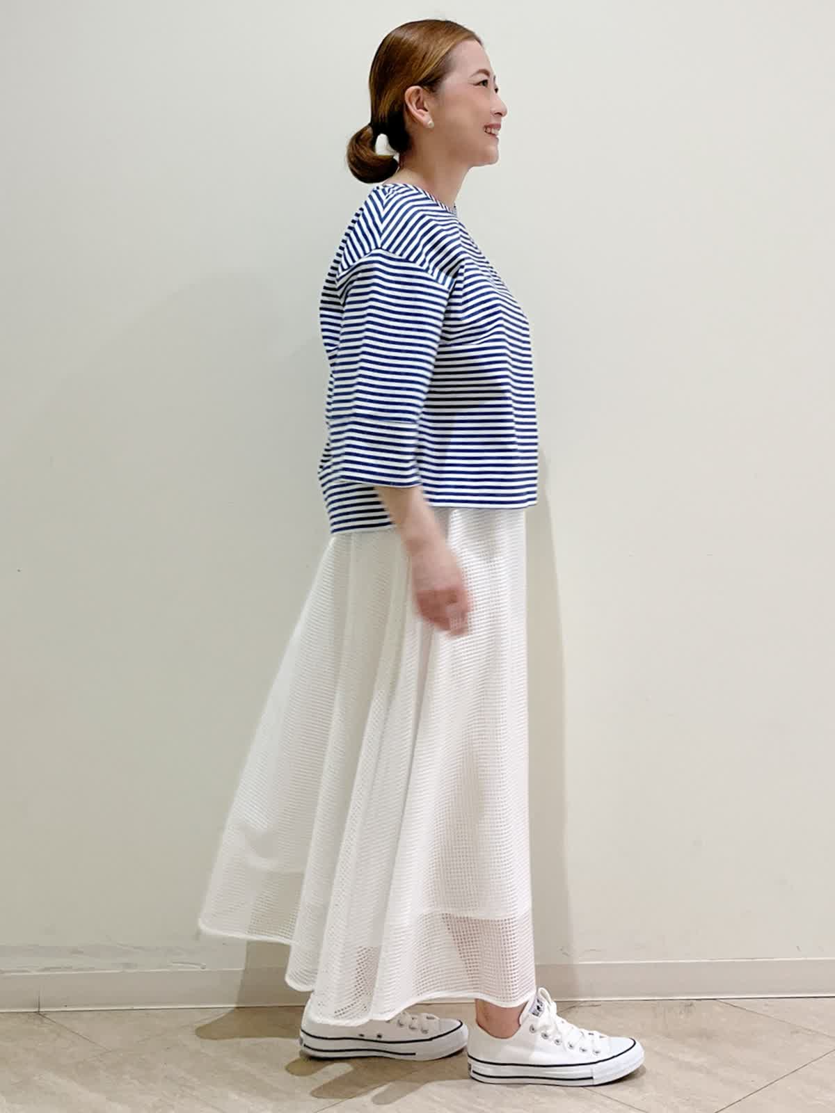 【着用サイズ】ブラウス:フリーサイズ スカート:フリーサイズ 【着用カラー】ブラウス:ブルー スカート:ホワイト 休日のお出かけコーディネートです。 爽やかにブルーとホワイトで合わせてみました。ブラウスは一枚でサマになります。体のラインを拾わないシルエットです。スカートは軽やかな動きがきれいです。