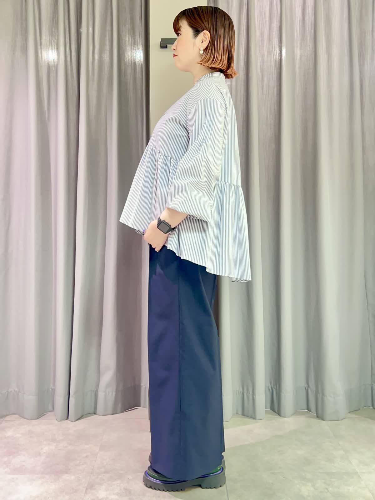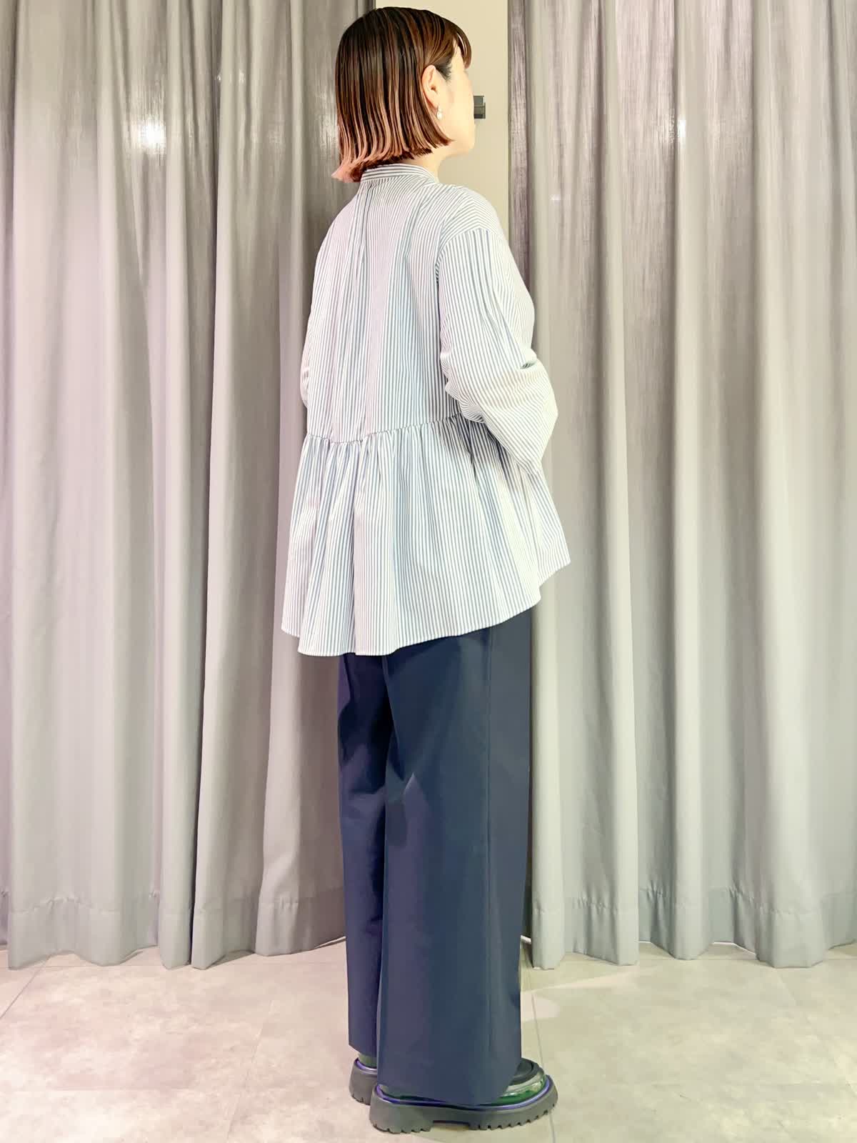 【着用サイズ/カラー】ブラウス:フリー/ストライプ パンツ:11号/ネイビー 『一枚で完成!ペプラムブラウス』 [ブラウス]綿100%のサラッとしたブラウスです。程よいオーバーサイズで体型をカバーしてくれます。前あきなので羽織りとしても使えます。 [パンツ]麻混の夏まで履けるセミワイドパンツです。シワになりにくく、シンプルなのでトップスを選ばないデザインです。ウエストは後ろゴムですがやや小さめで、丈も少し短めなので11号でちょうど良かったです。