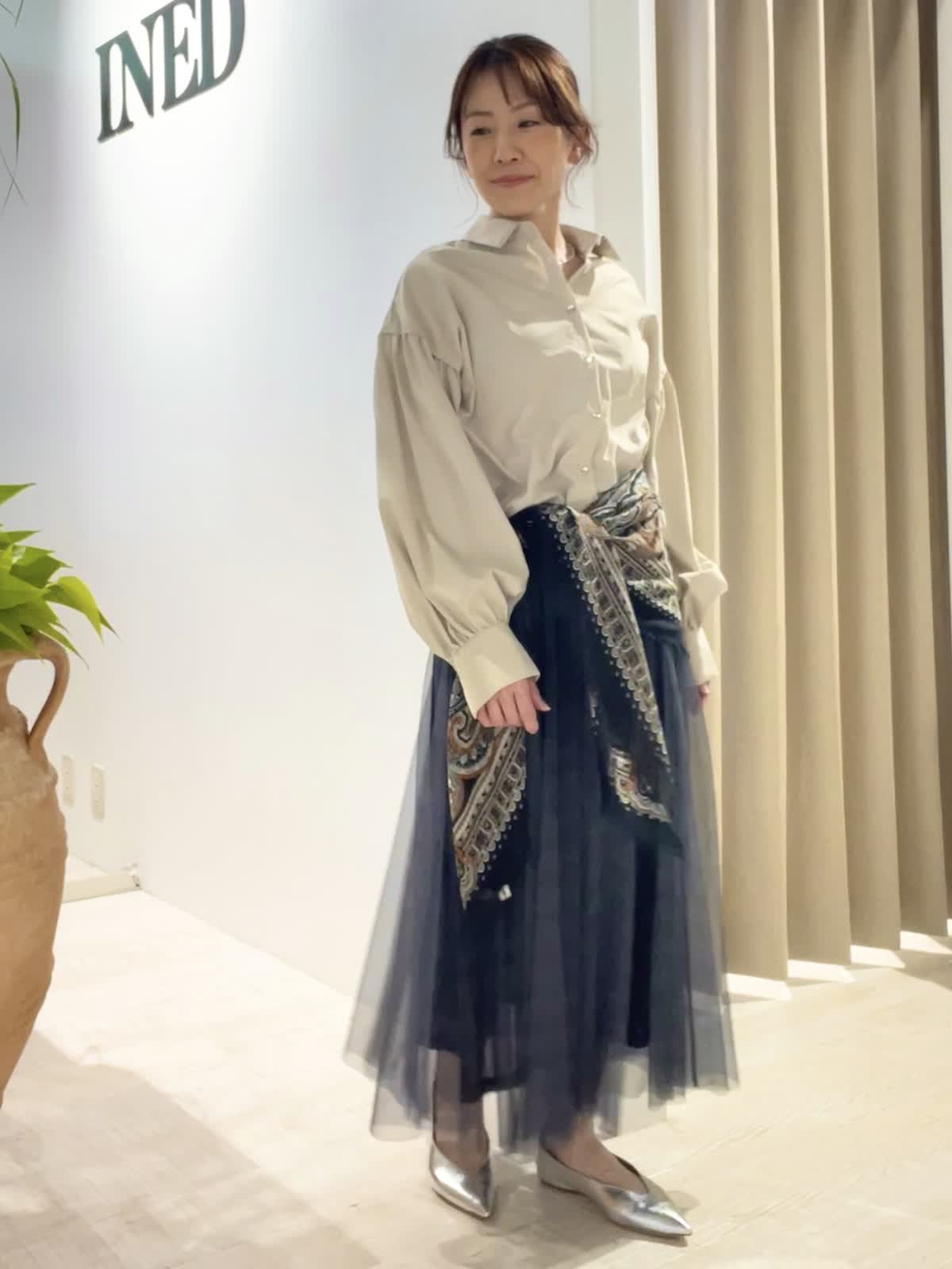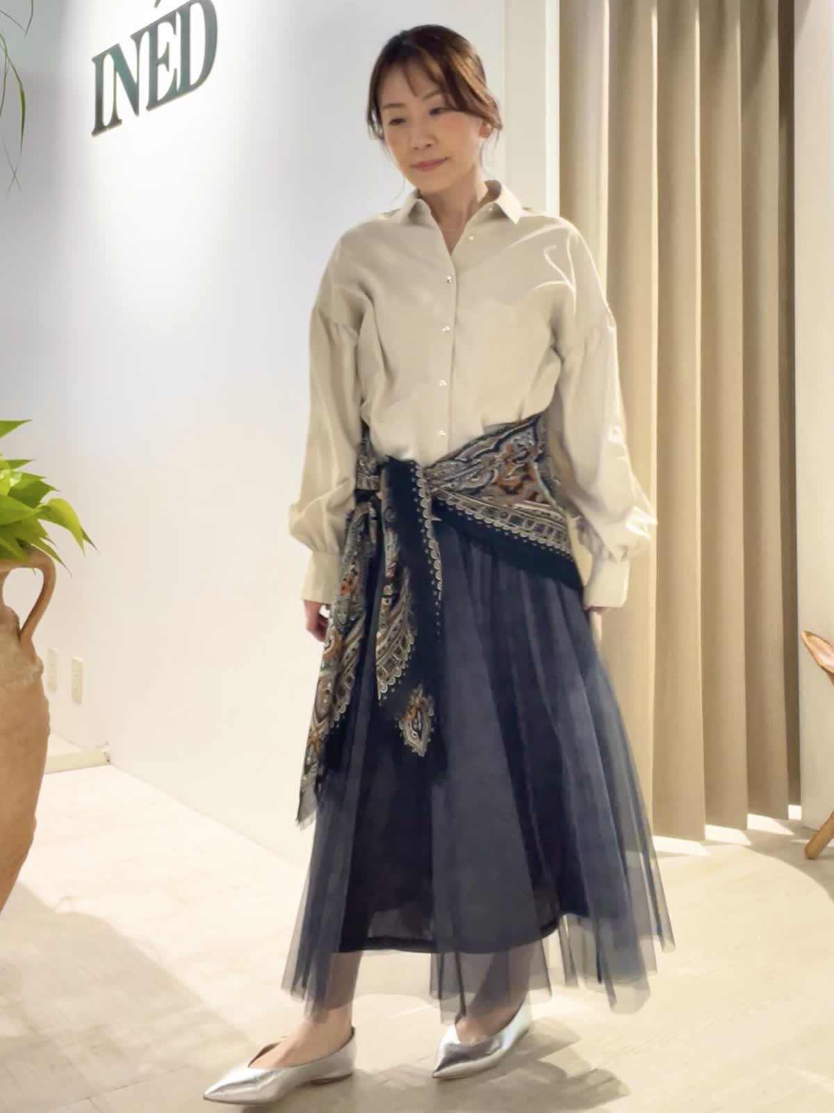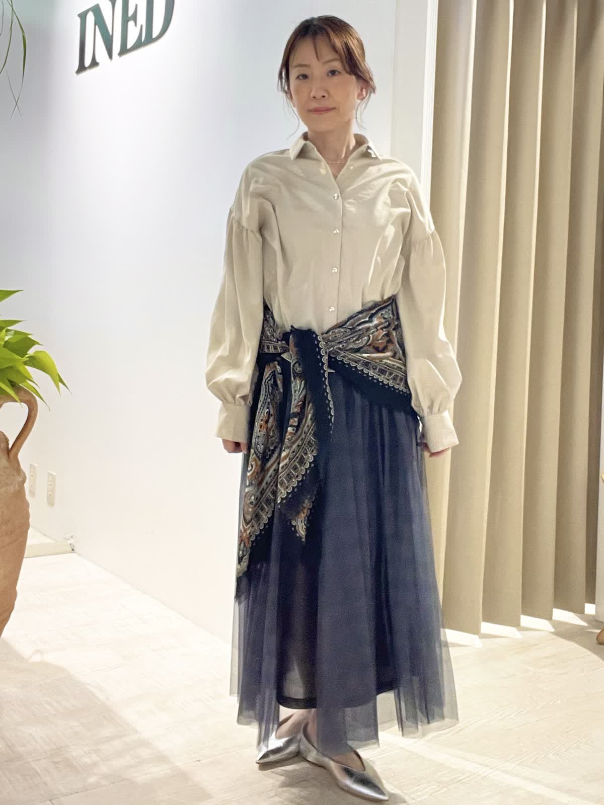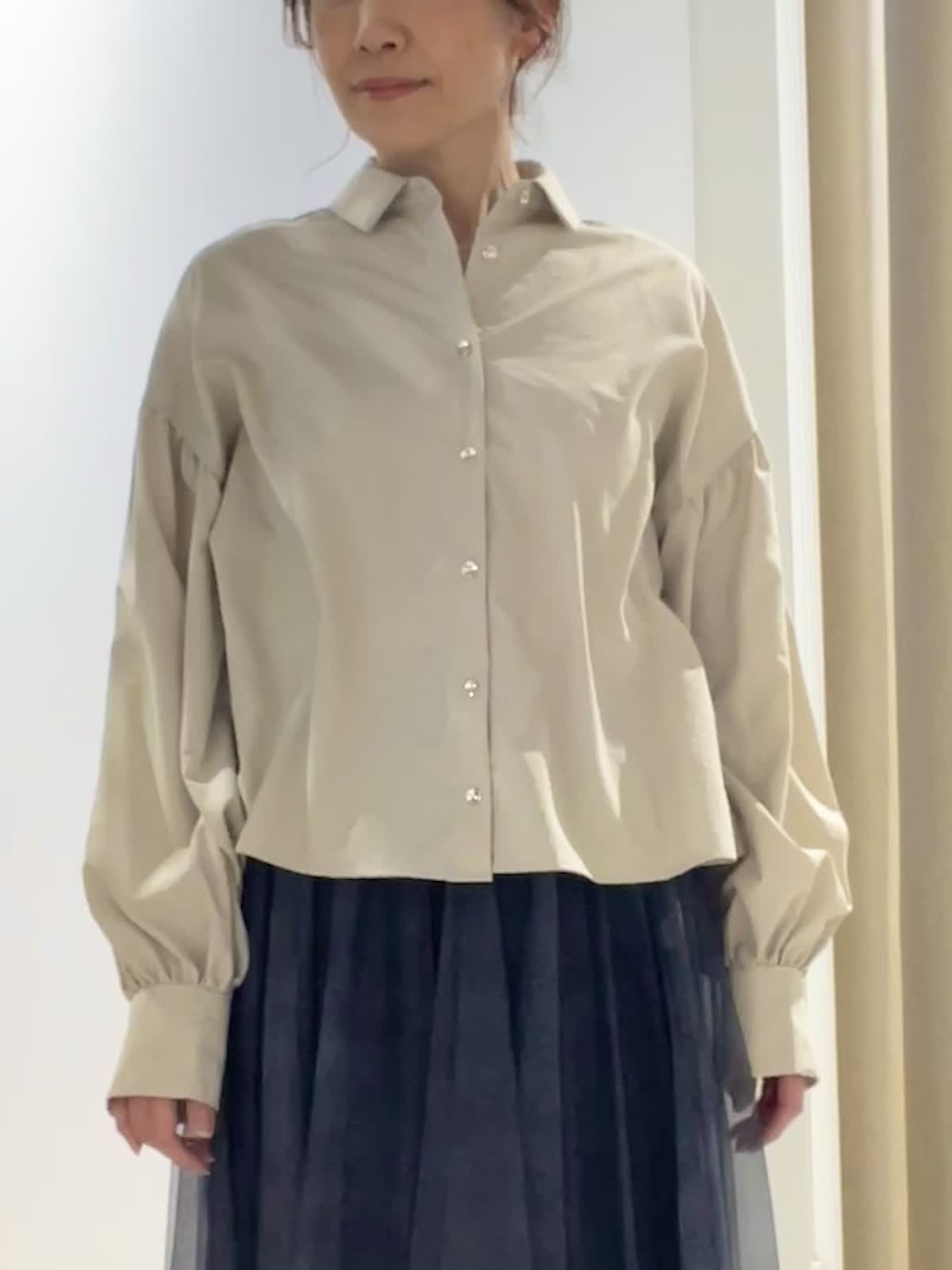 【着用アイテム:カラー/サイズ】 シャツ:ベージュ/9号 ストール:ブラック クロップド丈の袖ボリュームシャツは、長めのスカートとの相性抜群。ゴールドのボタンが控えめでおしゃれです。 冷房や日焼け対策として、夏の羽織りにもなります。ペイズリー柄の大判ストールを巻いてシンプルコーデのアクセントにしました。