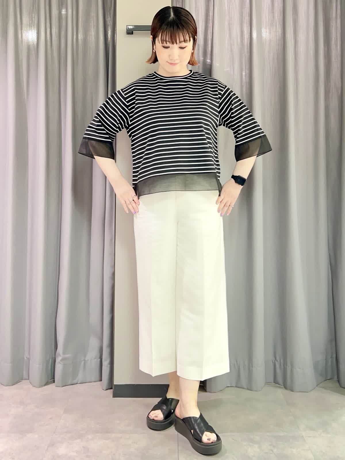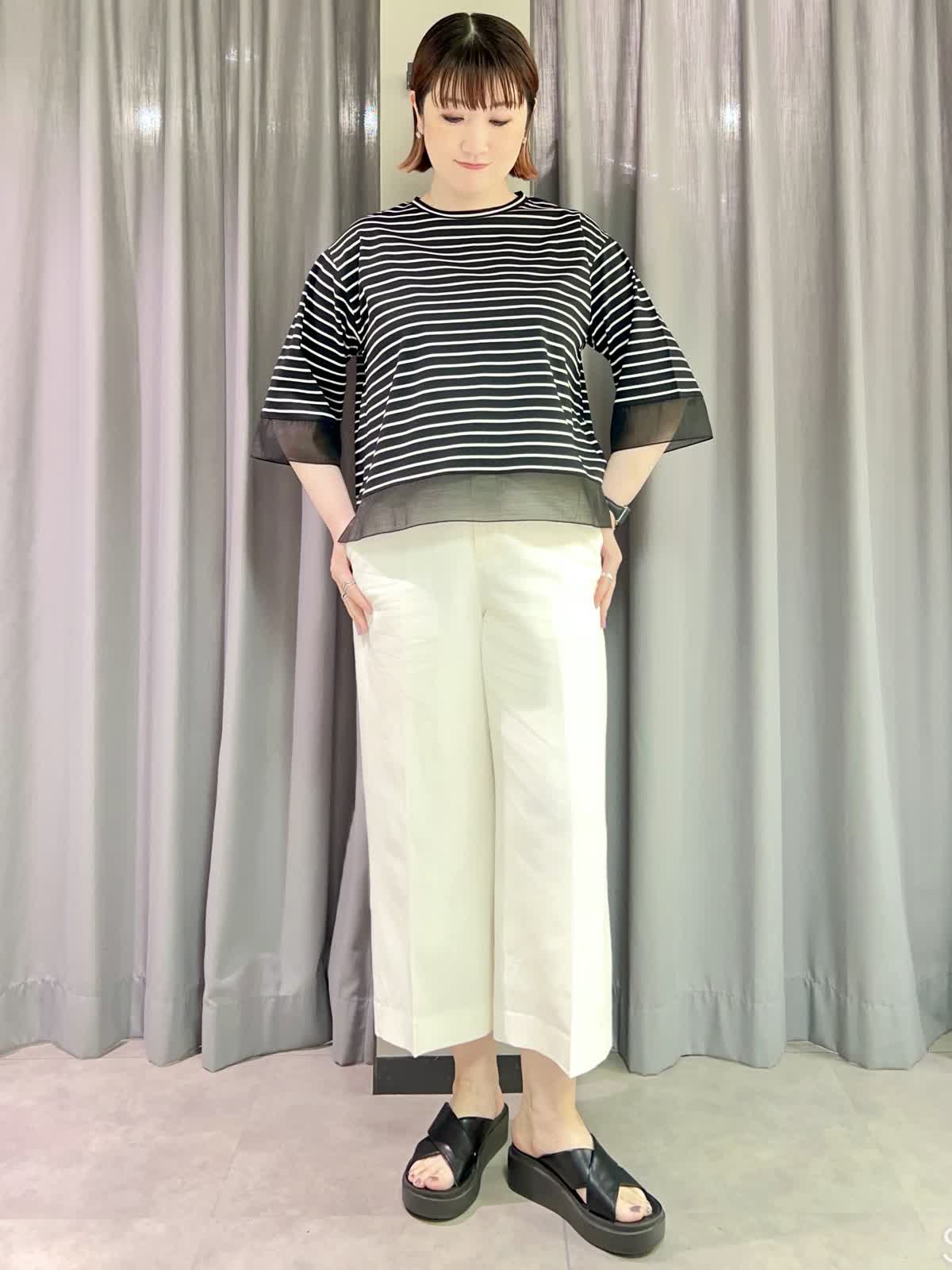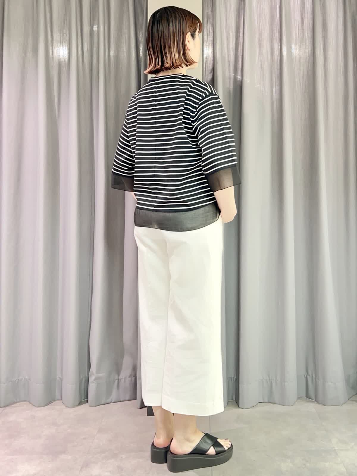 【着用サイズ/カラー】カットソー:フリー/ブラック パンツ:11号/オフホワイト 『夏まで着られるデザインカットソー』 [カットソー]袖口と裾のオーガンジーがかわいいデザインカットソーです。ややオーバーサイズでボディラインを拾いません。接触冷感性があるので夏まで着られます。 [パンツ]ベーシックなワイドクロップドパンツです。麻混でナチュラルな風合いが夏のお出掛けにピッタリです。ウエストの後ろがゴムで楽ちんです。