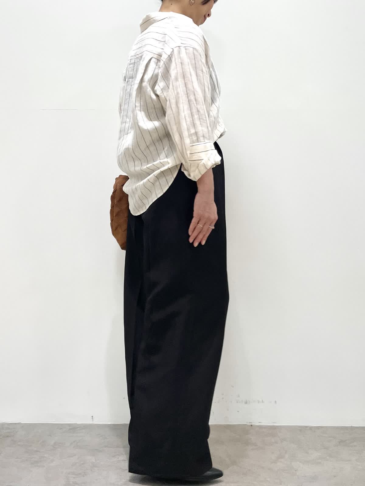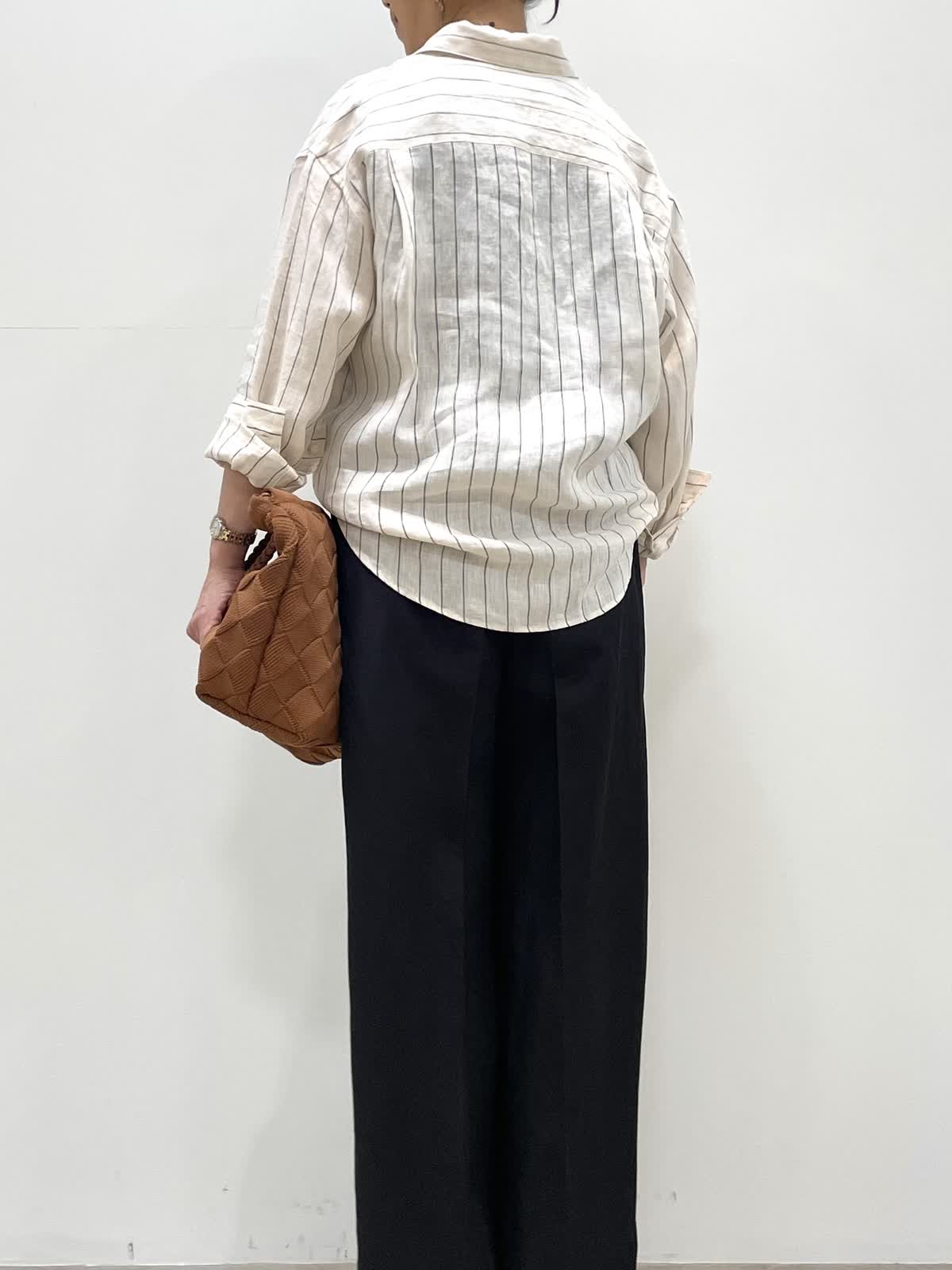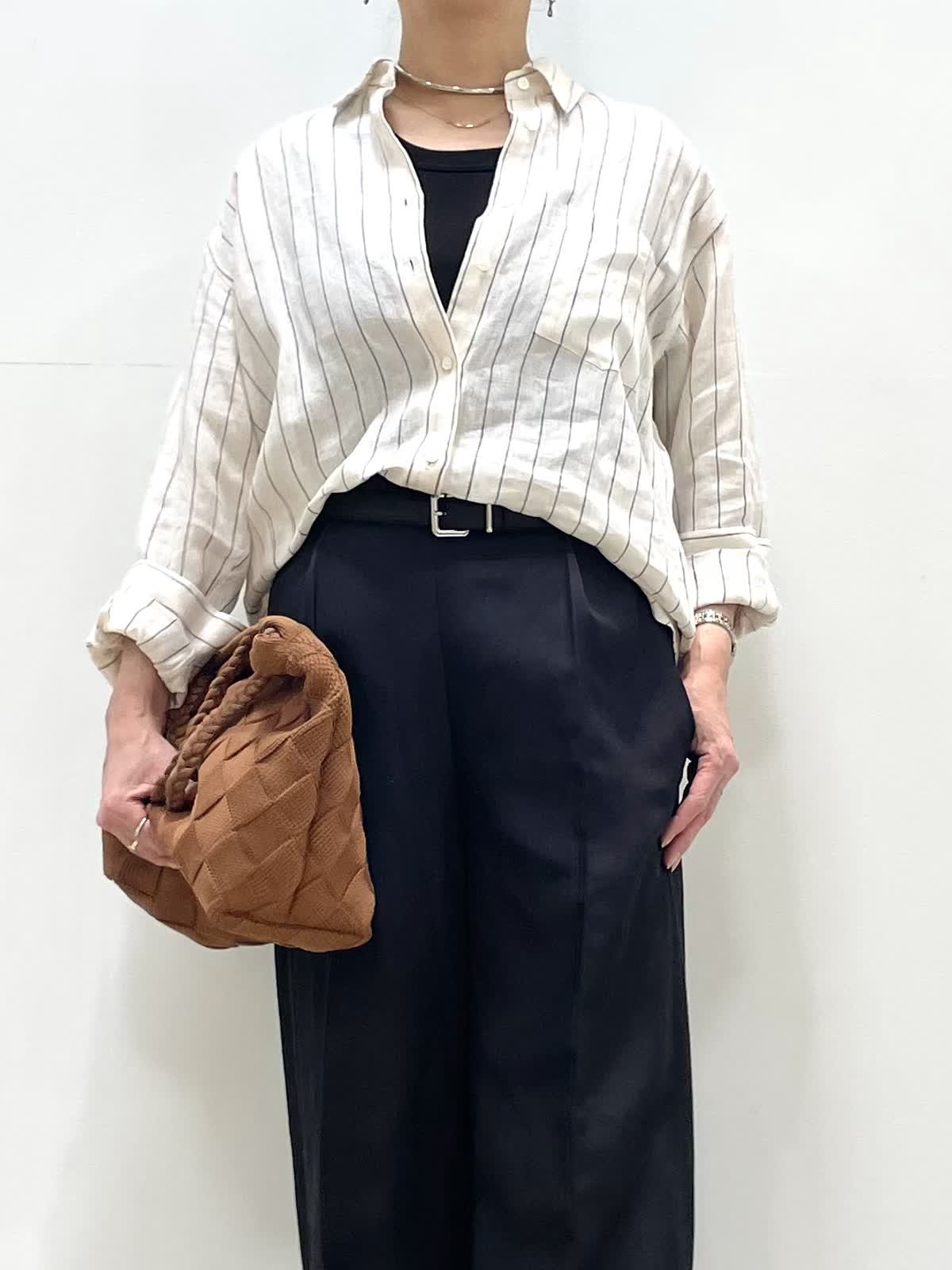 【着用サイズ】全て9号 【着用カラー】シャツ:ストライプ タンクトップ:ブラック パンツ:チャコールグレー 毎年大人気の定番リネンシャツ。汗ばむ季節にさらっと着られる長袖はUV対策、空調対策に1枚あると活躍します。1枚で着たり、羽織ったり、衿を抜いたりと着方もいろいろ楽しめます。パンツはラインを拾わないワイドシルエット。黒に使いチャコールグレーで合わせやすいです。
