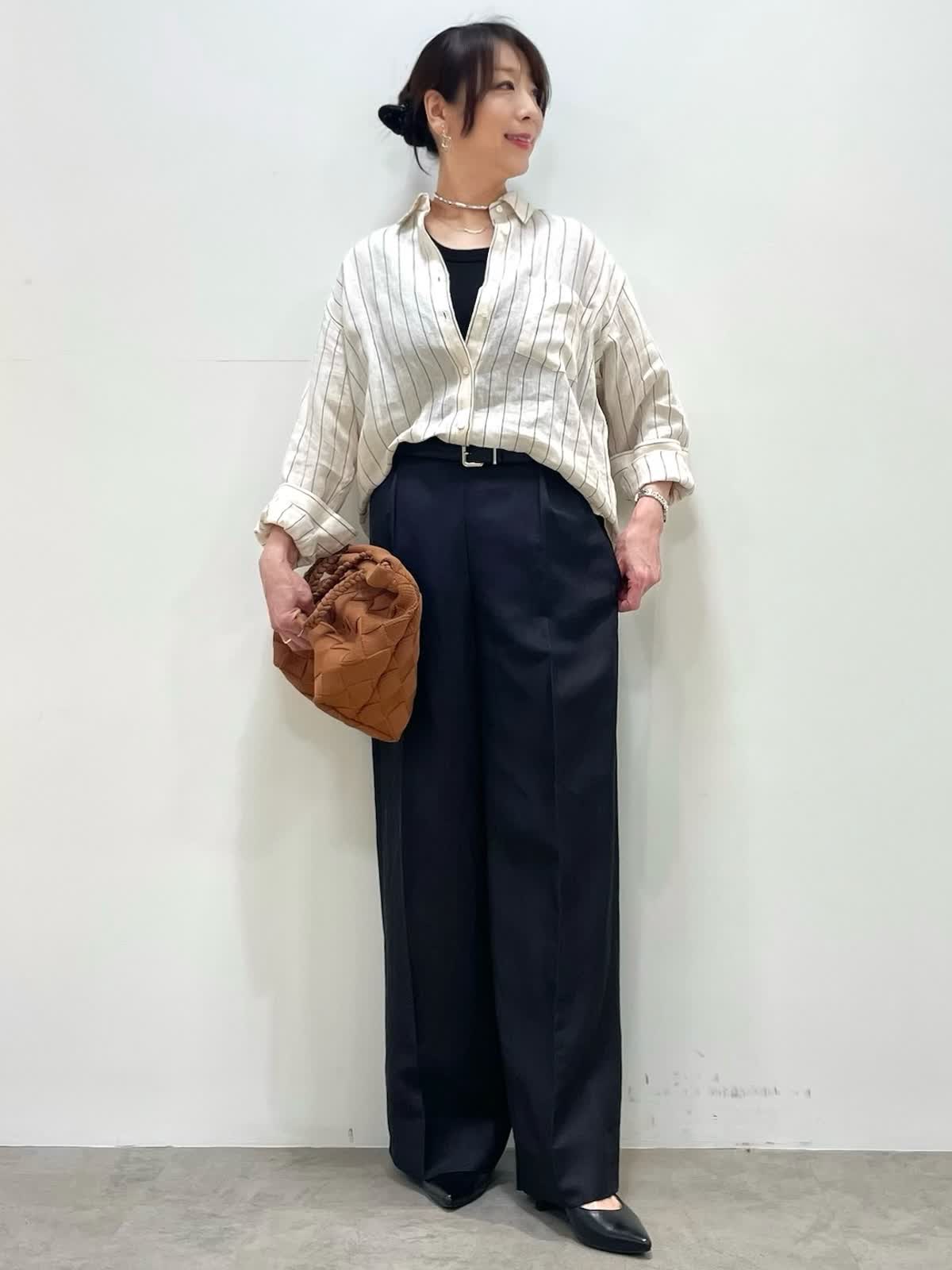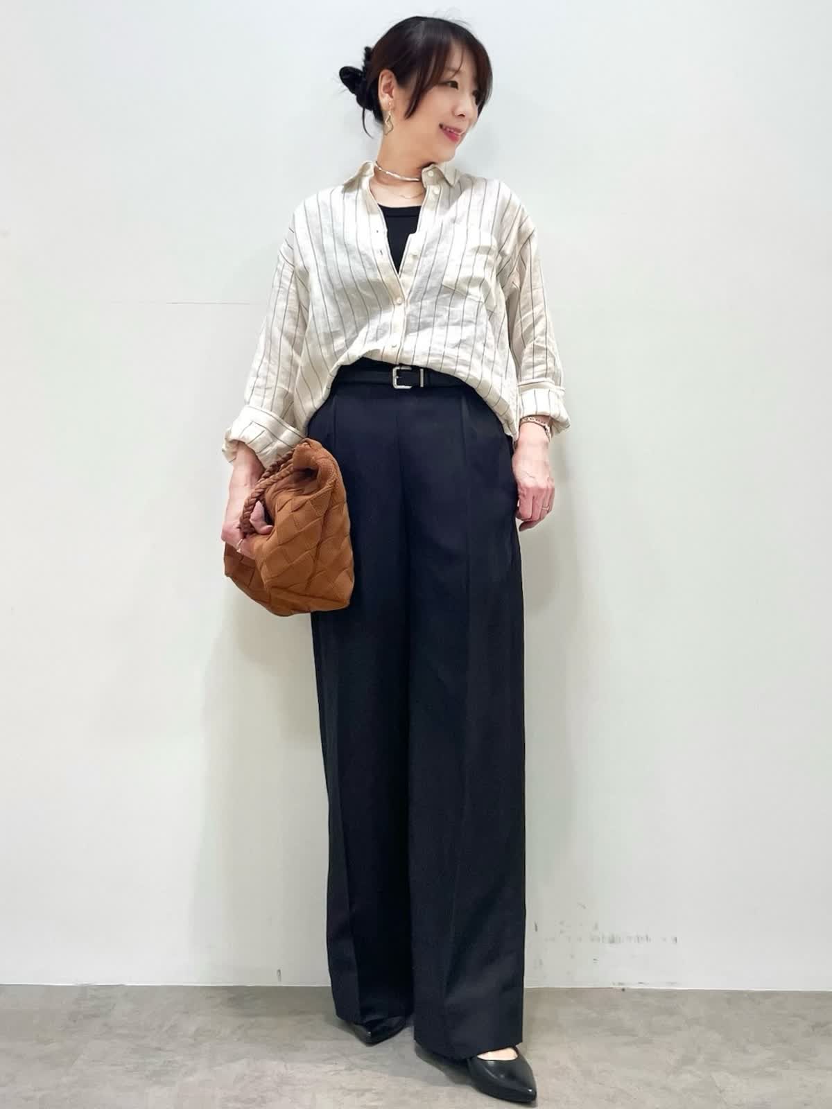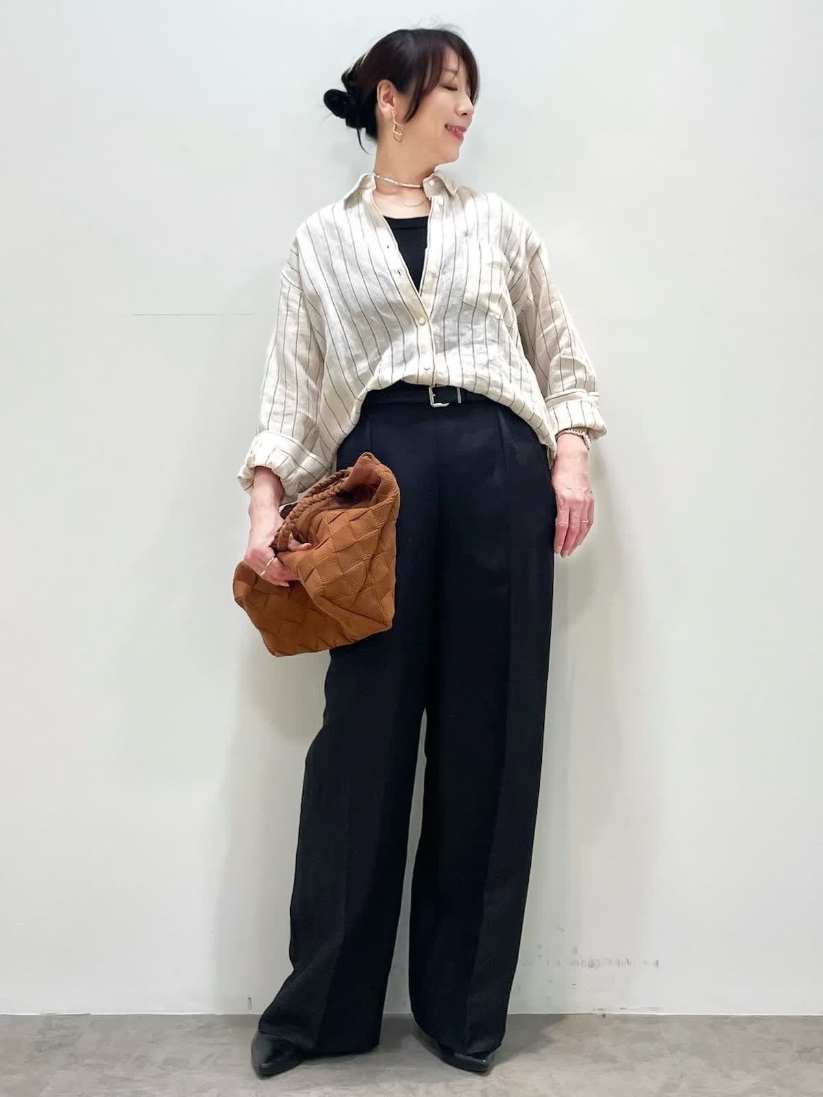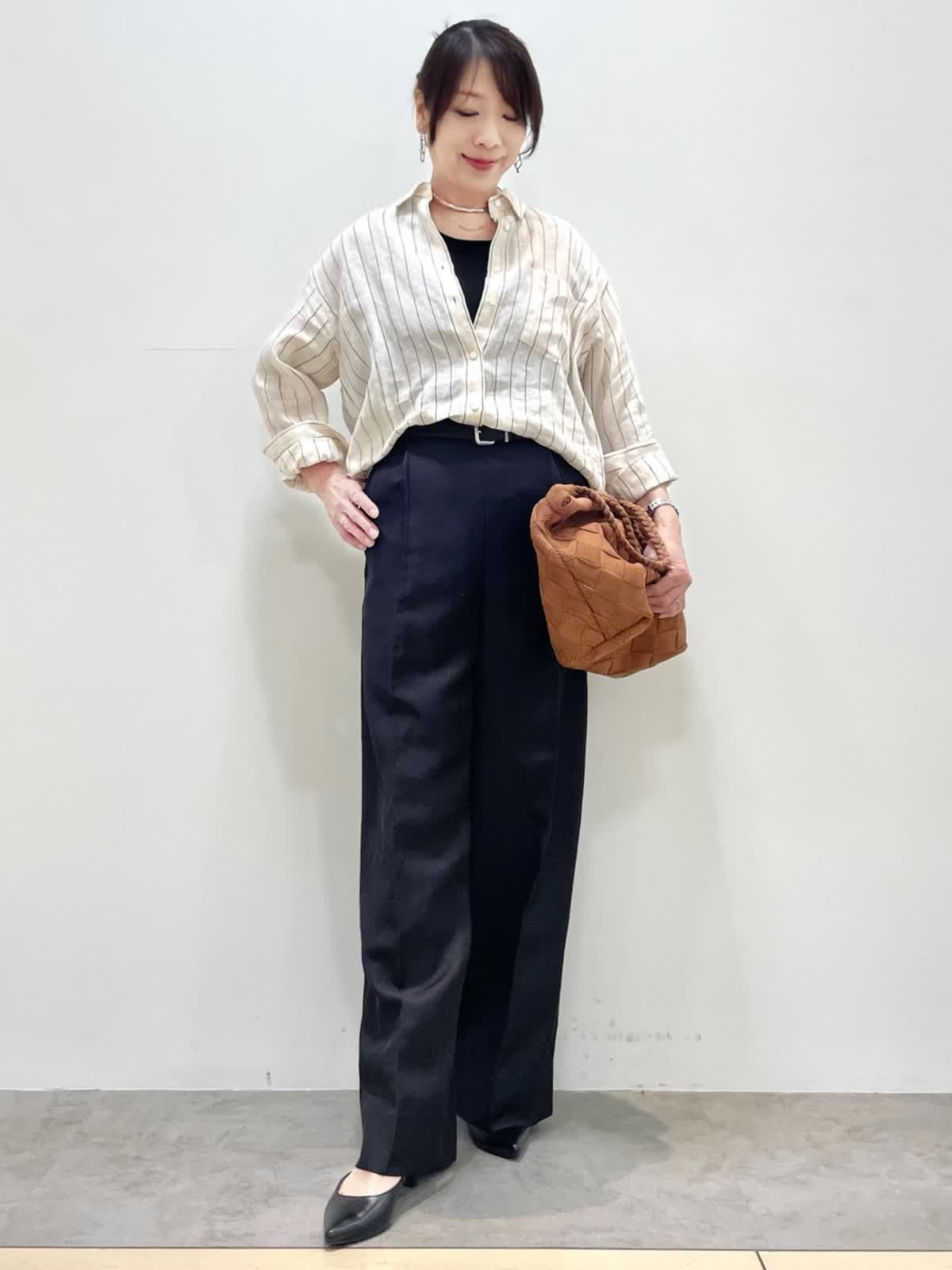 【着用サイズ】全て9号 【着用カラー】シャツ:ストライプ タンクトップ:ブラック パンツ:チャコールグレー 毎年大人気の定番リネンシャツ。汗ばむ季節にさらっと着られる長袖はUV対策、空調対策に1枚あると活躍します。1枚で着たり、羽織ったり、衿を抜いたりと着方もいろいろ楽しめます。パンツはラインを拾わないワイドシルエット。黒に使いチャコールグレーで合わせやすいです。