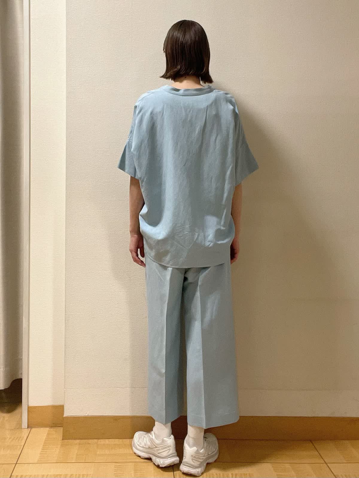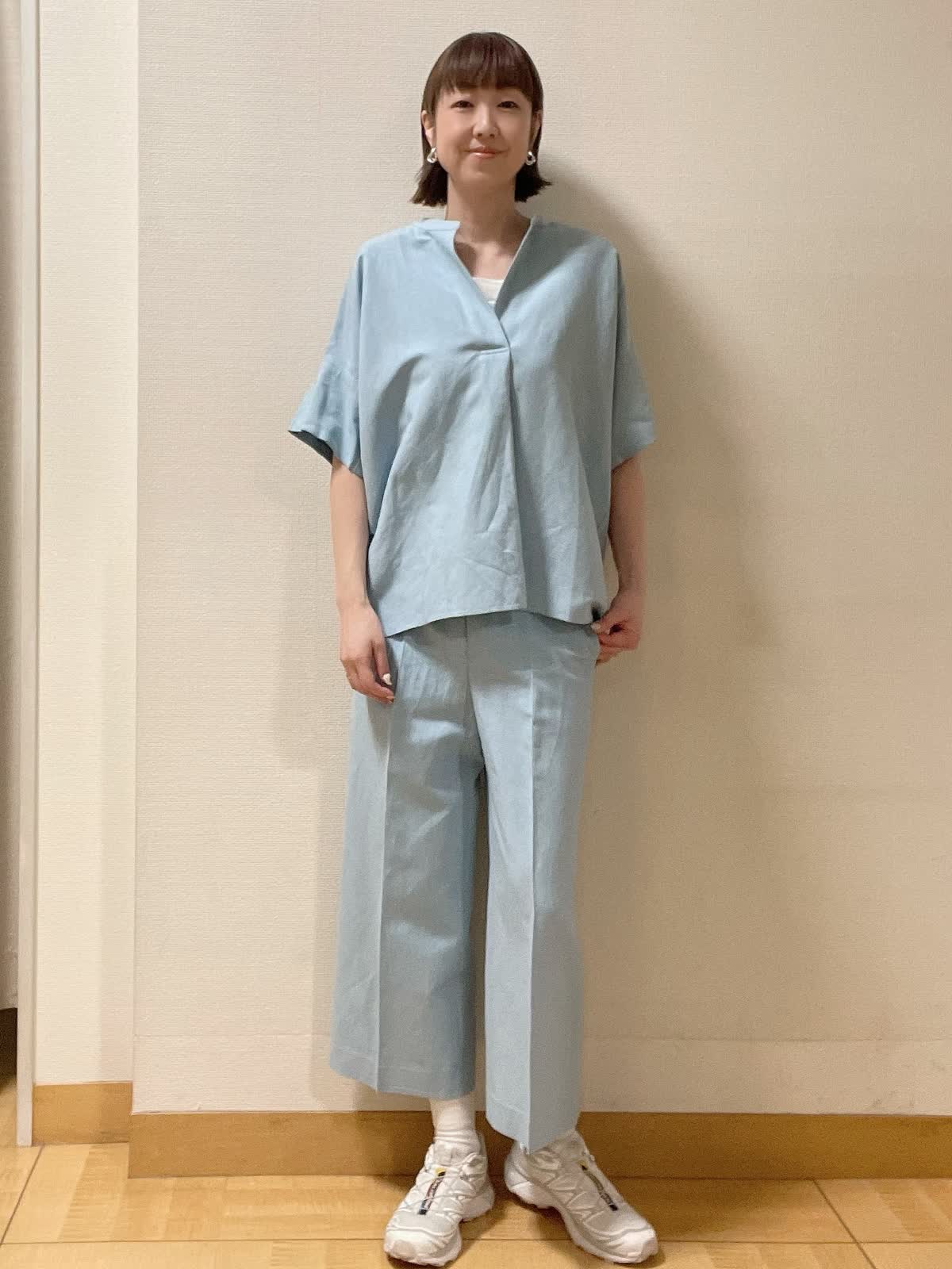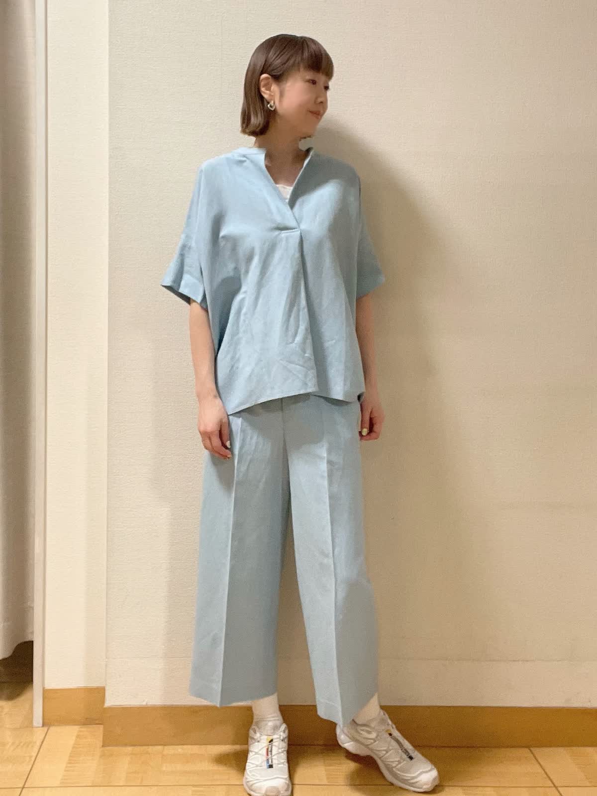 【着用サイズ】全て9号 【着用カラー】シャツ、パンツ共にサックス インナーカットソー:オフホワイト オーバーサイズでこなれ感があるスキッパーシャツ。同素材のクロップドパンツ合わせで爽やかスタイル。