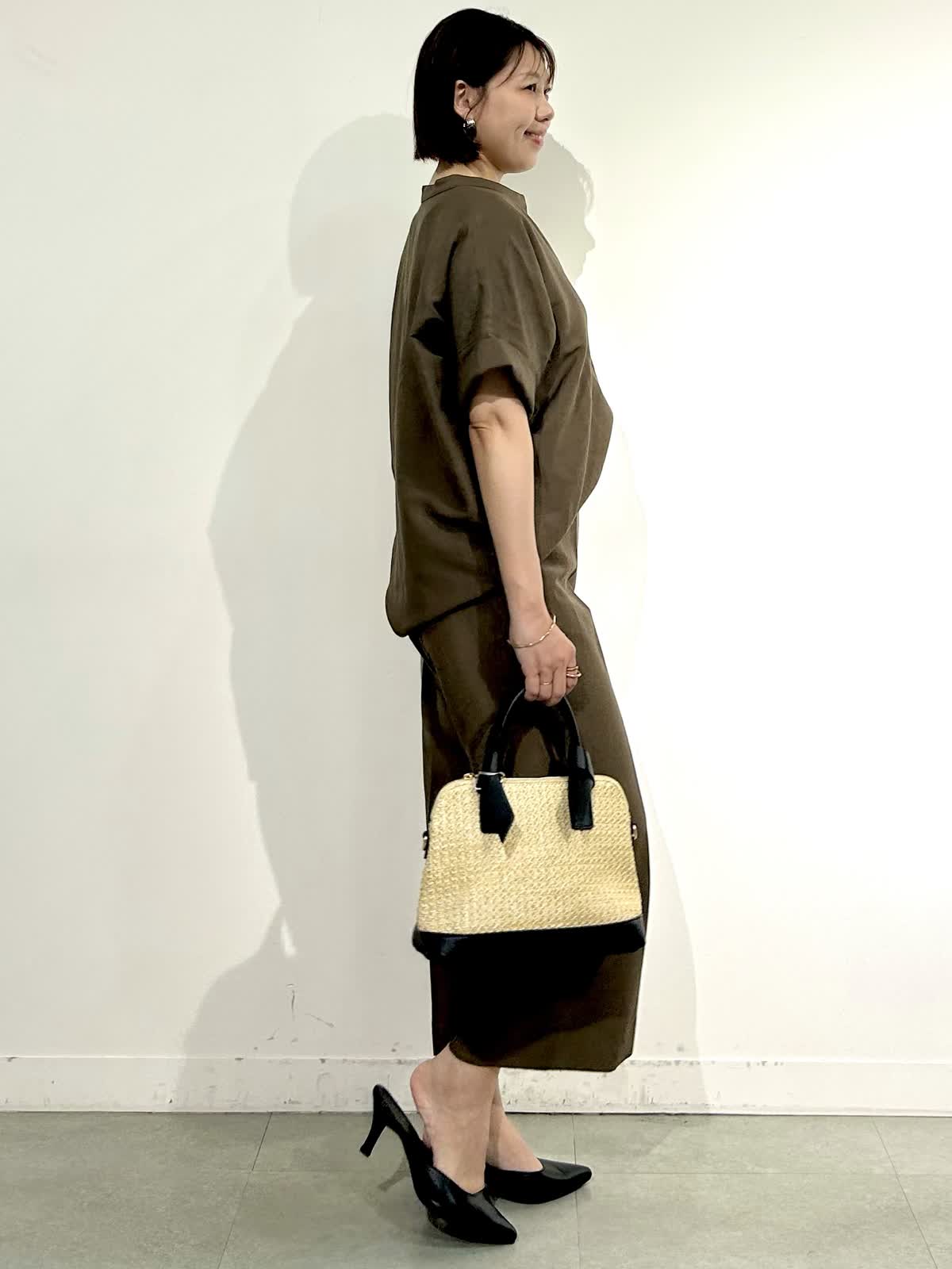 ブラウスはスキッパーなので首が長く見えてかおまわりすっきり。二の腕が隠れてボディラインを拾わないデザインです。