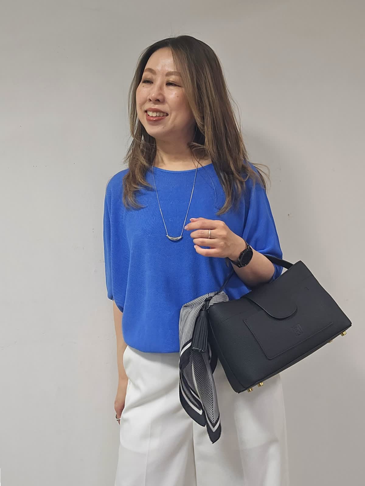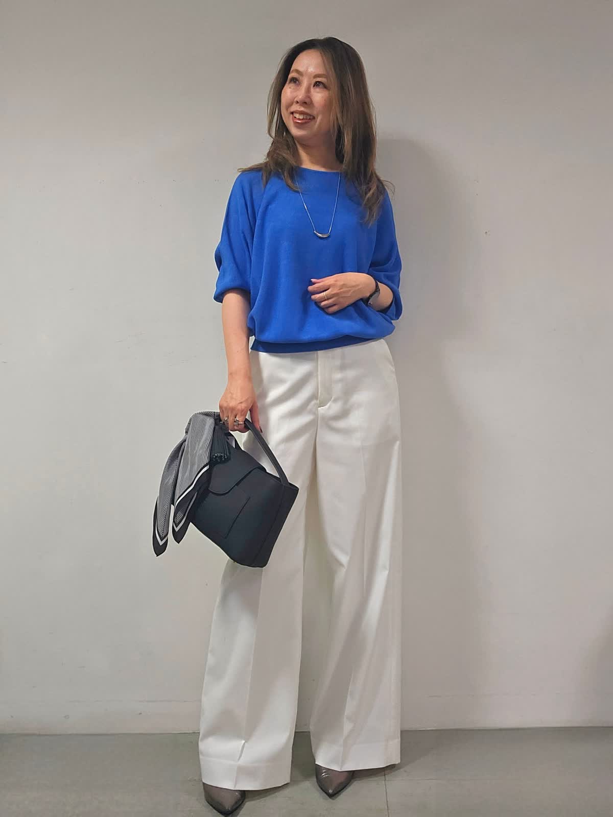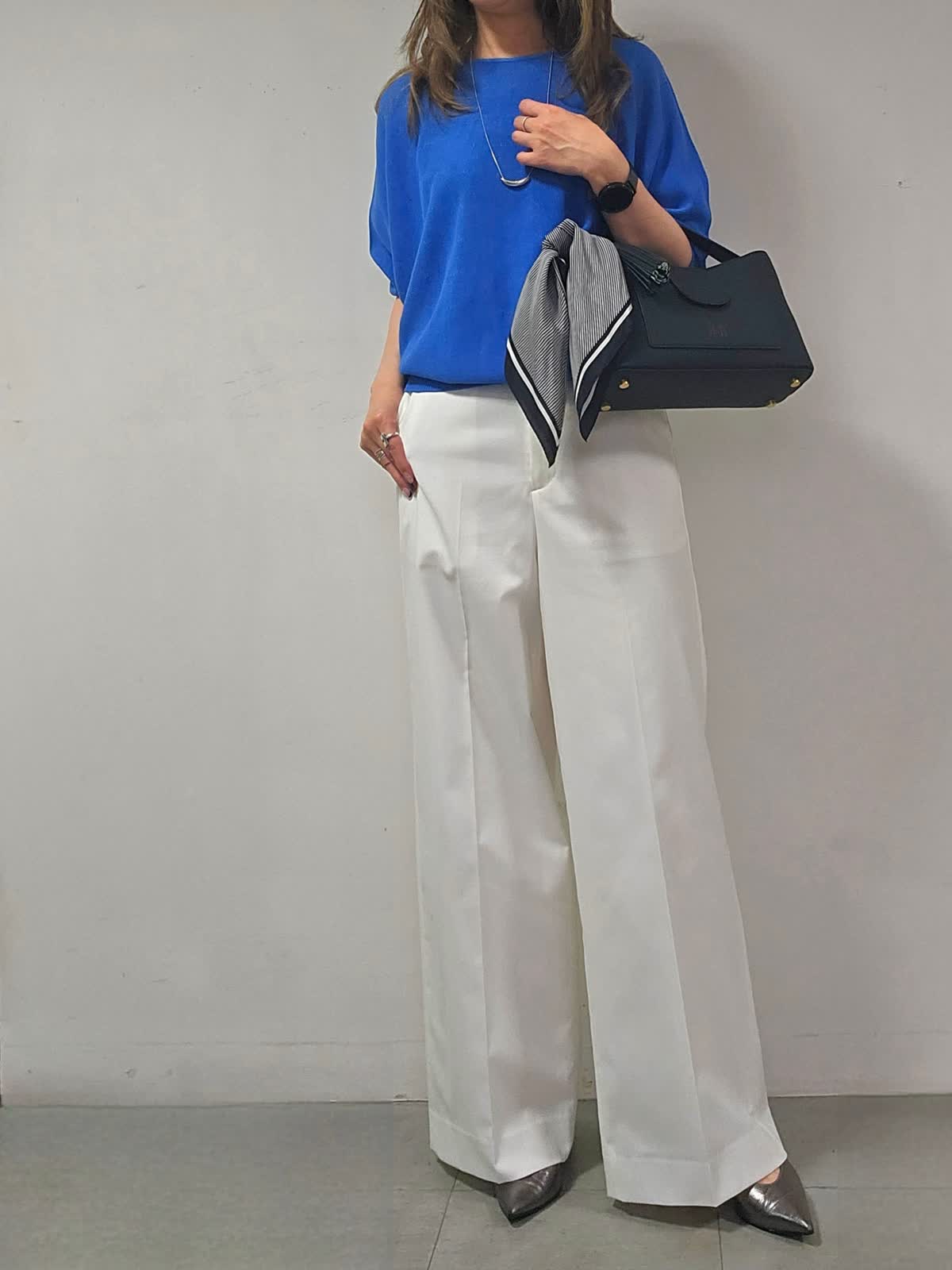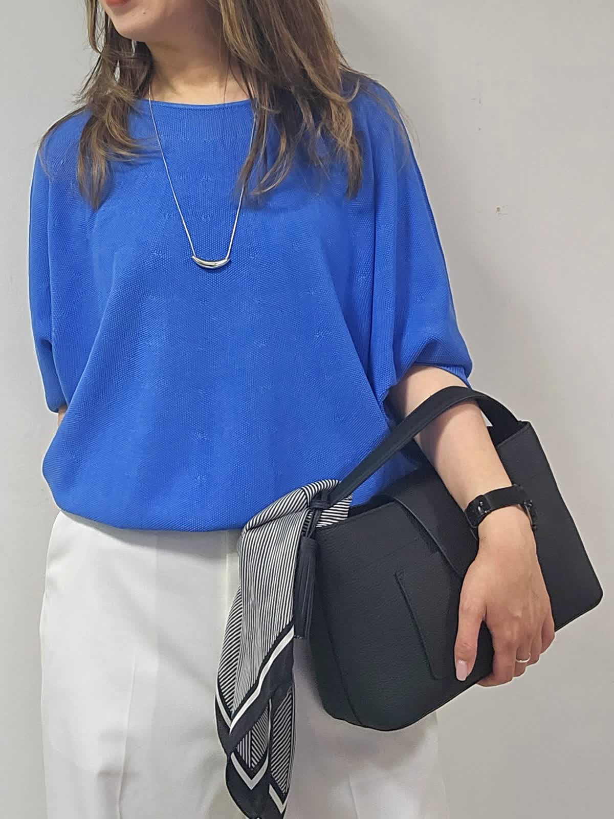【着用カラー・サイズ】ニット:ブルー・9号 パンツ:オフホワイト・7号 バッグ:ブラック スカーフ:ブラック 甘くなりすぎず爽やかで大人っぽい魅力のブルーニット☆ 春らしくコーデを華やかにしてくれるカラーアイテム。 春の先取りにぴったりです!