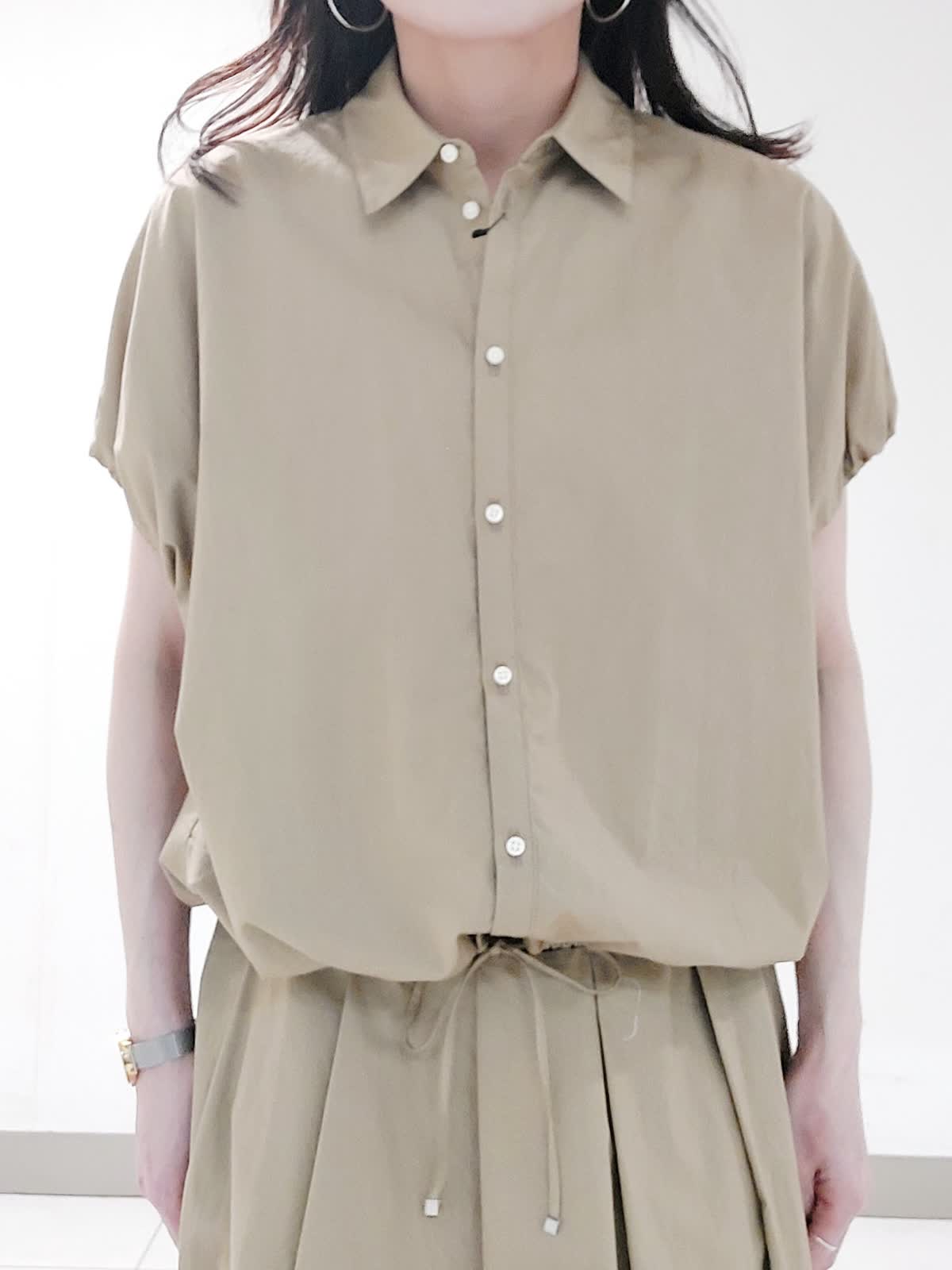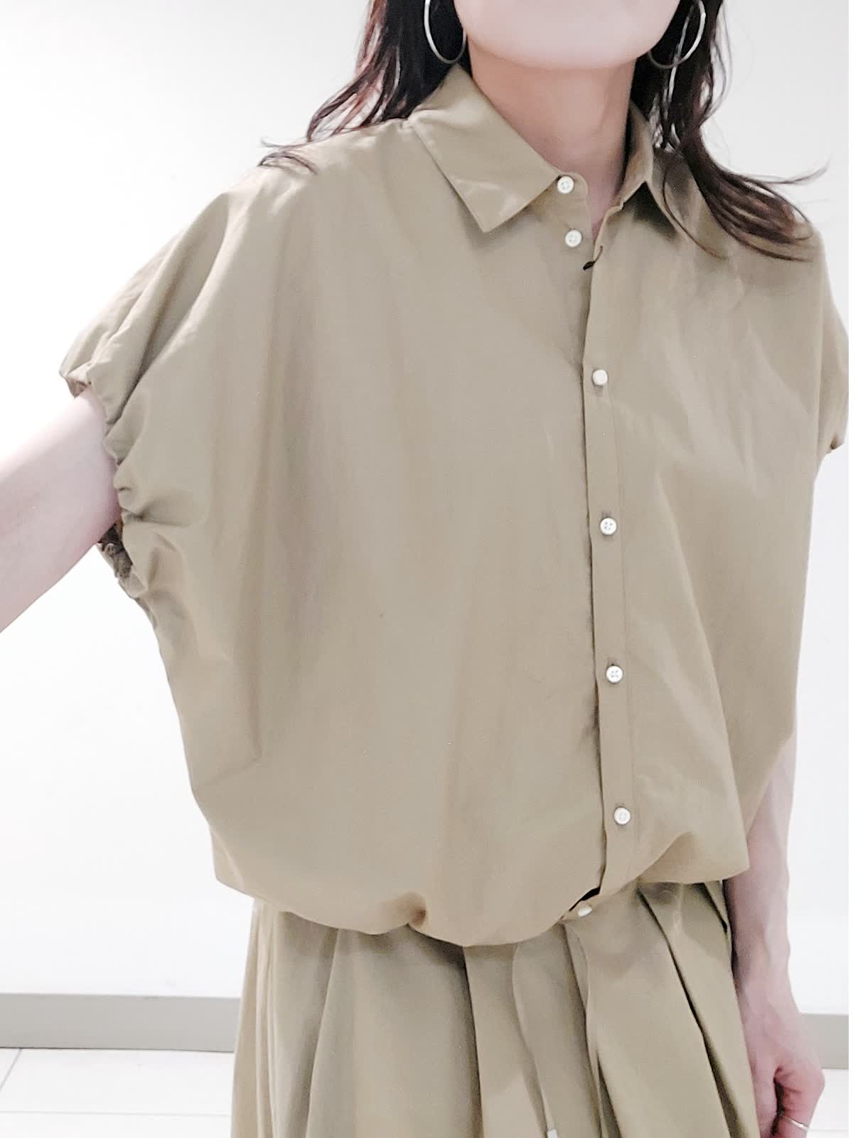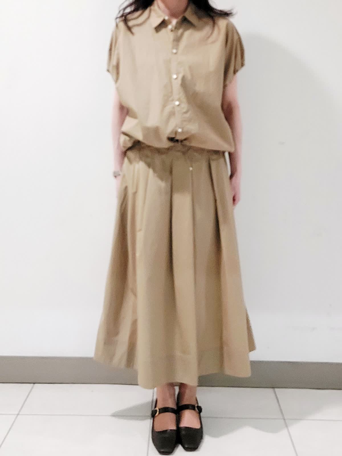 【着用サイズ】ブラウス:フリー スカート:7号 小さめの衿がクラシックできちんと感をあたえるブラウス。ドルマンスリーブで、抜け感がありつつ綿100%のタイプライター素材でハリ感のあるキレイ見えな表情に仕上げています。裾のブラウジングは挑戦可能です。同素材のタックフレアスカートは、ウエスト後ろのみゴムイン仕様で、左脇の釦がアクセントとに。裾に向かって広がるフレアラインは、クラシックで上品な印象を与えてくれるスカートです。