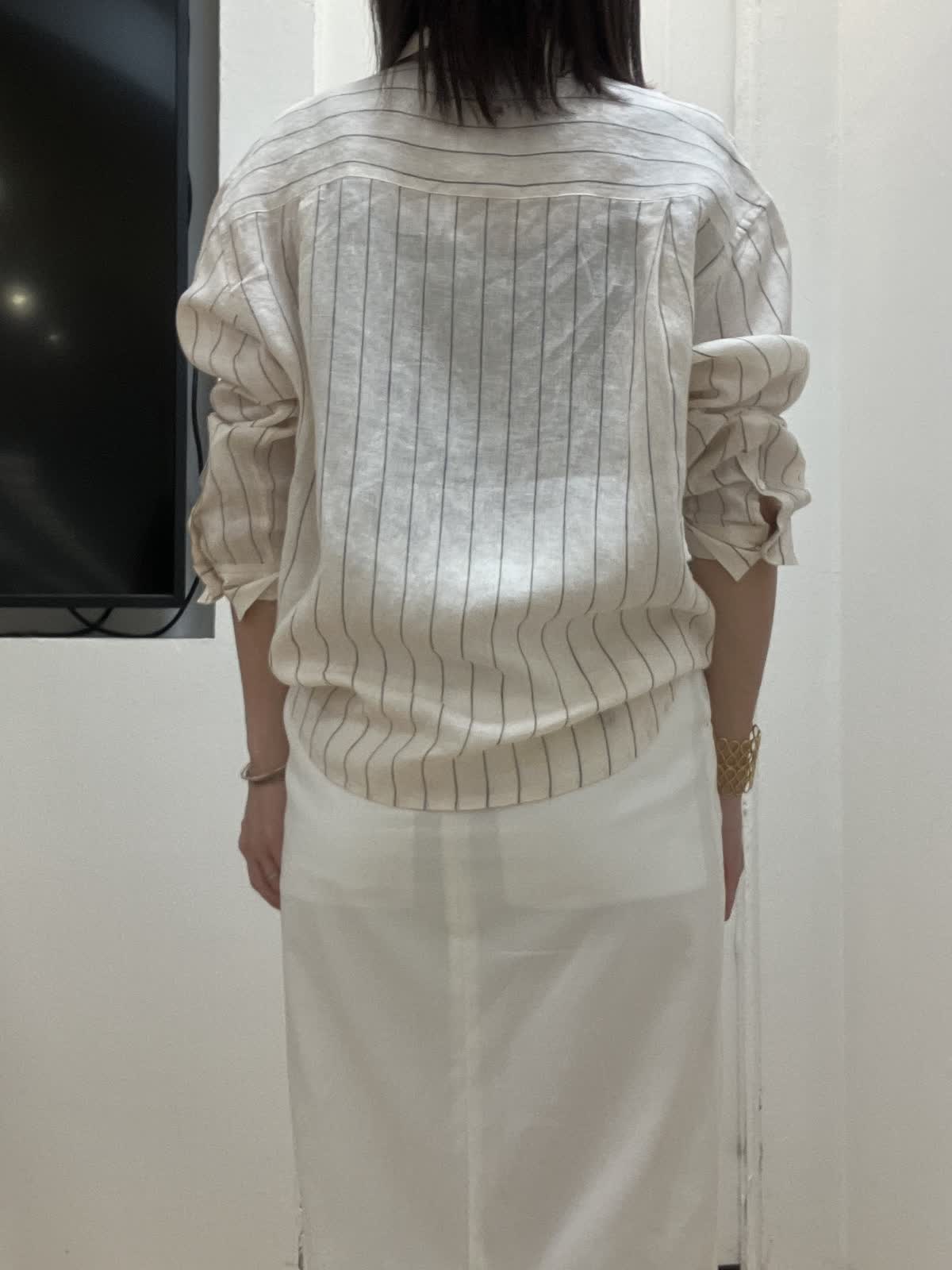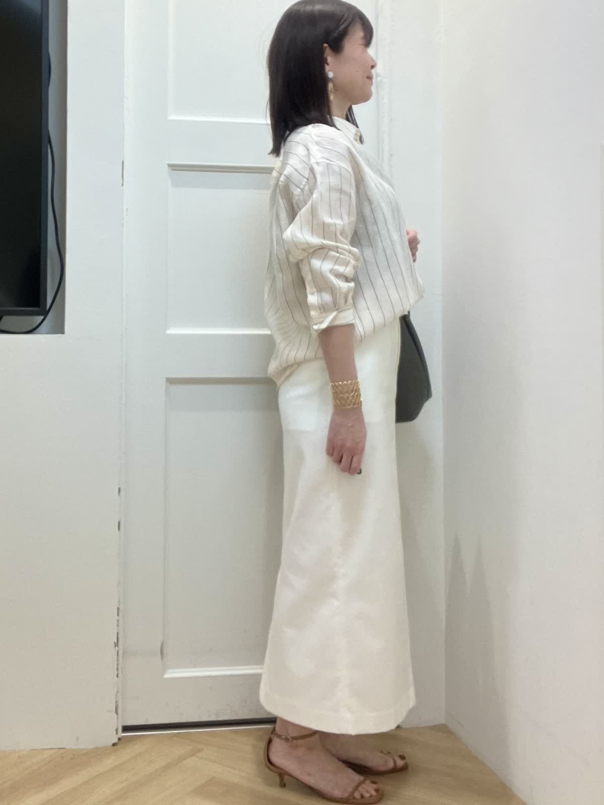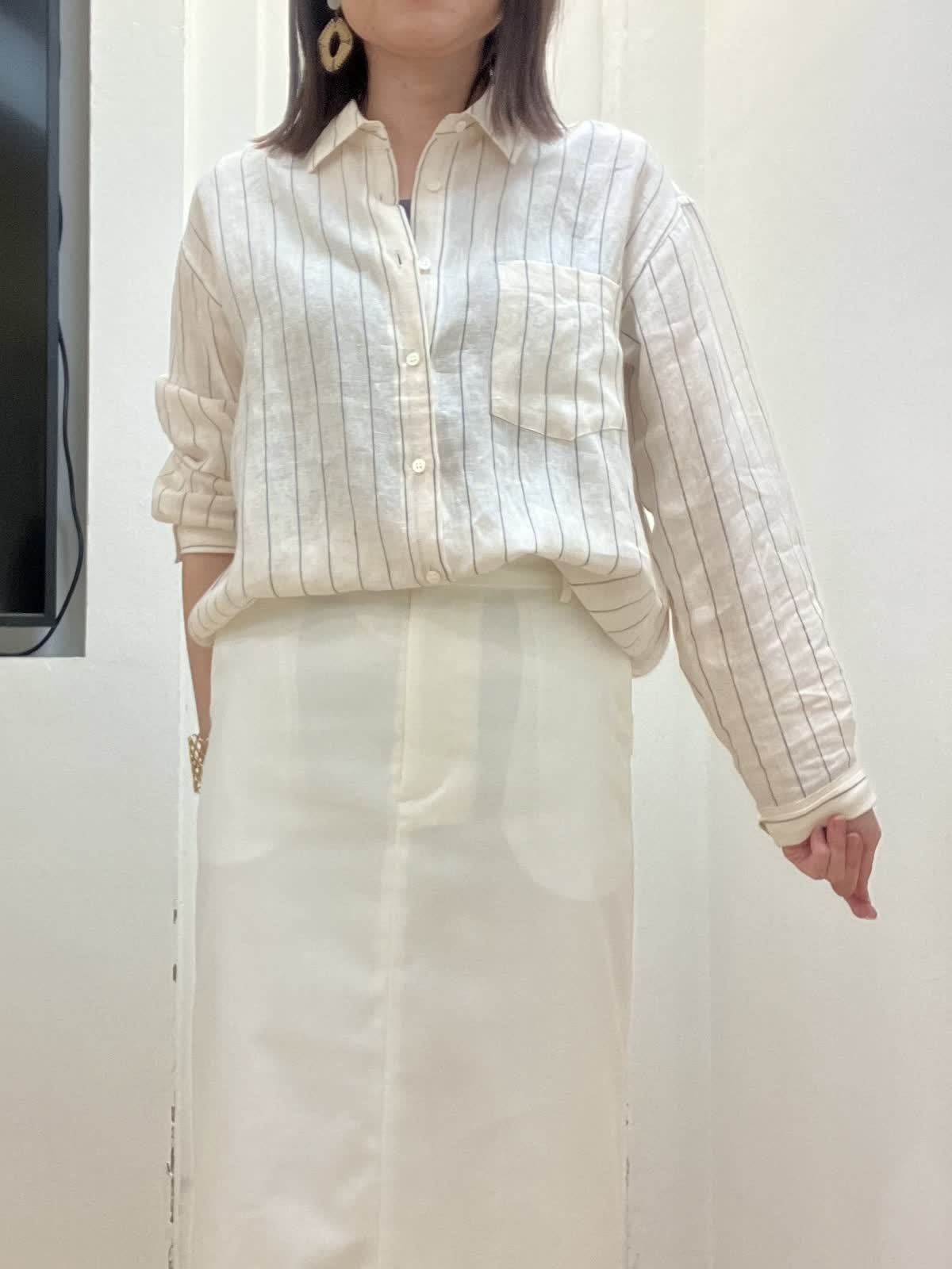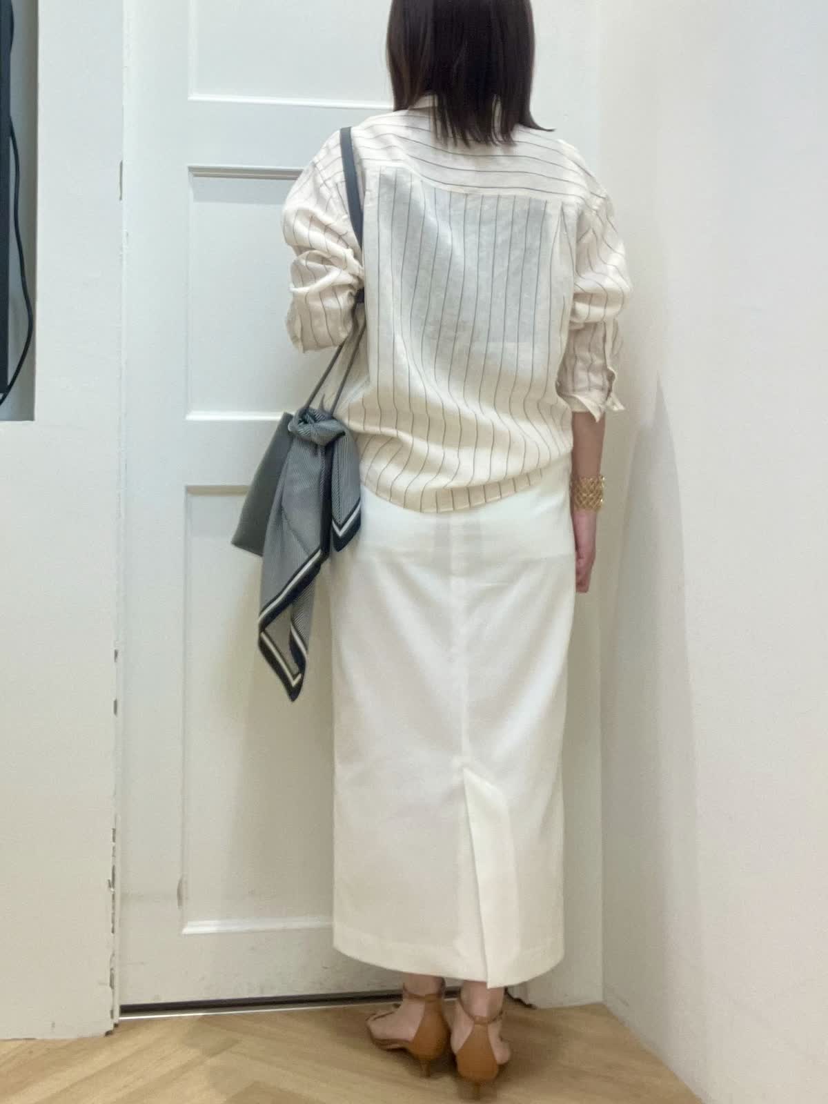 【着用サイズ】全て9号 【着用カラー】ブラウス:ストライプ スカート:オフホワイト 初夏のワントーンスタイル 毎年大好評のリネンシャツにストライプ柄が登場!オフホワイト×チャコールで大人めカラー。昨年よりも着丈が短めで、インしなくてもバランスが取りやすいです。 シンプルなタイトスカートは着回し力抜群! 綿麻混なので夏場まで着回せます。スニーカー合わせも素敵です。