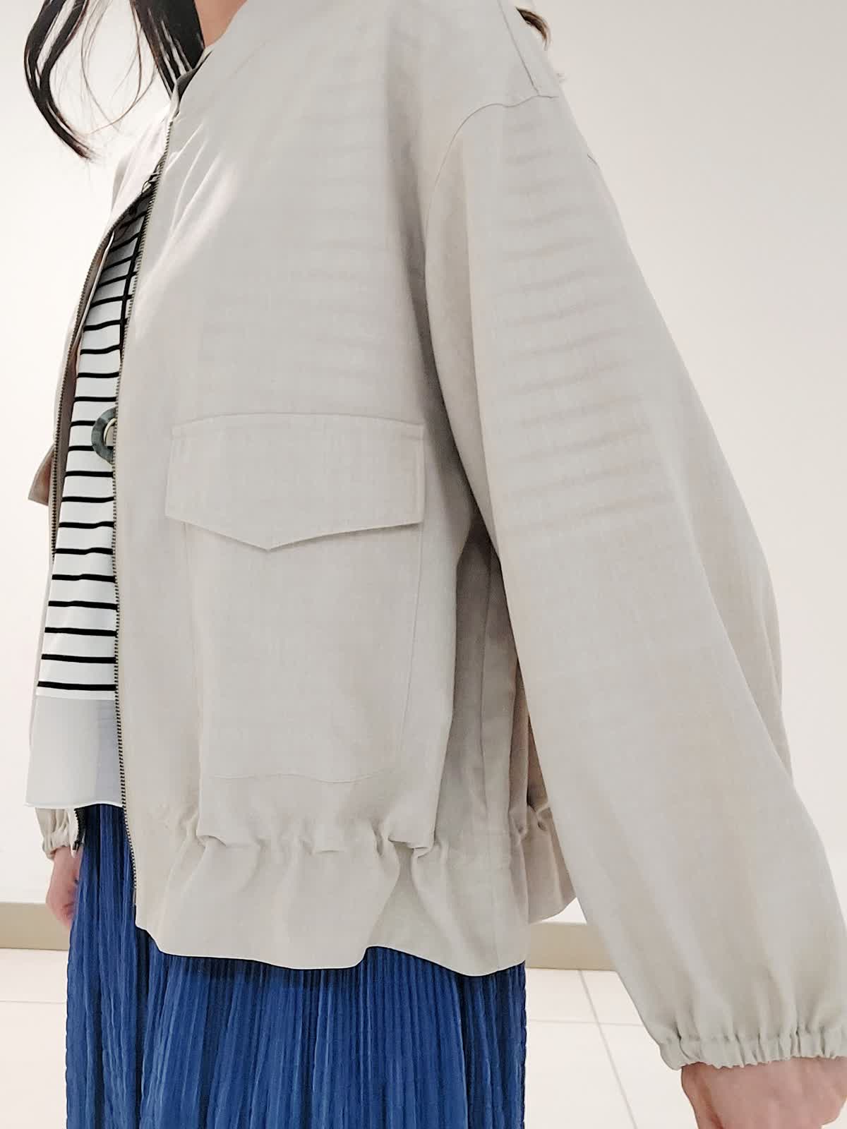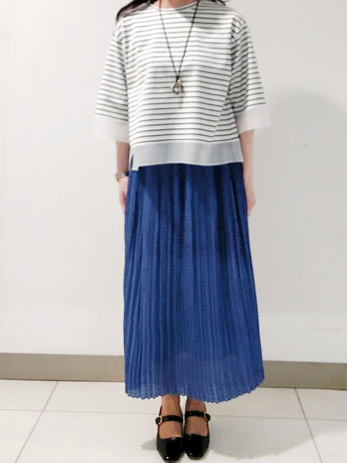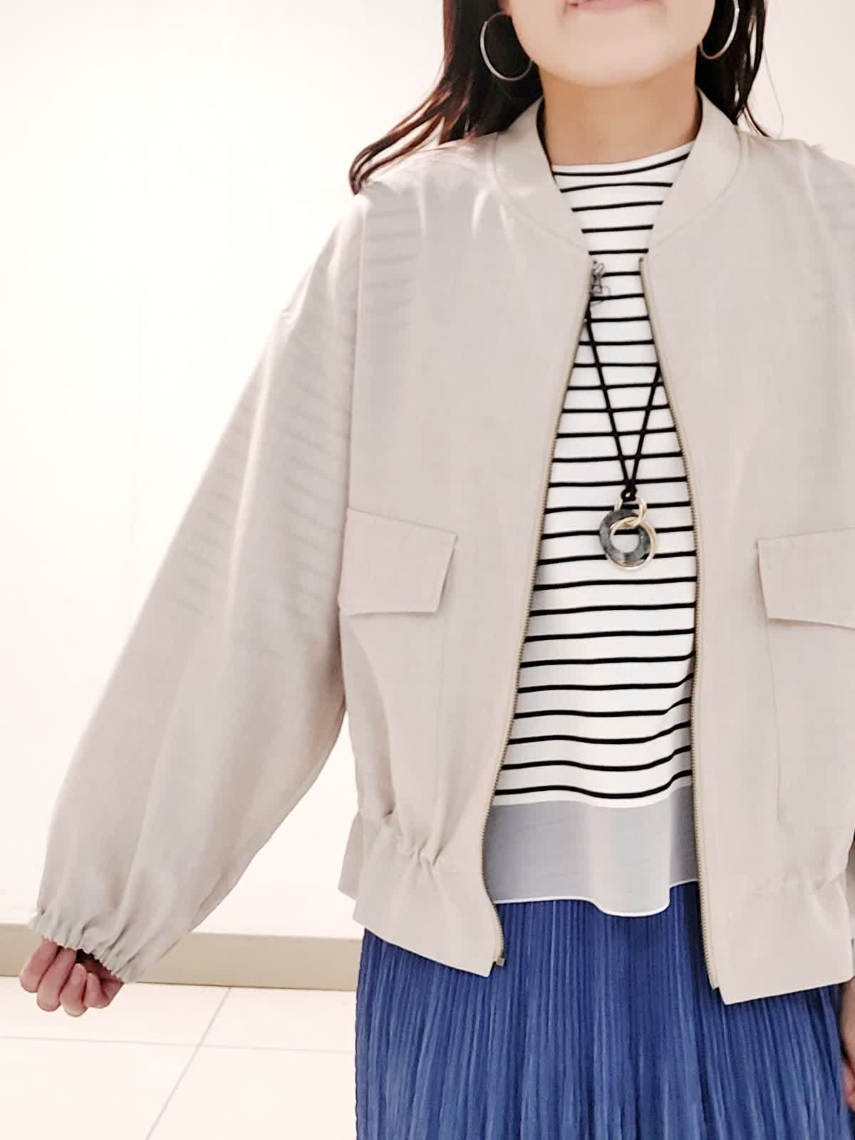 【着用サイズ】ブルゾン:フリー カットソー:フリー スカート:9号 清凉感のあるリネンライクなポリエステル素材を使用したジップアップブルゾン。シワになりにくい特性を活かし、裾や袖口にギャザーデサインを取り入れ立体感を出しさっと羽織っても様になるデザインです。袖口と裾に施されたオーガンジーのシアー素材がポイントのカットソー。高級綿のスーピマコットンをハイゲージで編み上げたポンチ素材です。上品な光沢と高いストレッチ性で着心地も抜群です。広がり過ぎないシルエットのギャザースカート。プリーツをかけたような表情と動くたびに揺れる女性らしいヘムラインがポイントです。