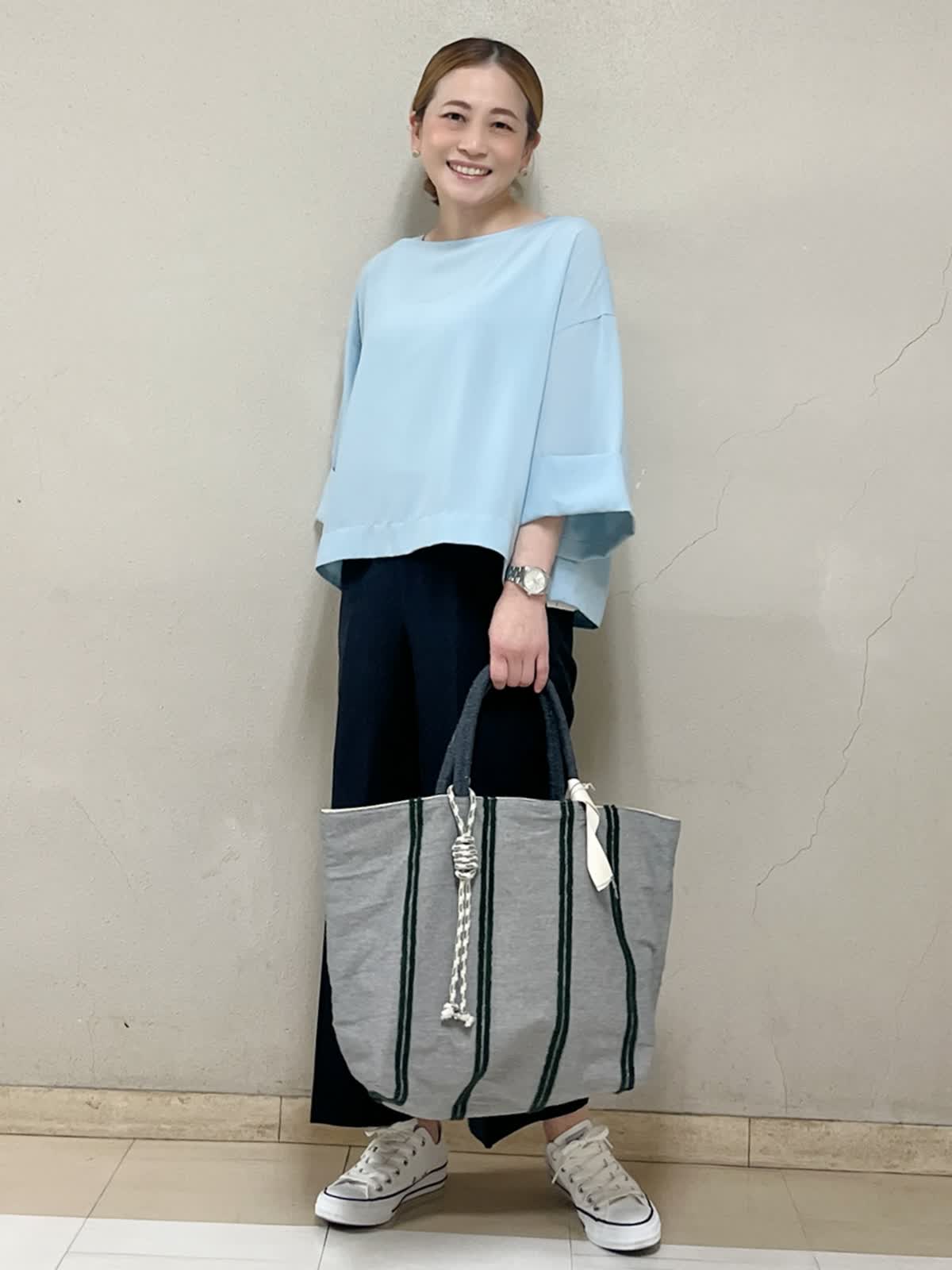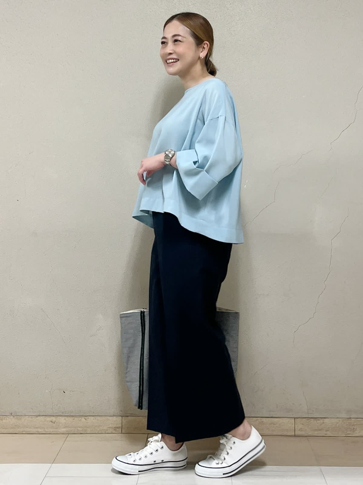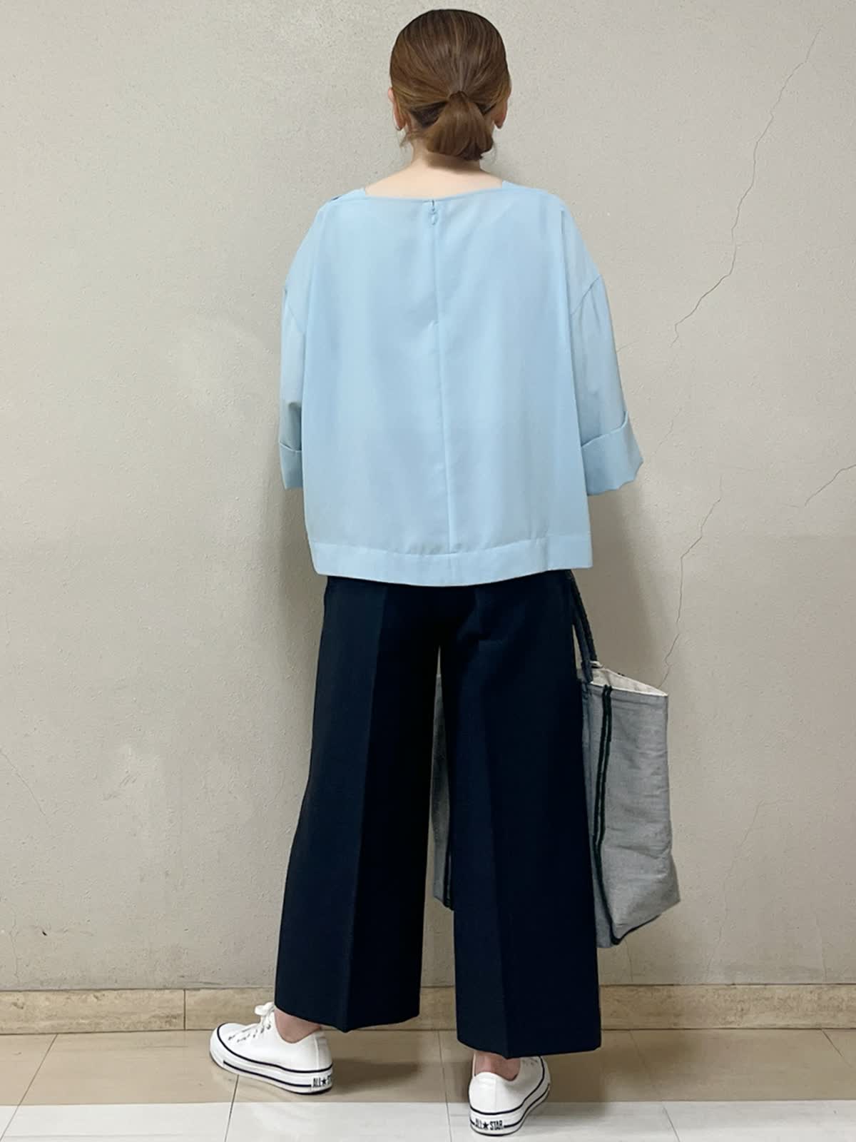 爽やかなサックスが主役の大人のリラックスお出かけコーディネートです。ルーズなシルエットで仕上げたプルオーバーブラウスです。七分袖で軽やかさもありつつマチ付きのボートネックでインナーを気にせず着れます。ポリエステル素材でシワになりにくく、動くたびに揺れるヘムラインがきれいです。パンツは程良いワイドシルエットです。