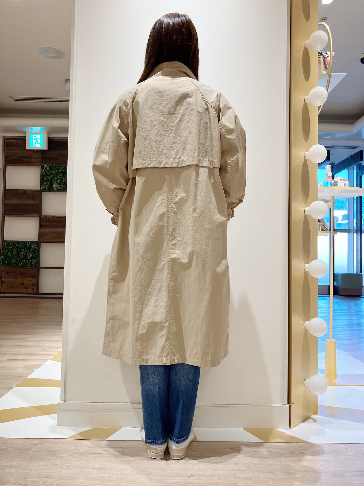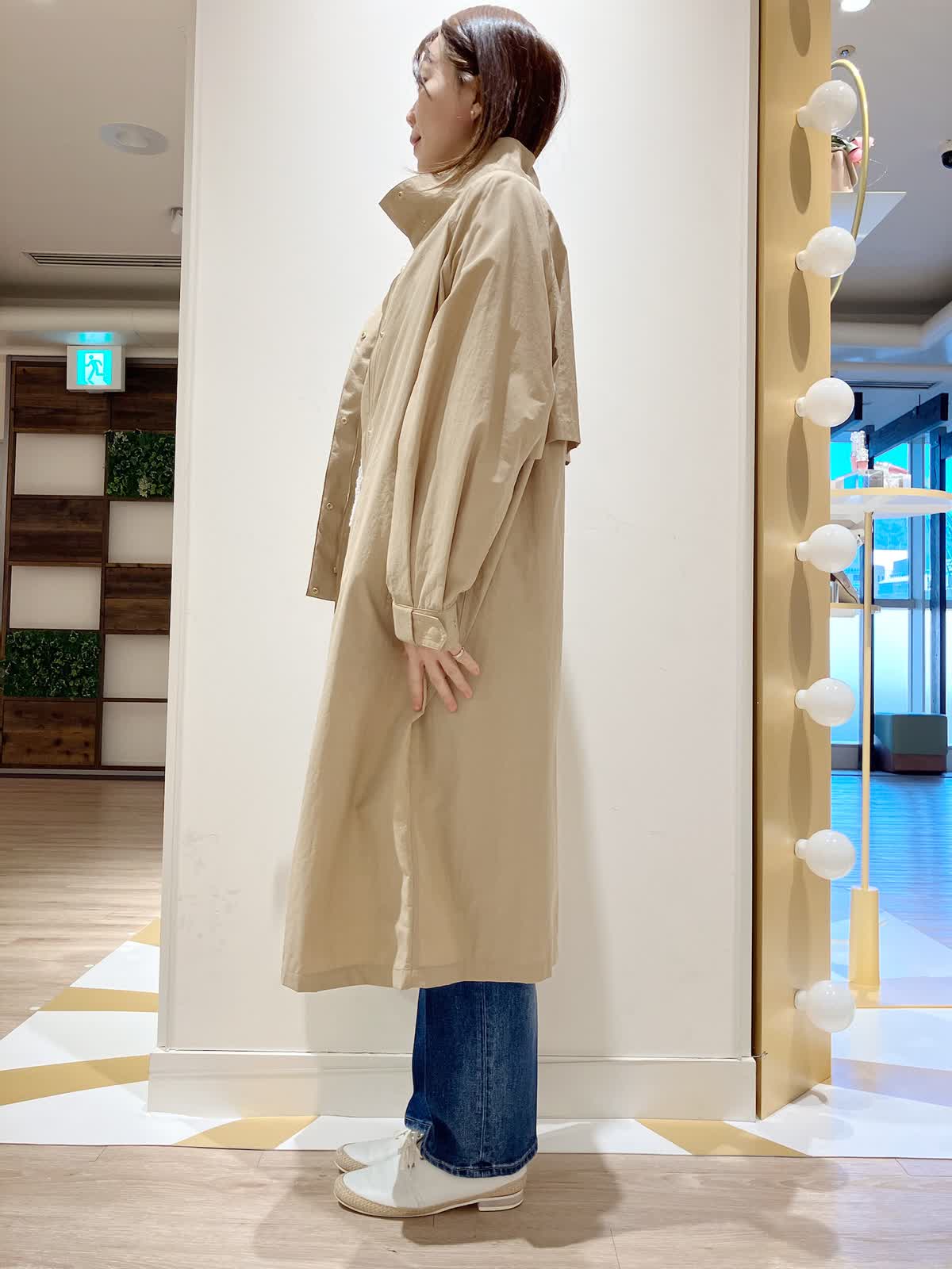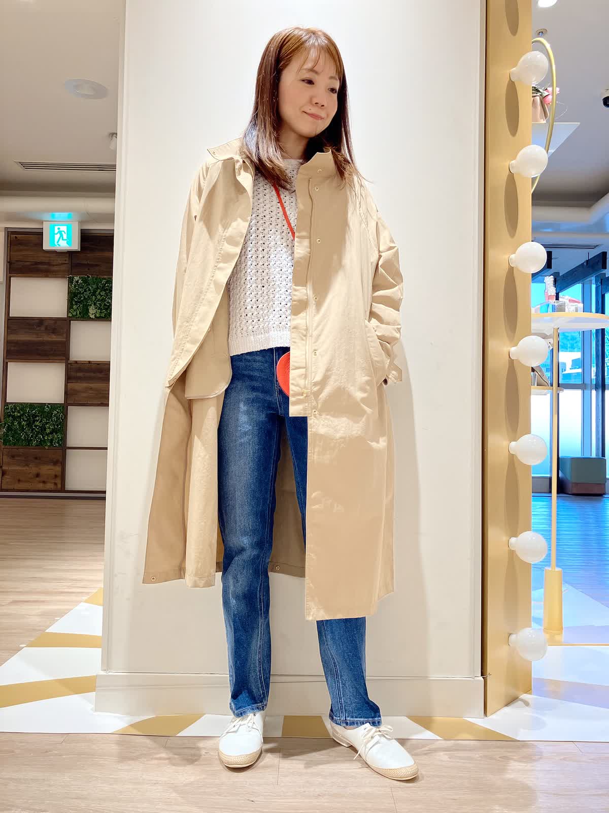 【着用サイズ】コート:9号 ニット:9号 パンツ:7号 【着用カラー】コート:キャメル ニット:オフホワイト パンツ:インディゴ コーディネートのテーマは行楽スタイリングです。 すっきりシルエットのコートは、ナイロン素材でシワになりにくく、軽く撥水もあるので、アクティブなシーンにもぴったり。着丈も長すぎず、小柄な方でもバランスよく着こなせます。行楽などのお供にぜひおすすめしたいアイテムです。