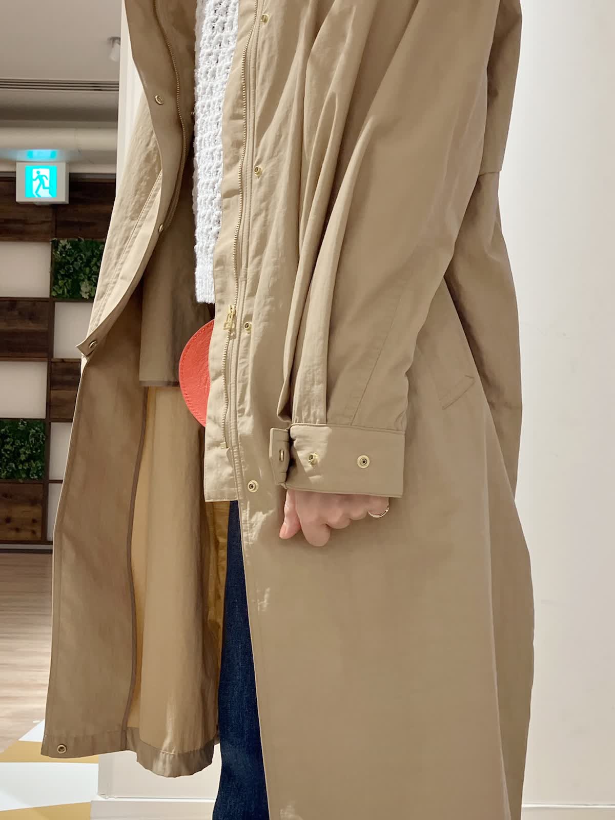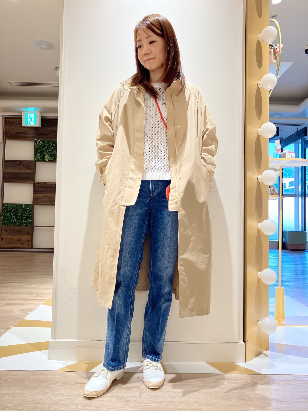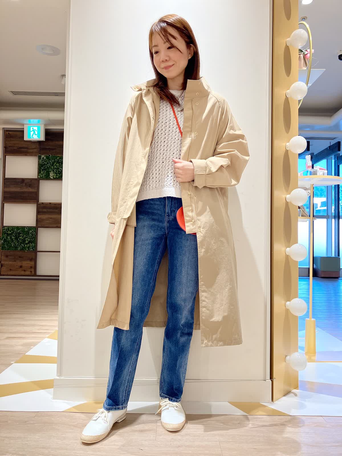 【着用サイズ】コート:9号 ニット:9号 パンツ:7号 【着用カラー】コート:キャメル ニット:オフホワイト パンツ:インディゴ コーディネートのテーマは行楽スタイリングです。 すっきりシルエットのコートは、ナイロン素材でシワになりにくく、軽く撥水もあるので、アクティブなシーンにもぴったり。着丈も長すぎず、小柄な方でもバランスよく着こなせます。行楽などのお供にぜひおすすめしたいアイテムです。